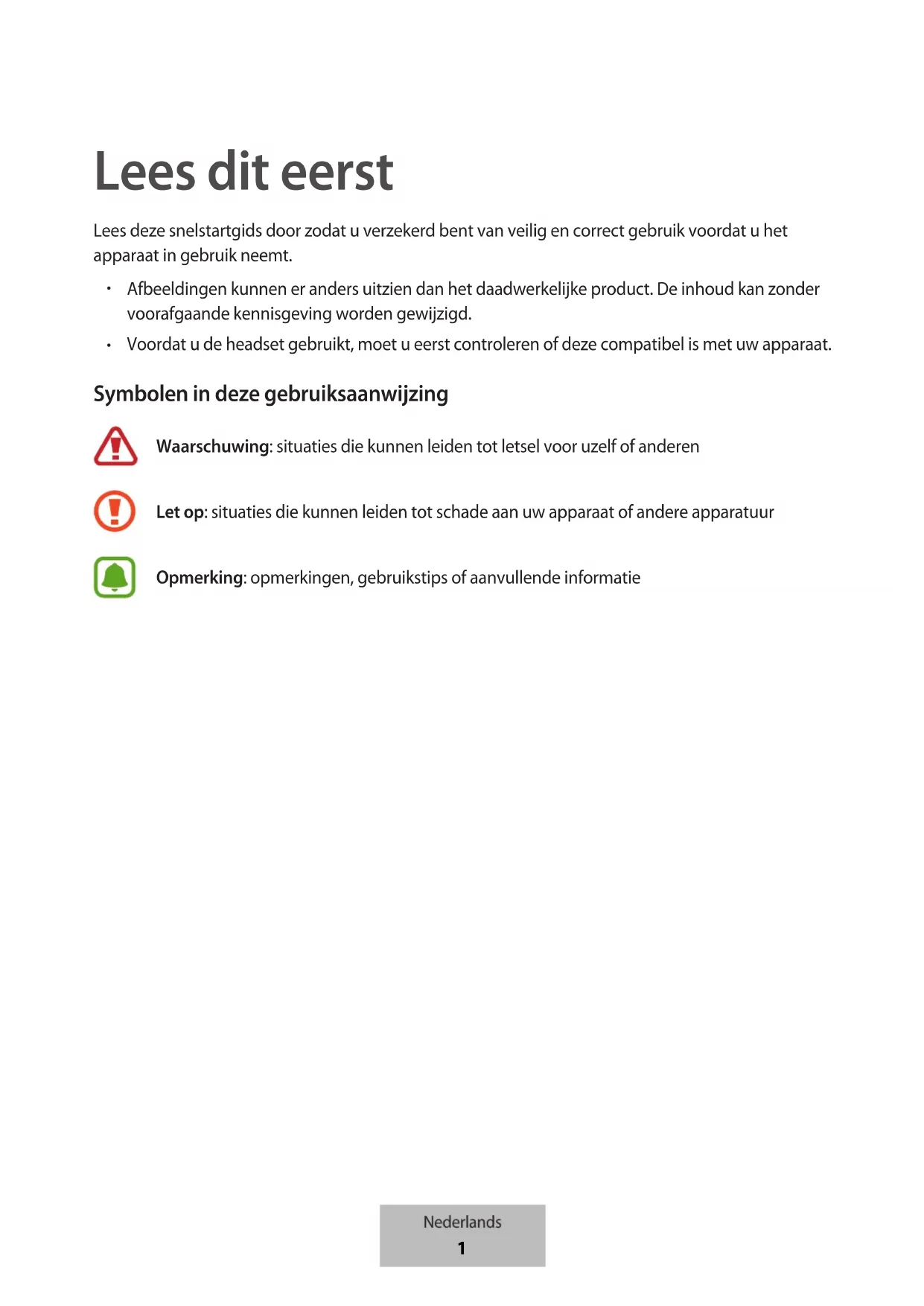Voordat u de headset gebruikt, moet u eerst controleren of deze compatibel is met uw apparaat. Symbolen in deze gebruiksaanwijzing Waarschuwing: situaties die kunnen leiden tot letsel voor uzelf of anderen Let op: situaties die kunnen leiden tot schade aan uw apparaat of andere apparatuur Opmerking: opmerkingen, gebruikstips of aanvullende informatie Nederlands
