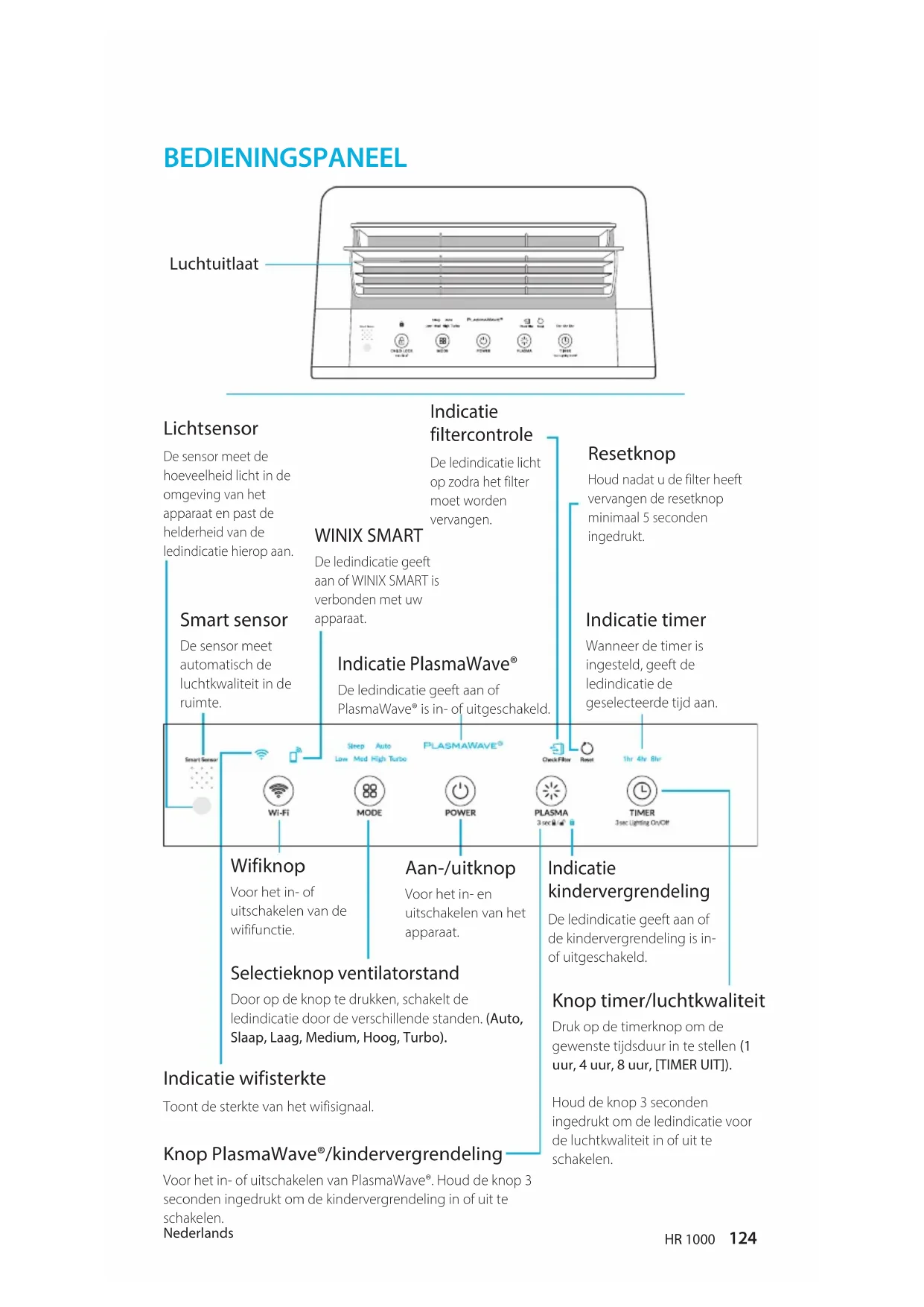 Nederlands HR 1000 Lichtsensor De sensor meet de hoeveelheid licht in de omgeving van het apparaat en past de helderheid van de ledindicatie hierop aan. Indicatie timer Wanneer de timer is ingesteld, geeft de ledindicatie de geselecteerde tijd aan. Indicatie PlasmaWave® De ledindicatie geeft aan of PlasmaWave® is in- of uitgeschakeld. Smart sensor De sensor meet automatisch de luchtkwaliteit in de ruimte. Indicatie kindervergrendeling De ledindicatie geeft aan of de kindervergrendeling is in- of uitgeschakeld. Indicatie wifisterkte Toont de sterkte van het wifisignaal. Selectieknop ventilatorstand Door op de knop te drukken, schakelt de ledindicatie door de verschillende standen. (Auto, Slaap, Laag, Medium, Hoog, Turbo). Aan-/uitknop Voor het in- en uitschakelen van het apparaat. Knop timer/luchtkwaliteit Druk op de timerknop om de gewenste tijdsduur in te stellen (1 uur, 4 uur, 8 uur, [TIMER UIT]). Houd de knop 3 seconden ingedrukt om de ledindicatie voor de luchtkwaliteit in of uit te schakelen. Knop PlasmaWave®/kindervergrendeling Voor het in- of uitschakelen van PlasmaWave®. Houd de knop 3 seconden ingedrukt om de kindervergrendeling in of uit te schakelen. Indicatie filtercontrole De ledindicatie licht op zodra het filter moet worden vervangen. Resetknop Houd nadat u de filter heeft vervangen de resetknop minimaal 5 seconden ingedrukt. BEDIENINGSPANEEL Wifiknop Voor het in- of uitschakelen van de wififunctie. WINIX SMART De ledindicatie geeft aan of WINIX SMART is verbonden met uw apparaat. LuchtuitlaatIngebruikname | Installatie Nederlands HR 1000 WAARSCHUWING Volg deze instructies op om het risico op ernstig of dodelijk letsel en het risico op schade aan het apparaat te beperken.