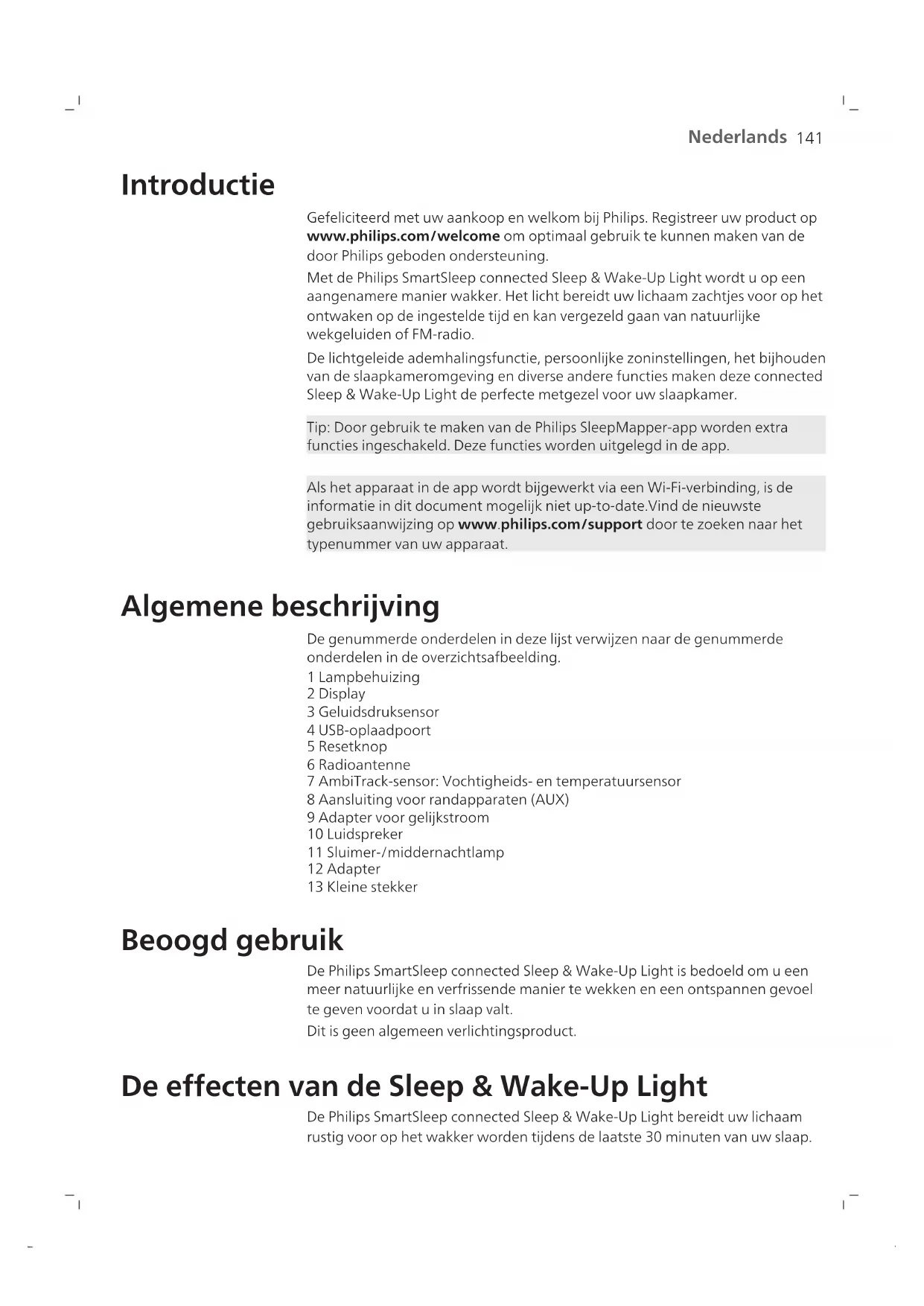 Nederlands Inhoud Introductie _______________________________________________________________________________ 141 Algemene beschrijving_____________________________________________________________________ 141 Beoogd gebruik ___________________________________________________________________________ 141 De effecten van de Sleep & Wake-Up Light ___________________________________________________ 141 Belangrijke veiligheidsinformatie ____________________________________________________________ 142 Veiligheid en naleving van richtlijnen ________________________________________________________ 144 Elektromagnetische velden (EMV) ___________________________________________________________ 144 Interactieve menupictogrammen____________________________________________________________ 144 Uw apparaat aansluiten op Wi-Fi ____________________________________________________________ 145 Navigeren in het menu_____________________________________________________________________ 146 Wekprofielen instellen _____________________________________________________________________ 147 Tijd + alarm back-up _______________________________________________________________________ 148 Sluimeren ________________________________________________________________________________ 149 Het alarm uitzetten ________________________________________________________________________ 149 Het apparaat als nachtlampje gebruiken _____________________________________________________ 149 Middernachtlamp _________________________________________________________________________ 150 Instellingen_______________________________________________________________________________ 150 Naar muziek luisteren______________________________________________________________________ 151 Ontspanningsprogramma's_________________________________________________________________ 152 Zonsondergangsimulatie ___________________________________________________________________ 153 RelaxBreathe _____________________________________________________________________________ 153 Bedtijdfunctie_____________________________________________________________________________ 155 Uw mobiele telefoon opladen ______________________________________________________________ 155 Schoonmaken en opbergen ________________________________________________________________ 155 Recyclen _________________________________________________________________________________ 155 Garantie en ondersteuning _________________________________________________________________ 156 Problemen oplossen _______________________________________________________________________ 156 Specificaties ______________________________________________________________________________ 160 Open-source software en software van derden________________________________________________ 161141 Nederlands Introductie Gefeliciteerd met uw aankoop en welkom bij Philips. Registreer uw product op www.philips.com/welcome om optimaal gebruik te kunnen maken van de door Philips geboden ondersteuning. Met de Philips SmartSleep connected Sleep & Wake-Up Light wordt u op een aangenamere manier wakker. Het licht bereidt uw lichaam zachtjes voor op het ontwaken op de ingestelde tijd en kan vergezeld gaan van natuurlijke wekgeluiden of FM-radio. De lichtgeleide ademhalingsfunctie, persoonlijke zoninstellingen, het bijhouden van de slaapkameromgeving en diverse andere functies maken deze connected Sleep & Wake-Up Light de perfecte metgezel voor uw slaapkamer. Tip: Door gebruik te maken van de Philips SleepMapper-app worden extra functies ingeschakeld. Deze functies worden uitgelegd in de app. Als het apparaat in de app wordt bijgewerkt via een Wi-Fi-verbinding, is de informatie in dit document mogelijk niet up-to-date.Vind de nieuwste gebruiksaanwijzing op www.philips.com/support door te zoeken naar het typenummer van uw apparaat. Algemene beschrijving De genummerde onderdelen in deze lijst verwijzen naar de genummerde onderdelen in de overzichtsafbeelding. 1 Lampbehuizing 2 Display 3 Geluidsdruksensor 4 USB-oplaadpoort 5 Resetknop 6 Radioantenne 7 AmbiTrack-sensor: Vochtigheids- en temperatuursensor 8 Aansluiting voor randapparaten (AUX) 9 Adapter voor gelijkstroom 10 Luidspreker 11 Sluimer-/middernachtlamp 12 Adapter 13 Kleine stekker Beoogd gebruik De Philips SmartSleep connected Sleep & Wake-Up Light is bedoeld om u een meer natuurlijke en verfrissende manier te wekken en een ontspannen gevoel te geven voordat u in slaap valt. Dit is geen algemeen verlichtingsproduct. De effecten van de Sleep & Wake-Up Light De Philips SmartSleep connected Sleep & Wake-Up Light bereidt uw lichaam rustig voor op het wakker worden tijdens de laatste 30 minuten van uw slaap.142 Nederlands Uw ogen zijn in de vroege ochtend gevoeliger voor licht dan wanneer u wakker bent. In deze periode wordt uw lichaam met een lage lichtintensiteit die een natuurlijke zonsopkomst nabootst, gestimuleerd om wakker en actief te worden. Mensen die het apparaat gebruiken, worden makkelijker wakker, hebben 's ochtends een beter humeur en voelen zich energieker. Omdat de gevoeligheid voor licht voor iedereen anders is, kunt u de lichtintensiteit van uw apparaat instellen op een niveau dat past bij uw lichtgevoeligheid, zodat u optimaal aan de dag begint. Om de effecten van de verbonden Sleep & Wake-Up Light volledig te ervaren, plaatst u het apparaat op ongeveer 40 tot 50 cm van uw hoofd, op het vlakke stabiele oppervlak van uw nachtkastje. Ga voor meer informatie over de connected Sleep & Wake-Up Light naar www.philips.com. Belangrijke veiligheidsinformatie Lees deze belangrijke informatie zorgvuldig door voordat u het apparaat gaat gebruiken en bewaar de informatie om de aanwijzingen later opnieuw te kunnen raadplegen. Gevaar
