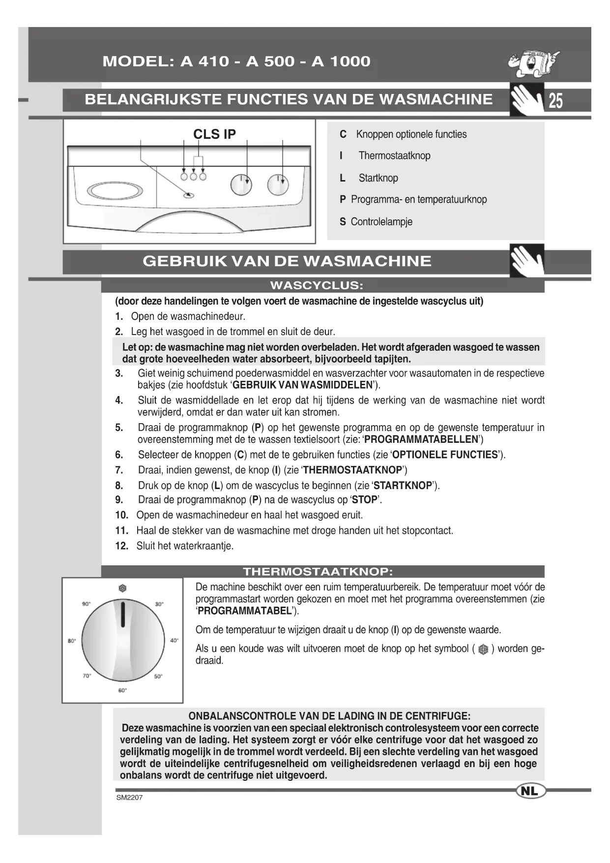 C Knoppen optionele functies I Thermostaatknop L Startknop P Programma- en temperatuurknop S Controlelampje CLS IP