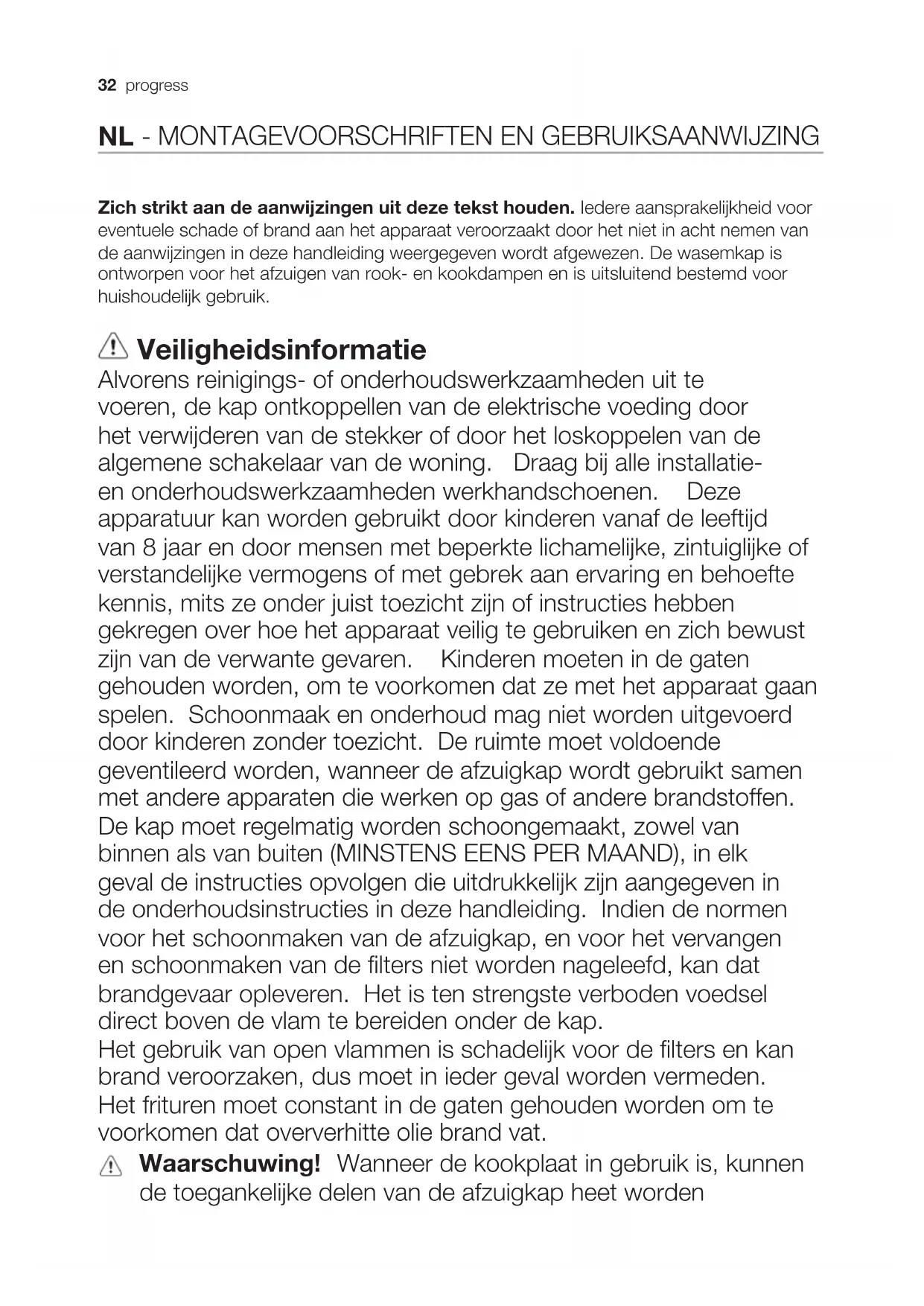 Zich strikt aan de aanwijzingen uit deze tekst houden. Iedere aansprakelijkheid voor eventuele schade of brand aan het apparaat veroorzaakt door het niet in acht nemen van de aanwijzingen in deze handleiding weergegeven wordt afgewezen. De wasemkap is ontworpen voor het afzuigen van rook en kookdampen en is uitsluitend bestemd voor huishoudelijk gebruik. Veiligheidsinformatie Alvorens reinigings of onderhoudswerkzaamheden uit te voeren, de kap ontkoppellen van de elektrische voeding door het verwijderen van de stekker of door het loskoppelen van de algemene schakelaar van de woning. Draag bij alle installatie en onderhoudswerkzaamheden werkhandschoenen. Deze apparatuur kan worden gebruikt door kinderen vanaf de leeftijd van 8 jaar en door mensen met beperkte lichamelijke, zintuiglijke of verstandelijke vermogens of met gebrek aan ervaring en behoefte kennis, mits ze onder juist toezicht zijn of instructies hebben gekregen over hoe het apparaat veilig te gebruiken en zich bewust zijn van de verwante gevaren. Kinderen moeten in de gaten gehouden worden, om te voorkomen dat ze met het apparaat gaan spelen. Schoonmaak en onderhoud mag niet worden uitgevoerd door kinderen zonder toezicht. De ruimte moet voldoende geventileerd worden, wanneer de afzuigkap wordt gebruikt samen met andere apparaten die werken op gas of andere brandstoffen. De kap moet regelmatig worden schoongemaakt, zowel van binnen als van buiten (MINSTENS EENS PER MAAND), in elk geval de instructies opvolgen die uitdrukkelijk zijn aangegeven in de onderhoudsinstructies in deze handleiding. Indien de normen voor het schoonmaken van de afzuigkap, en voor het vervangen en schoonmaken van de filters niet worden nageleefd, kan dat brandgevaar opleveren. Het is ten strengste verboden voedsel direct boven de vlam te bereiden onder de kap. Het gebruik van open vlammen is schadelijk voor de filters en kan brand veroorzaken, dus moet in ieder geval worden vermeden. Het frituren moet constant in de gaten gehouden worden om te voorkomen dat oververhitte olie brand vat. Waarschuwing! Wanneer de kookplaat in gebruik is, kunnen de toegankelijke delen van de afzuigkap heet wordenprogress 33 Veiligheidsinstructies Voor vervanging van de lamp alleen het type lamp gebruiken dat aangegeven is in het deel ‘onderhoud / vervangen van de lamp’ in deze handleiding. Waarschuwing! Het apparaat niet aansluiten op het elektriciteitsnet voordat de installatie volledig is voltooid. Voor de technische normen en de veiligheidsnormen die moeten worden nagekomen in verband met de afvoer van rookgassen moet u zich strikt houden aan de bepalingen van de regelgeving van de lokale autoriteiten. De afgevoerde lucht mag niet worden weggeleid door een kanaal dat ook gebruikt wordt voor de afvoer van rook die geproduceerd wordt door apparaten op gas of andere brandstoffen. De kap mag niet zonder correct gemonteerde lampjes worden gebruikt of achtergelaten, omdat er dan gevaar voor een elektrische schok bestaat. Gebruik de afzuigkap nooit zonder correct gemonteerd rooster! De afzuigkap mag NOOIT worden gebruikt als plek om spullen op te leggen, tenzij uitdrukkelijk aangegeven. Gebruik alleen de bevestigingsschoeven die bij het product worden geleverd voor de installatie, of, indien niet meegeleverd, koop het juiste type schroeven. Gebruik de juiste lengte voor de schroeven die zijn aangegeven in de Installatiehandleiding. In geval van twijfel, raadpleeg een erkend servicecentrum of soortgelijk gekwalificeerd personeel. LET OP! Wanneer schroeven en bevestigingsmiddelen niet geinstalleerd worden zoals aangegeven in deze instructies kan dit elektrische gevaren tot gevolg hebben. Milieuberscherming Recycle de materialen met het symbool . Gooi de verpakking in een geschikte verzamelcontainer om het te recyclen. Help om het milieu en de volksgezondheid te beschermen en recycle het afval van elektrische en elektronische apparaten. Gooi apparaten gemarkeerd met het symbool niet weg met het huishoudelijk afval. Breng het product naar het milieustation bij u in de buurt of neem contact op met de gemeente. Het gebruik De kap is vervaardigd voor gebruik in de afzuigversie met afvoer naar buiten , of de filtrerende versie, met luchtcirculatie . Het installeren De netspanning moet corresponderen met de spanning die vermeld wordt op het etiket met eigenschappen, aan de binnenkant van de wasemkap. Als de wasemkap een stekker heeft, moet deze in een stopcontact worden gestoken dat voldoet aan de geldende voorschriften op een, ook na de installatie, goed bereikbare plaats. Heeft de kap geen stekker (rechtstreekse verbinding met het net) of is deze, ook na de installatie, niet goed te bereiken, dan moet er een tweepolige schakelaar worden geplaatst die de volledige ontkoppeling van het net garandeert in het geval van een overspanning van klasse III, in overeenstemming met de installatie normen. Alvorens de wasemkap weer aan het voedingsnet aan te sluiten controleer of deze goed functioneert, controleer altijd of de voedingskabel goed gemonteerd is.34 progress De minimum afstand tussen het kookvlak van het fornuis en het laagste deel van de afzuigkap mag niet onder de 45cm liggen, in geval van een elektrisch fornuis en 55cm, in geval van een gas of gemengd fornuis. Indien in de installatieaanwijzing van het gaskooktoestel een grotere afstand wordt aangegeven moet hiermee rekening worden gehouden. Onderhoud Attentie! Koppel, voor ieder onderhoud, eerst de wasemkap van het elektriciteitsnet af door de stekker weg te trekken of door de hoofdschakelaar van de woning uit te schakelen. De kap moet regelmatig schoon gemaakt worden, zowel binnen als buiten (tenminste met dezelfde regelmaat waarmee de vetfilters gereinigd worden). Gebruik voor het reinigen een doek die u vochtig maakt met een beetje neutraal vloeibaar reinigingsmiddel. Gebruik geen producten die schuurmiddelen bevatten. GEEN ALCOHOL GEBRUIKEN! Attentie! Als u deze aanwijzingen m.b.t. reiniging van het apparaat en vervanging re