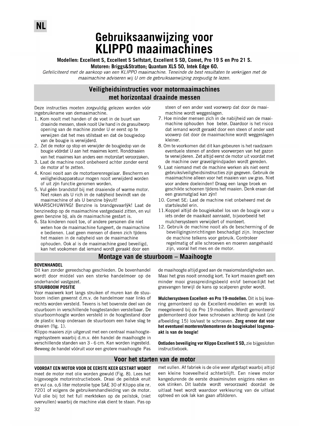 Gebruiksaanwijzing voor KLIPPO maaimachines Modellen: Excellent S, Excellent S Selfstart, Excellent S SD, Comet, Pro 19 S en Pro 21 S. Motoren: Briggs&Stratton; Quantum XLS 50, Intek Edge 60. Gefeliciteerd met de aankoop van een KLIPPO maaimachine. Teneinde de best resultaten te verkrijgen met demaaimachine adviseren wij U om de gebruiksaanwijzing zorgvudig te lezen.Deze instructies moeten zorgvuldig gelezen worden vóóringebruikname van demaaimachine.1. Kom noolt met handen of de voet in de buurt vandraainde messen, steek nooit Uw hand in de grasuitworpopening van de machine zonder U er eerst op teverwijzen dat het mes stilstaat en dat de bougiedopvan de bougie is verwijderd. Zet de motor op stop en verwijder de bougiedop van debougie vóórdat U aan het maaimes komt. Ronddraaienvan het maaimes kan anders een motorstart veroorzaken 3. Laat de machine nooit onbeheerd achter zonder eerstde motor af te zetten.4. Knoei nooit aan de motortoerenregelaar. Bescherm enveiligheidsapparatuur mogen nooit verwijderd wordenof uit zÿn functie genomen worden.5. Vul géén brandstof bij met draaiende of warme motor.Niet roken als U rich in de nabÿheid bevindt van demaaimachine of als U benzine bÿvult!WAARSCHUWING! Benzine is brandgevaarlÿk! Laat debenzinedop op de maaimachine vastgedaaid zitten, en vulgeen benzine bÿ, als de maaimachine gestart is.6. Sta kinderen nooit toe, of andere personen die nietweten hoe de maaimachine fungeert, de maaimachinee bedienen. Laat geen mensen of dieren zich tÿdenshet maaien in de nabyheid van de maaimachineophouden. Ook al is de maaimachine goed beveiligd,kan het vookomen dat iemand wordt geraakt door een Voor het starten van de motor steen of een ander vast voorwerp dat door de maai-machine wordt weggeslagen.7. Hoe minder mensen zich in de nabijheid van de maai-machine ophouden hoe beter. Daardoor is het risicodat iemand wordt geraakt door een steen of ander vastvoowerp dat door de maaimachine wordt weggeslagenkleiner.8. Om te voorkomen dat dit kan gebeuren is het raadzaameventuele stenen of andere voorwerpen van het gazonte verwijderen. Zet altijd eerst de motor uit voordat metde machine over gravel/grindpaden wordt gereden.9. Laat niemand met de machine werken als niet eerstgebruiks/veiligheidsinstructies zijn gegeven. Gebruik demaaimachine alleen voor het maaien van uw gras. Nietvoor andere doeleinden! Draag een lange broek engeschikte schoenen tÿdens het maaien. Denk eraan dateen grasmatglad kan zÿn!10. Comet SE: Laat de machine niet onbeheerd met destartsleutel erin.11.Koppel altijd de bougiekabel los van de bougie voor uiets onder de maaikast aanraakt, bijvoorbeeld hetmulchersysteem verwijdert of monteert.12. Gebruik de machine nooit als de bescherming of debeveiligingsinrichtingen beschadigd zijn. Inspecteerde machine telkens voor gebruik. Controleerregelmatig of alle schroeven en moeren aangehaaldzijn, vooral het mes en de motor.BOVENHANDELDit kan zonder gereedschap geschieden. De bovenhandelwordt door middel van een sterke handelmoer op deonderhandel vastgezet.STUURBOOM POSITIEVoor maaiwerk kort langs struiken of muren kan de stuu-boom indien gewenst d.m.v. de handelmoer naar links ofrechts worden versteld. Tevens is het bovenste deel van destuurboom in verschillende hoogtestanden verstelbaar. Destuurboomhoogte worden versteld in de hoogtestand doorde plastic knop onderaan de stuurboom een halve slag tedraaien (fig. 1).Klippo maaiers zijn uitgerust met een centraal maaihoogte-regelsysteem waarbij d.m.v. één handel de maaihoogte inverschillende standen van 3 - 6 cm. Kan worden ingesteld.Beweeg de handel vóóruit voor een grotere maaihoogte Pasde maaihoogte altijd goed aan de maaiomstandigheden aan.Maai het gras nooit onnodig kort. Te kort maaien geeft eenminder mooi grasspreidingsbeeld en/of bemoeilijkt hetgrasvangen terwijl de kans op scalperen groter wordt. Mulchersysteem Excellent- en Pro 19-modellen. Dit is bij leve- ring gemonteerd op de Excellent-modellen en wordt losmeegeleverd bij de Pro 19-modellen. Wordt gemonteerd/gedemonteerd door twee schroeven achterop de kast (zieafbeelding 15) los/vast te schroeven. Zorg ervoor dat voorhet eventueel monteren/demonteren de bougiekabel losgema-akt is van de bougie!Ontladen beveiliging vor Klippo Excellent S SD, zie bijgesloteninstructieboek.VOORDAT EEN MOTOR VOOR DE EERSTE KEER GESTART WORDTmeet de motor met olie worden gewuld (Fig. 8). Lees hetbijgevoegde motorinstructieboek. Draai de peilstok eruiten vul ca. o,6 liter motorolie type SAE 30 of Klippo olie nr.7201 of volgens de gebruikershandleiding van de motor.Vul olie bij tot het full merkteken op de peilstok, (nietovervullen) waarbij de machine vlak dient te staan. Pas op Montage van de stuurboom – Maaihoogte Veiligheidsinstructies voor motormaaimachines met horizontaal draainde messen met vullen. Af fabriek is de olie weer afgetapt waarbij altijdeen kleine hoeveelheid achterblijft. Een niewe motorkangedurende de eerste draaiminuten enigzins roken enook stinken. Dit laatste wordt veroorzaakt doordat deuitlaat heet wordt waardoor verkleuring van de uitlaatoptreed en ook lak kan gaan afblderen.33 Starten van de motor Algemene opmerkingen draaiuren de olie te verversen (vervangen) en dit daarna iedere vijfentwintig draaiuren te herhalen. BENZINE Gebruik loodvrije 95 oktaan benzine. Zet de motor af vóórdat U benzine vult. Vul de tank niet geheel tot aan de rand maar tot ca. 6 mm. daaronder. Laat de machine tijdens de winter niet staan met benzine erin. Dit kan in het voorjaar zorgen voor startproblemen.