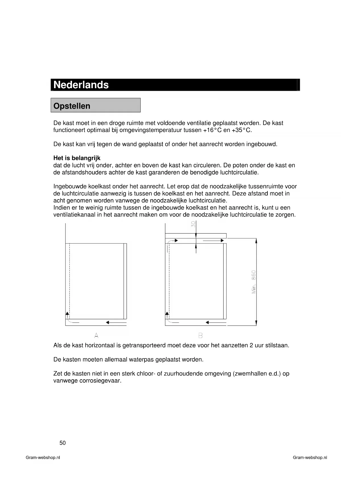 Opstellen De kast moet in een droge ruimte met voldoende ventilatie geplaatst worden. De kast functioneert optimaal bij omgevingstemperatuur tussen +16°C en +35°C. De kast kan vrij tegen de wand geplaatst of onder het aanrecht worden ingebouwd. Het is belangrijk dat de lucht vrij onder, achter en boven de kast kan circuleren. De poten onder de kast en de afstandshouders achter de kast garanderen de benodigde luchtcirculatie. Ingebouwde koelkast onder het aanrecht. Let erop dat de noodzakelijke tussenruimte voor de luchtcirculatie aanwezig is tussen de koelkast en het aanrecht. Deze afstand moet in acht genomen worden vanwege de noodzakelijke luchtcirculatie. Indien er te weinig ruimte tussen de ingebouwde koelkast en het aanrecht is, kunt u een ventilatiekanaal in het aanrecht maken om voor de noodzakelijke luchtcirculatie te zorgen. Als de kast horizontaal is getransporteerd moet deze voor het aanzetten 2 uur stilstaan. De kasten moeten allemaal waterpas geplaatst worden. Zet de kasten niet in een sterk chloor- of zuurhoudende omgeving (zwemhallen e.d.) op vanwege corrosiegevaar. Gram-webshop.nl Gram-webshop.nl51 Belangrijk! Teneinde een optimale luchtcirculatie in de kast te verkrijgen is het aan te bevelen een draadrooster in laagste positie in de kast te monteren. Producten welke op de bodem van de kast worden geplaatst kunnen de luchtcirculatie verstoren.