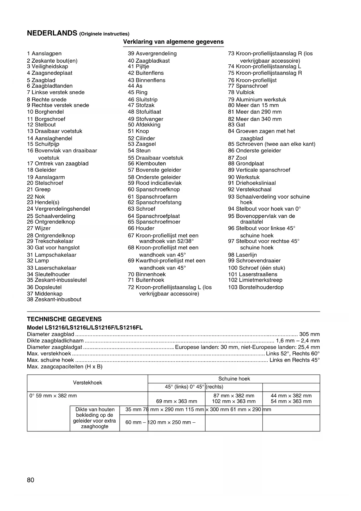 Yasushi Fukaya Amministratore Makita, Jan-Baptist Vinkstraat 2, 3070, Belgio Lame della sega combinata Per eseguire tagli uniformi e precisi su vari materiali. Combinazione Lama generica per eseguire tagli lungo le fibre, tagli di testa e tagli a quartabuono. Tagli di testa Per eseguire tagli di testa più uniformi rispetto alla fibratura. Trancia in modo più pulito rispetto alla fibratura. Tagli di testa di precisione Per tagli puliti di testa rispetto alla fibratura senza carteggio. Lame per sega combinata in materiali non ferrosi Per tagli a quartabuono di alluminio, rame, ottone, tubature e altri materiali non ferrosi.80 NEDERLANDS (Originele instructies) Verklaring van algemene gegevens 1 Aanslagpen 2 Zeskante bout(en) 3 Veiligheidskap 4 Zaagsnedeplaat 5 Zaagblad 6 Zaagbladtanden 7 Linkse verstek snede 8 Rechte snede 9 Rechtse verstek snede 10 Borghendel 11 Borgschroef 12 Stelbout 13 Draaibaar voetstuk 14 Aanslaghendel 15 Schuifpijp 16 Bovenvlak van draaibaar voetstuk 17 Omtrek van zaagblad 18 Geleider 19 Aanslagarm 20 Stelschroef 21 Greep 22 Nok 23 Hendel(s) 24 Vergrendelingshendel 25 Schaalverdeling 26 Ontgrendelknop 27 Wijzer 28 Ontgrendelknop 29 Trekschakelaar 30 Gat voor hangslot 31 Lampschakelaar 32 Lamp 33 Laserschakelaar 34 Sleutelhouder 35 Zeskant-inbussleutel 36 Dopsleutel 37 Middenkap 38 Zeskant-inbusbout 39 Asvergrendeling 40 Zaagbladkast 41 Pijltje 42 Buitenflens 43 Binnenflens 44 As 45 Ring 46 Sluitstrip 47 Stofzak 48 Stofuitlaat 49 Stofvanger 50 Afdekking 51 Knop 52 Cilinder 53 Zaagsel 54 Steun 55 Draaibaar voetstuk 56 Klembouten 57 Bovenste geleider 58 Onderste geleider 59 Rood indicatievlak 60 Spanschroefknop 61 Spanschroefarm 62 Spanschroefstang 63 Schroef 64 Spanschroefplaat 65 Spanschroefmoer 66 Houder 67 Kroon-profiellijst met een wandhoek van 52/38° 68 Kroon-profiellijst met een wandhoek van 45° 69 Kwarthol-profiellijst met een wandhoek van 45° 70 Binnenhoek 71 Buitenhoek 72 Kroon-profiellijstaanslag L (los verkrijgbaar accessoire) 73 Kroon-profiellijstaanslag R (los verkrijgbaar accessoire) 74 Kroon-profiellijstaanslag L 75 Kroon-profiellijstaanslag R 76 Kroon-profiellijst 77 Spanschroef 78 Vulblok 79 Aluminium werkstuk 80 Meer dan 15 mm 81 Meer dan 290 mm 82 Meer dan 340 mm 83 Gat 84 Groeven zagen met het zaagblad 85 Schroeven (twee aan elke kant) 86 Onderste geleider 87 Zool 88 Grondplaat 89 Verticale spanschroef 90 Werkstuk 91 Driehoeksliniaal 92 Verstekschaal 93 Schaalverdeling voor schuine hoek 94 Stelbout voor hoek van 0° 95 Bovenoppervlak van de draaitafel 96 Stelbout voor linkse 45° schuine hoek 97 Stelbout voor rechtse 45° schuine hoek 98 Laserlijn 99 Schroevendraaier 100 Schroef (één stuk) 101 Laserstraallens 102 Limietmerkstreep 103 Borstelhouderdop TECHNISCHE GEGEVENS Model LS1216/LS1216L/LS1216F/LS1216FL Diameter zaagblad .............................................................................................................................................. 305 mm Dikte zaagbladlichaam ......................................................................................................................... 1,6 mm – 2,4 mm Diameter zaagbladgat .......................................................... Europese landen: 30 mm, niet-Europese landen: 25,4 mm Max. verstekhoek ........................................................................................................................... Links 52°, Rechts 60° Max. schuine hoek ........................................................................................................................... Links en Rechts 45° Max. zaagcapaciteiten (H x B) Verstekhoek Schuine hoek 45° (links) 0° 45° (rechts) 0° 59 mm × 382 mm 69 mm × 363 mm 87 mm × 382 mm 102 mm × 363 mm 44 mm × 382 mm 54 mm × 363 mm Dikte van houten bekleding op de geleider voor extra zaaghoogte 35 mm 78 mm × 290 mm 115 mm × 300 mm 61 mm × 290 mm 60 mm – 120 mm × 250 mm –81 Speciale max. zaagdikte Speciale max. zaagbreedte (met gebruik van een grondplaat met een dikte van 38 mm (1-1/2”)) Raadpleeg de BEDIENING voor de zaagprocedure. Toerental onbelast (min