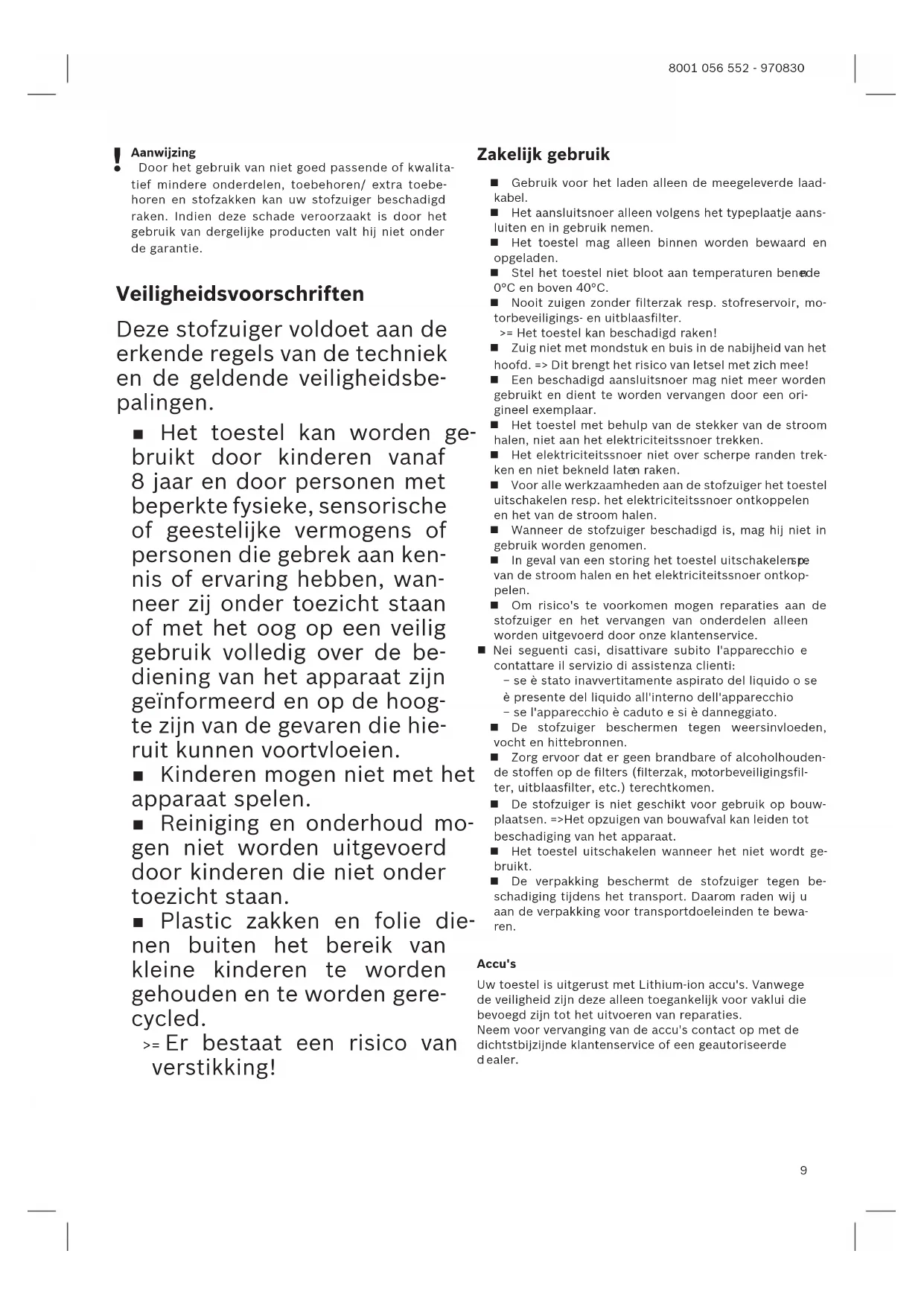 De gebruiksaanwijzing goed bewaren. Wanneer u de stofzuiger doorgeeft aan derden, voeg de gebruiksaanwijzing er dan bij. Juist gebruik Dit apparaat is alleen bestemd voor huishoudelijk ge- bruik en de huiselijke omgeving. Dit apparaat is bes- temd voor gebruik tot op hoogten van maximaal 2.000 meter boven zeeniveau. Om letsel en schade te voorkomen mag de stofzuiger niet worden gebruikt voor: het schoonzuigen van mensen of dieren. het opzuigen van: − substanties die schadelijk voor de gezondheid, heet of gloeiend zijn, of scherpe rande n hebben. − vochtige of vloeibare stoffen − licht ontvlambare of explosieve stoffen en gassen. − as, roest van open haarden en centrale verwar- mingsinstallaties − tonerstof van printers en kopieerapparaten. Onderdelen, toebehoren, stofzakken Onze originele onderdelen en originele en extra toebe- horen zijn evenals de originele stofzakken afgestemd op de eigenschappen en eisen van onze stofzuigers. Wij adviseren u daarom om uitsluitend originele onderde- len en onze originele en extra toebehoren en originele stofzakken te gebruiken. Zo zorgt u ervoor dat uw stof- zuiger een lange levensduur heeft en het reinigingsver- mogen constant op hoog niveau blijft. Batterie/pile Osservare le avvertenze relative al trasporto. Batterie incorporate per lo smaltimento possono so- lamente essere prelevate da personale qualificato. Aprendo il guscio di copertura, è possibile rompere l'aspirapolvere. Per prelevare la batteria dall'aspirapolvere, azio- nare l'interruttore On/Off finché la batteria non si sarà completamente scaricata. Svitare le viti dell'alloggiamento e prelevare il guscio di copertura per prelevare la batteria. Per evitare un cortocircuito, separare uno dopo l'altro i terminali sulla batteria e isolare immediata- mente i poli. Anche se completamente scariche, le batterie con- tengono ancora una carica residua che può essere rilasciata in caso di cortocircuito.9 8001 056 552 - 970830 Aanwijzing Door het gebruik van niet goed passende of kwalita-tief mindere onderdelen, toebehoren/ extra toebe-horen en stofzakken kan uw stofzuiger beschadigd raken. Indien deze schade veroorzaakt is door het gebruik van dergelijke producten valt hij niet onder de garantie. Veiligheidsvoorschriften Deze stofzuiger voldoet aan de erkende regels van de techniek en de geldende veiligheidsbe- palingen. Het toestel kan worden ge- bruikt door kinderen vanaf 8 jaar en door personen met beperkte fysieke, sensorische of geestelijke vermogens of personen die gebrek aan ken- nis of ervaring hebben, wan- neer zij onder toezicht staan of met het oog op een veilig gebruik volledig over de be