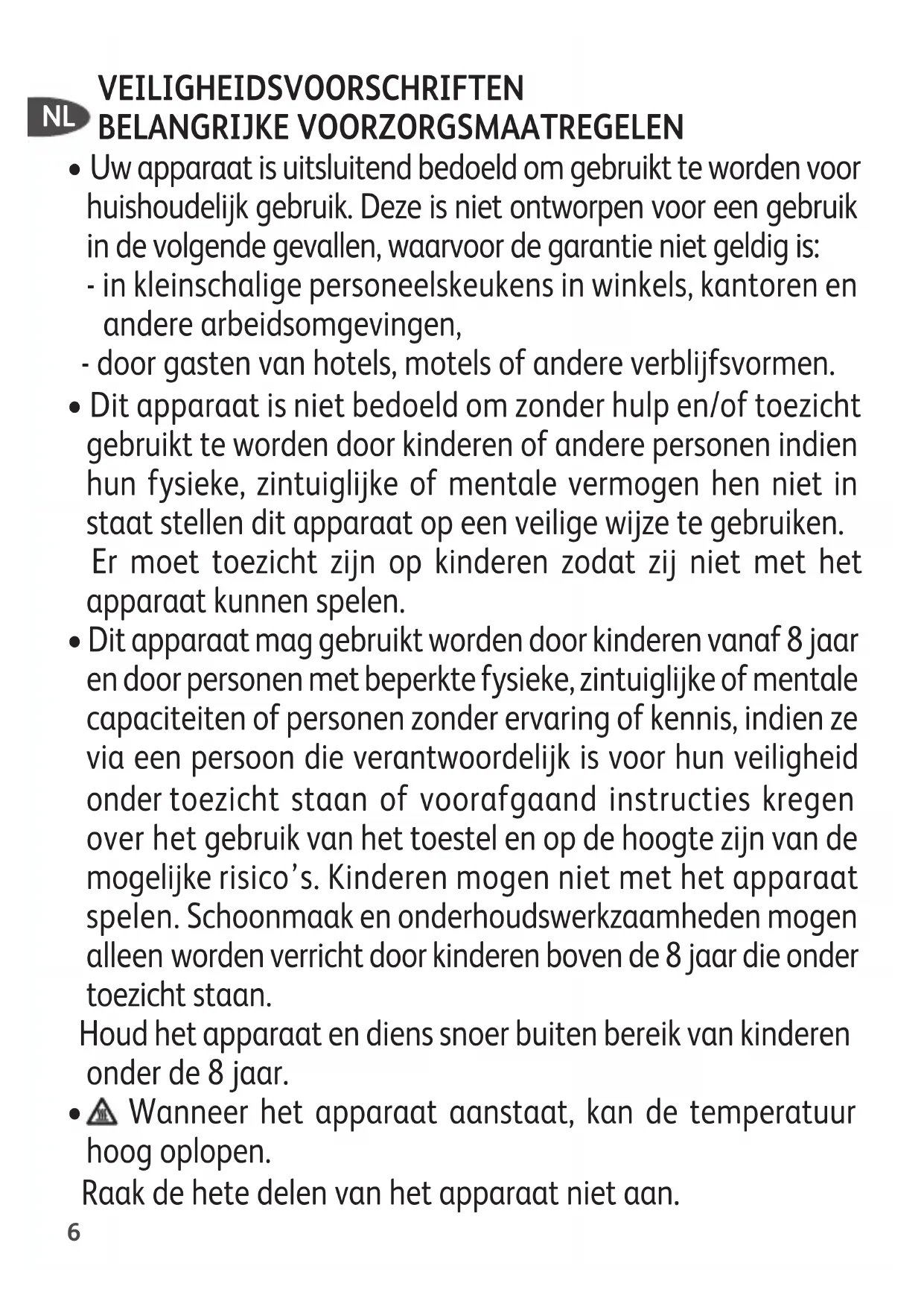 - Dit apparaat mag gebruikt worden door kinderen vanaf 8 jaar en door personen met beperkte fysieke, zintuiglijke of mentale capaciteiten of personen zonder ervaring of kennis, indien ze via een persoon die verantwoordelijk is voor hun veiligheid onder toezicht staan of voorafgaand instructies kregen over het gebruik van het toestel en op de hoogte zijn van de mogelijke risico’s. Kinderen mogen niet met het apparaat spelen. Schoonmaak en onderhoudswerkzaamheden mogen alleen worden verricht door kinderen boven de 8 jaar die onder toezicht staan. Houd het apparaat en diens snoer buiten bereik van kinderen onder de 8 jaar.