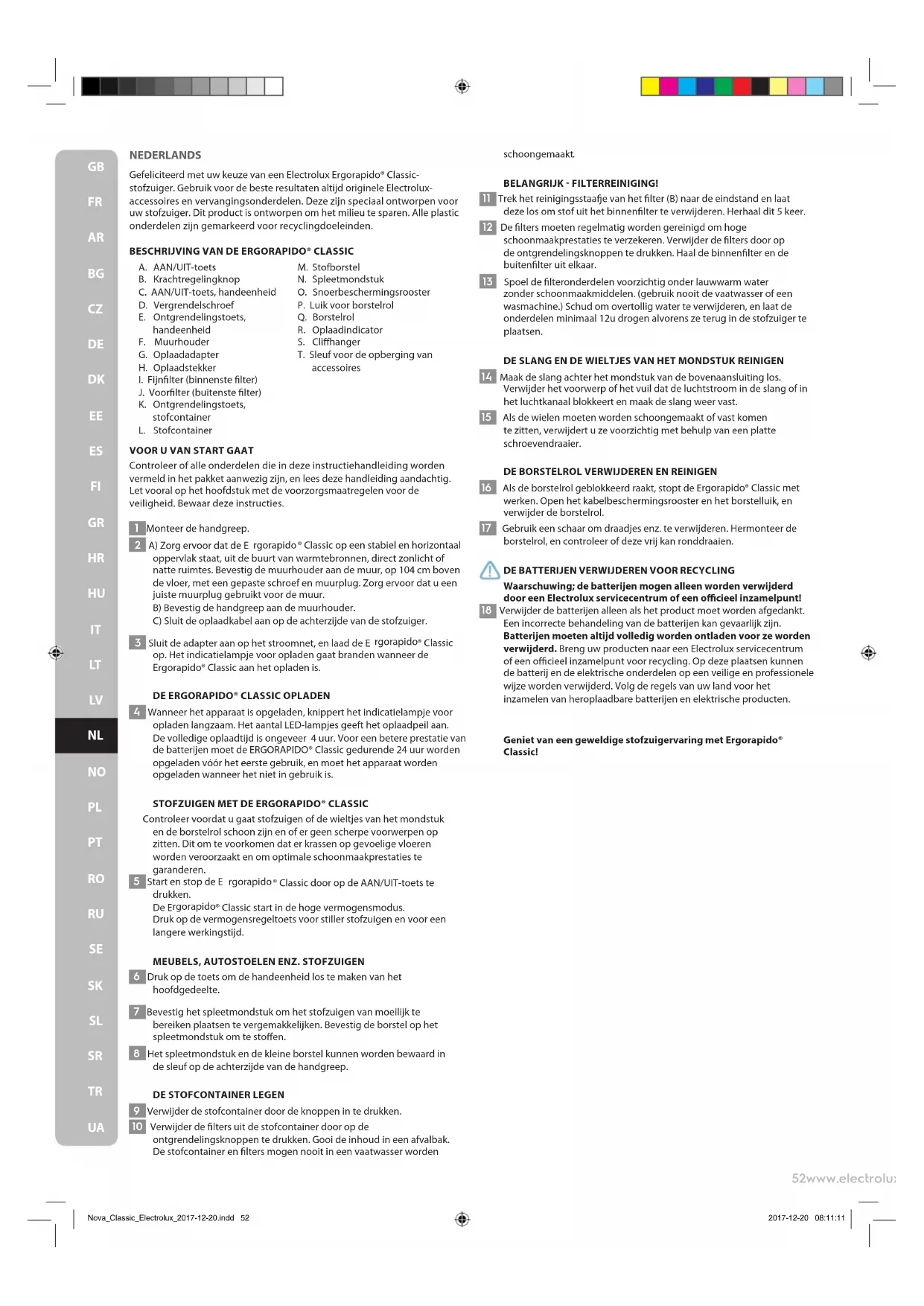 Waarschuwing; de batterijen mogen alleen worden verwijderd door een Electrolux servicecentrum of een ocieel inzamelpunt! 18 Verwijder de batterijen alleen als het product moet worden afgedankt. Een incorrecte behandeling van de batterijen kan gevaarlijk zijn. Batterijen moeten altijd volledig worden ontladen voor ze worden verwijderd. Breng uw producten naar een Electrolux servicecentrum of een ocieel inzamelpunt voor recycling. Op deze plaatsen kunnen de batterij en de elektrische onderdelen op een veilige en professionele wijze worden verwijderd. Volg de regels van uw land voor het inzamelen van heroplaadbare batterijen en elektrische producten. Geniet van een geweldige stofzuigervaring met Ergorapido® Classic! Nova_Classic_Electrolux_2017-12-20.indd 52 2017-12-20 08:11:1153www.electrolux.com
