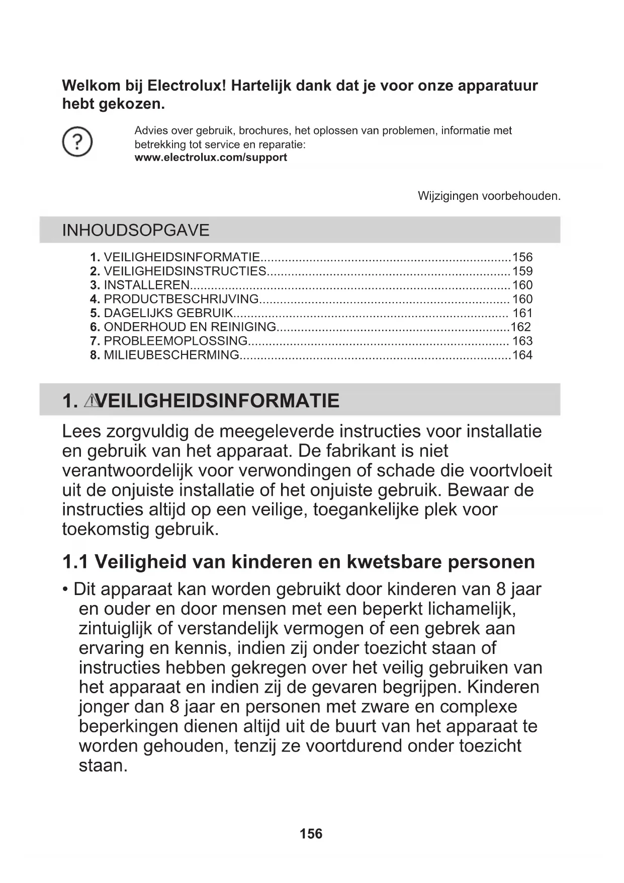 Recycleer de materialen met het symbool . Gooi de verpakking in een geschikte afvalcontainer om het te recycleren. Bescherm het milieu en de volksgezondheid en recycleer op een correcte manier het afval van elektrische en elektronische apparaten. Gooi apparaten gemarkeerd met het symbool niet weg met het huishoudelijk afval. Breng het product naar het milieustation bij u in de buurt of neem contact op met de gemeente. 164Velkommen til Electrolux! Takk for at du valgte produktet vårt. Få råd om bruk, brosjyrer, hjelp til feilsøking, og informasjon om service ogreparasjon:www.electrolux.com/supportMed forbehold om endringer. INNHOLD