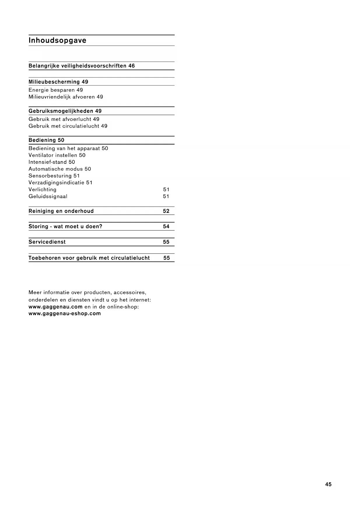 Guasto Possibile causa Soluzione L'apparecchio non funziona La spina non è inserita Collegare l'apparecchio alla corrente Interruzione dell’alimentazione elettrica Controllare se gli altri elettrodomestici funzionano Il fusibile è difettoso Verificare se il fusibile dell'apparecchio nell'apposita scatola è a posto L'illuminazione non funziona Le lampadine sono difettose Rivolgersi al servizio di assistenza clienti44 Servizio di assistenza tecnica Il servizio di assistenza tecnica è a disposizione per eventuali riparazioni. Troveremo la soluzione giusta, evitando di coinvolgere un tecnico quando non è necessario. Quando si contatta il servizio clienti indicare sempre il codice prodotto (E) e il codice di produzione (FD), in modo da poter ricevere subito un'assistenza mirata. La targhetta con i codici si trova nella parte interna dell’apparecchio (a tale scopo rimuovere il filtro metallico per grassi). Per avere subito a disposizione le informazioni utili in caso di necessità, si consiglia di riportare subito qui i dati relativi all'apparecchio e il numero di telefono del servizio di assistenza tecnica. Prestare attenzione al fatto che, in caso di utilizzo improprio, l'intervento del tecnico del servizio di assistenza non è gratuito anche se effettuato durante il periodo di garanzia. Trovate i dati di contatto di tutti i paesi nell'accluso elenco dei centri di assistenza clienti. Ordine di riparazione e consulenza in caso di guasti Fidatevi della competenza del Costruttore. In questo modo avrete la garanzia di una riparazione effettuata da tecnici qualificati e con pezzi di ricambio originali per il vostro elettrodomestico. Accessorio funzionamento a ricircolo d'aria (non compreso nella fornitura) Avvertenza: Seguire le istruzioni di montaggio dell'accessorio. Prima dotazione Filtri sostitutivi Codice prodotto (E) Codice di produzione (FD) Servizio di assistenza tecnica O I 800-091240 Linea verde CH 0848 840 040 AA200812 AA20011045 Inhoudsopgave Gebruiksaanwijzing Belangrijke veiligheidsvoorschriften 46 Milieubescherming 49 Energie besparen 49 Milieuvriendelijk afvoeren 49 Gebruiksmogelijkheden 49 Gebruik met afvoerlucht 49 Gebruik met circulatielucht 49 Bediening 50 Bediening van het apparaat 50 Ventilator instellen 50 Intensief-stand 50 Automatische modus 50 Sensorbesturing 51 Verzadigingsindicatie 51 Verlichting 51 Geluidssignaal 51 Reiniging en onderhoud 52 Storing - wat moet u doen? 54 Servicedienst 55 Toebehoren voor gebruik met circulatielucht 55 : Meer informatie over producten, accessoires, onderdelen en diensten vindt u op het internet: www.gaggenau.com en in de online-shop: www.gaggenau-eshop.com46 m Belangrijke veiligheidsvoorschriften Lees deze gebruiksaanwijzing zorgvuldig door. Alleen dan kunt u uw apparaat goed en veilig bedienen. Bewaar de gebruiksaanwijzing voor later gebruik of om door te geven aan een volgende eigenaar. De veiligheid is alleen gewaarborgd bij een deskundige montage volgens de montagehandleiding. De installateur is verantwoordelijk voor een goede werking op de plaats van opstelling. Dit toestel is alleen bestemd voor huishoudelijk gebruik en de huiselijke omgeving. Het apparaat is niet voor buitengebruik bestemd. Zorg ervoor dat het toestel altijd onder toezicht wordt gebruikt. De fabrikant is niet aansprakelijk voor schade als gevolg van onjuist gebruik of onjuiste bediening. Dit apparaat is bestemd voor gebruik tot op hoogten van maximaal 2.000 meter boven zeeniveau. Dit toestel kan worden gebruikt door kinderen vanaf 8 jaar en door personen met beperkte fysieke, sensorische of geestelijke vermogens of personen die gebrek aan kennis of ervaring hebben, wanneer zij onder toezicht staan van een persoon die verantwoordelijk is voor hun veiligheid of geleerd hebben het op een veilige manier te gebruiken en zich bewust zijn van de risico's die het gebruik van het toestel met zich meebrengt. Kinderen mogen niet met het apparaat spelen. Reiniging en onderhoud van het toestel mogen niet worden uitgevoerd door kinderen, tenzij zij 8 jaar of ouder zijn en onder toezicht staan. Zorg ervoor dat kinderen die jonger zijn dan 8 jaar uit de buurt blijven van het toestel of de aansluitkabel. Controleer het apparaat na het uitpakken. Niet aansluiten in geval van transportschade. Dit apparaat is niet bestemd voor gebruik met een externe tijdschakelklok of een afstandbediening. Verstikkingsgevaar! Verpakkingsmateriaal is gevaarlijk voor kinderen. Kinderen nooit met verpakkingsmateriaal laten spelen. Levensgevaar! Teruggezogen verbrandingsgassen kunnen leiden tot vergiftiging. Altijd voor voldoende luchttoevoer zorgen, wanneer de luchtafvoer plaatsvindt in een ruimte met een vuurbron die gebruikmaakt van de aanwezige lucht. Vuurbronnen die de lucht in de ruimte verbruiken (bijv. apparaten die op gas, olie, hout of kolen worden gestookt, geisers, warmwatertoestellen) trekken de verbrandingslucht uit de opstellingsruimte en voeren de gassen via een afvoer (bijv. schoorsteen) af naar buiten. In combinatie met een ingeschakelde afzuigkap wordt aan de keuken en aan de ruimtes ernaast lucht onttrokken - zonder voldoende luchttoevoer ontstaat er een onderdruk. Giftige gassen uit de schoorsteen of het afvoerkanaal worden teruggezogen in de woonruimte. ▯ Zorg daarom altijd voor voldoende ventilatie. ▯ Een ventilatiekast in de muur alleen is niet voldoende om aan de minimale eisen te voldoen. U kunt het apparaat alleen dan zonder risico gebruiken wanneer de onderdruk in de ruimte waarin de vuurbron zich bevindt niet groter is dan 4 Pa (0,04 mbar). Dit kan worden bereikt wanneer de voor de verbranding benodigde lucht door niet afsluitbare openingen, bijv. in deuren, ramen, in combinatie met een ventilatiekast in de muur of andere technische voorzieningen, kan worden toegevoerd.47 Raadpleeg in ieder geval het bedrijf dat in uw huis zorgt voor de schoorsteenreiniging. Dit bedrijf is in staat het totale ventilatiesysteem van uw huis te beoordelen en kan een voorstel doen 