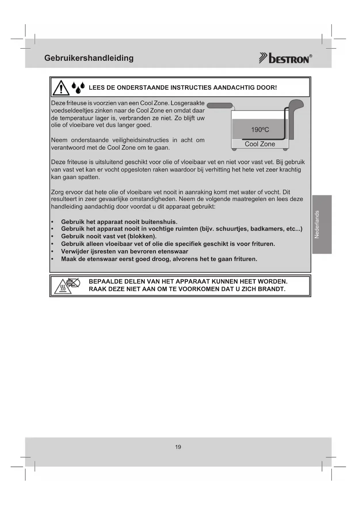 Zorg ervoor dat hete olie of vloeibare vet nooit in aanraking komt met water of vocht. Dit resulteert in zeer gevaarlijke omstandigheden. Neem de volgende maatregelen en lees deze handleiding aandachtig door voordat u dit apparaat gebruikt: