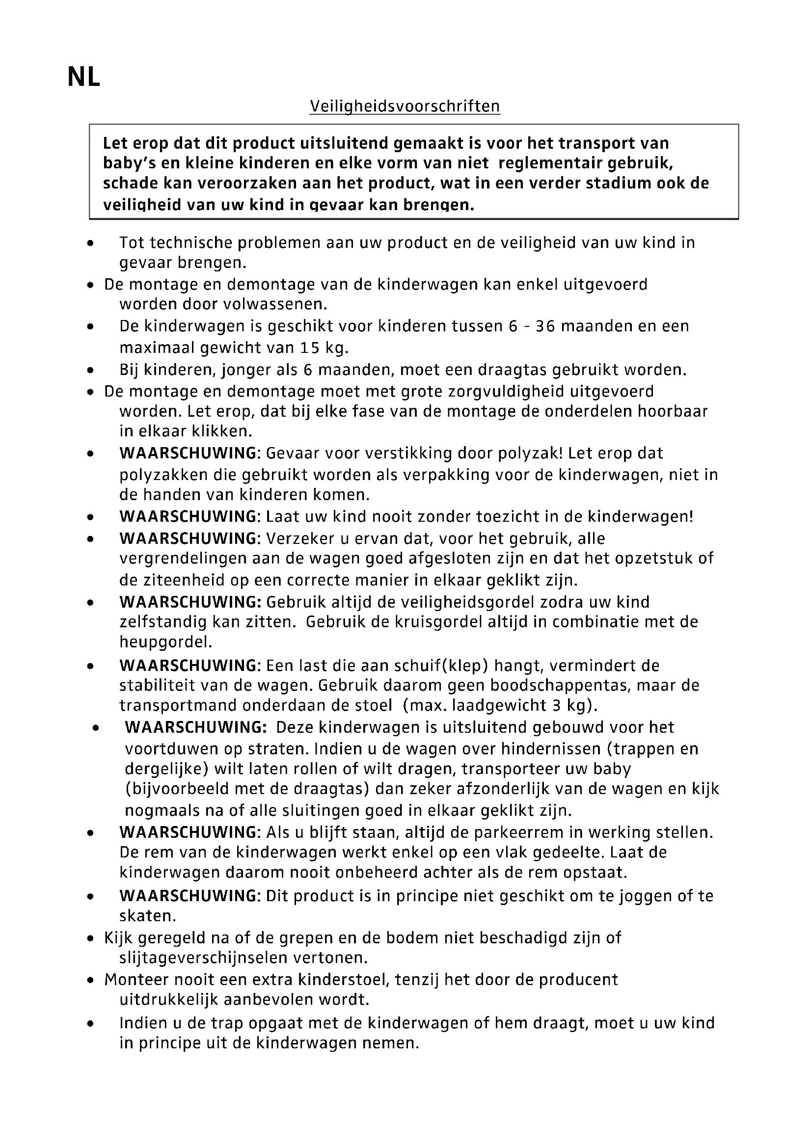 Tot technische problemen aan uw product en de veiligheid van uw kind in gevaar brengen. De montage en demontage van de kinderwagen kan enkel uitgevoerd worden door volwassenen. De kinderwagen is geschikt voor kinderen tussen 6 - 36 maanden en een maximaal gewicht van 15 kg. Bij kinderen, jonger als 6 maanden, moet een draagtas gebruikt worden. De montage en demontage moet met grote zorgvuldigheid uitgevoerd worden. Let erop, dat bij elke fase van de montage de onderdelen hoorbaar in elkaar klikken. WAARSCHUWING: Gevaar voor verstikking door polyzak! Let erop dat polyzakken die gebruikt worden als verpakking voor de kinderwagen, niet in de handen van kinderen komen. WAARSCHUWING: Laat uw kind nooit zonder toezicht in de kinderwagen! WAARSCHUWING: Verzeker u ervan dat, voor het gebruik, alle vergrendelingen aan de wagen goed afgesloten zijn en dat het opzetstuk of de ziteenheid op een correcte manier in elkaar geklikt zijn. WAARSCHUWING: Gebruik altijd de veiligheidsgordel zodra uw kind zelfstandig kan zitten. Gebruik de kruisgordel altijd in combinatie met de heupgordel. WAARSCHUWING: Een last die aan schuif(klep) hangt, vermindert de stabiliteit van de wagen. Gebruik daarom geen boodschappentas, maar de transportmand onderdaan de stoel (max. laadgewicht 3 kg). WAARSCHUWING: Deze kinderwagen is uitsluitend gebouwd voor het voortduwen op straten. Indien u de wagen over hindernissen (trappen en dergelijke) wilt laten rollen of wilt dragen, transporteer uw baby (bijvoorbeeld met de draagtas) dan zeker afzonderlijk van de wagen en kijk nogmaals na of alle sluitingen goed in elkaar geklikt zijn. WAARSCHUWING: Als u blijft staan, altijd de parkeerrem in werking stellen. De rem van de kinderwagen werkt enkel op een vlak gedeelte. Laat de kinderwagen daarom nooit onbeheerd achter als de rem opstaat. WAARSCHUWING: Dit product is in principe niet geschikt om te joggen of te skaten. Kijk geregeld na of de grepen en de bodem niet beschadigd zijn of slijtageverschijnselen vertonen. Monteer nooit een extra kinderstoel, tenzij het door de producent uitdrukkelijk aanbevolen wordt. Indien u de trap opgaat met de kinderwagen of hem draagt, moet u uw kind in principe uit de kinderwagen nemen. Let erop dat dit product uitsluitend gemaakt is voor het transport van baby’s en kleine kinderen en elke vorm van niet reglementair gebruik, schade kan veroorzaken aan het product, wat in een verder stadium ook de veiligheid van uw kind in gevaar kan brengen.