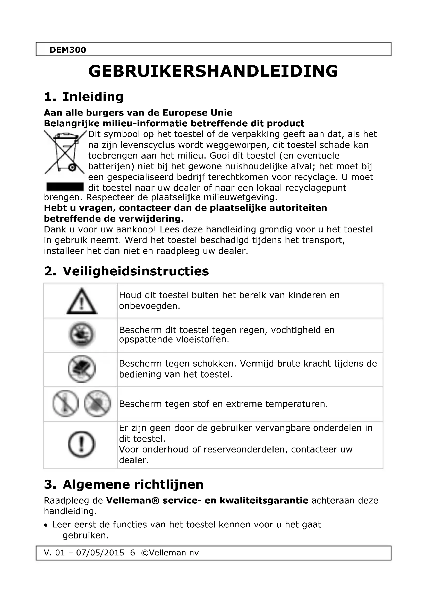 Raadpleeg de Velleman® service- en kwaliteitsgarantie achteraan deze handleiding. Leer eerst de functies van het toestel kennen voor u het gaat gebruiken.DEM300