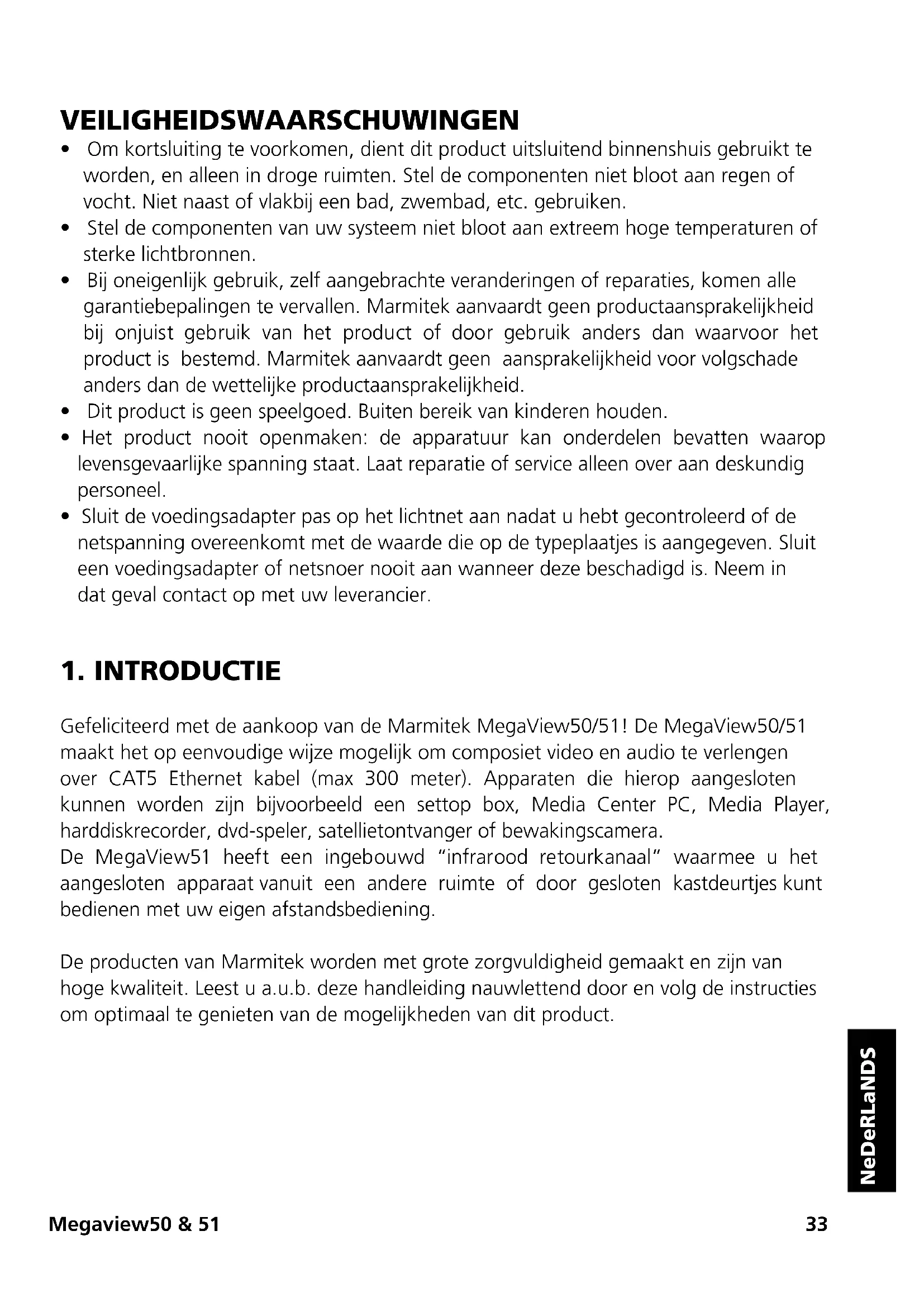 Gefeliciteerd met de aankoop van de Marmitek MegaView50/51! De MegaView50/51 maakt het op eenvoudige wijze mogelijk om composiet video en audio te verlengen over CAT5 Ethernet kabel (max 300 meter). Apparaten die hierop aangesloten kunnen worden zijn bijvoorbeeld een settop box, Media Center PC, Media Player, harddiskrecorder, dvd-speler, satellietontvanger of bewakingscamera. De MegaView51 heeft een ingebouwd “infrarood retourkanaal” waarmee u het aangesloten apparaat vanuit een andere ruimte of door gesloten kastdeurtjes kunt bedienen met uw eigen afstandsbediening. De producten van Marmitek worden met grote zorgvuldigheid gemaakt en zijn van hoge kwaliteit. Leest u a.u.b. deze handleiding nauwlettend door en volg de instructies om optimaal te genieten van de mogelijkheden van dit product.34 © MaRMiTeK