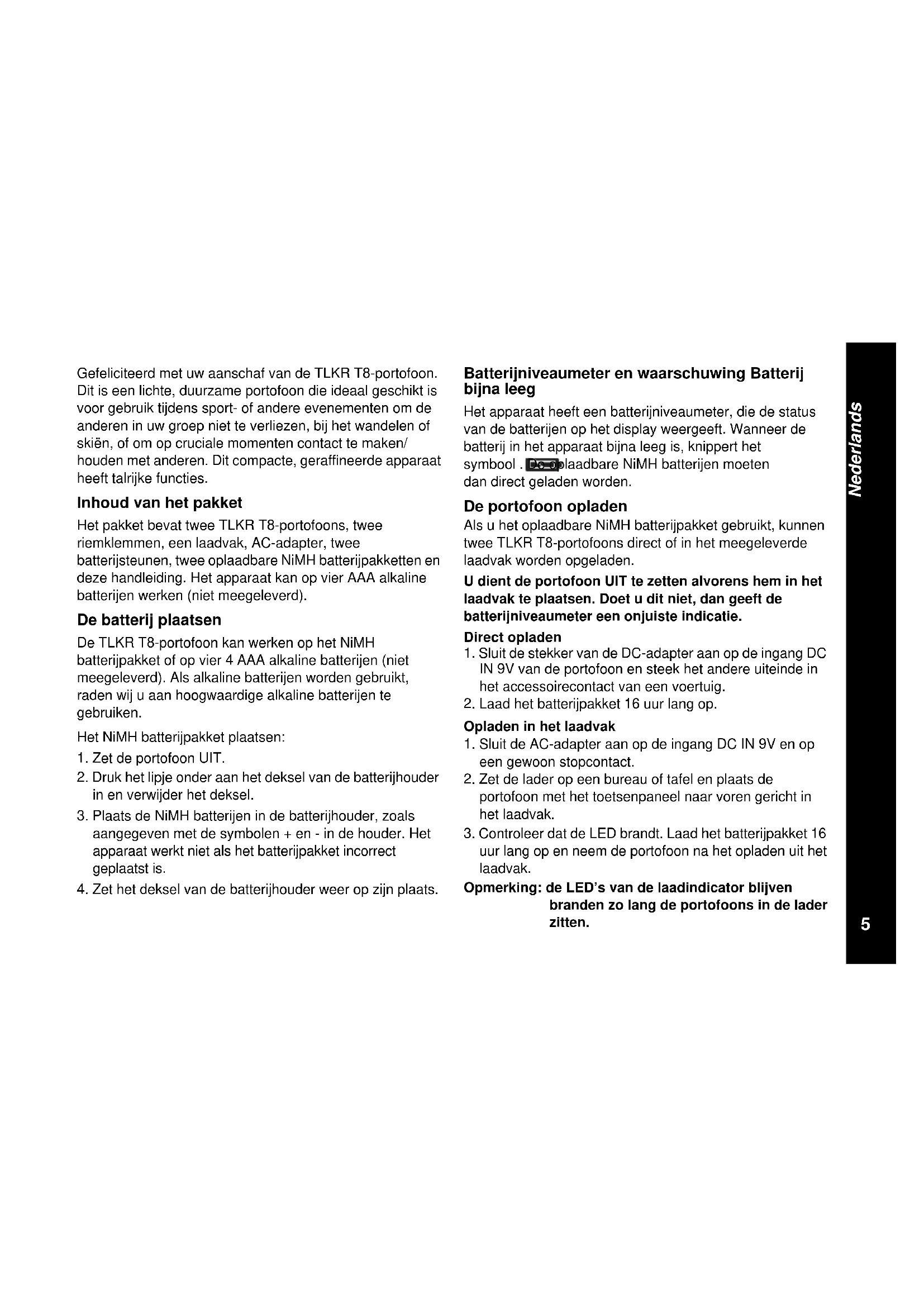 uur lang op en neem de portofoon na het opladen uit het laadvak. Opmerking: de LED’s van de laadindicator blijven branden zo lang de portofoons in de lader zitten. T8_NL.fm Page 5 Thursday, September 16, 2010 3:17 PM6 Nederlands De batterij opladen U kunt het NiMH batterijpakket met gebruikmaking van de batterijsteun ook zonder de portofoon opladen.