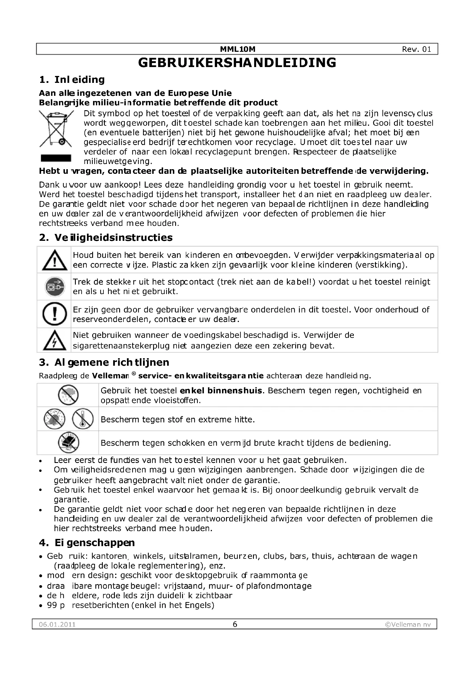 - Valt niet onder waarborg: - alle rechtstreekse of onrechtstreekse schade na de levering veroorzaakt aan het toestel (bv. door oxidatie, schokken, val, stof, vuil, vocht...), en door het toestel, alsook zijn inhoud (bv. verlies van data), vergoeding voor eventuele winstderving. - verbruiksgoederen, onderdelen of hulpstukken die regelmatig dienen te worden vervangen, zoals bv. batterijen, lampen, rubberen onderdelen, aandrijfriemen... (onbeperkte lijst). - defecten ten gevolge van brand, waterschade, bliksem, ongevallen, natuurrampen, enz. - defecten veroorzaakt door opzet, nalatigheid of door een onoordeelkundige behandeling, slecht onderhoud of abnormaal gebruik of gebruik van het toestel strijdig met de voorschriften van de fabrikant. - schade ten gevolge van een commercieel, professioneel of collectief gebruik van het apparaat (bij professioneel gebruik wordt de garantieperiode herleid tot 6 maand). - schade veroorzaakt door onvoldoende bescherming bij transport van het apparaat. - alle schade door wijzigingen, reparaties of modificaties uitgevoerd door derden zonder toestemming van Velleman