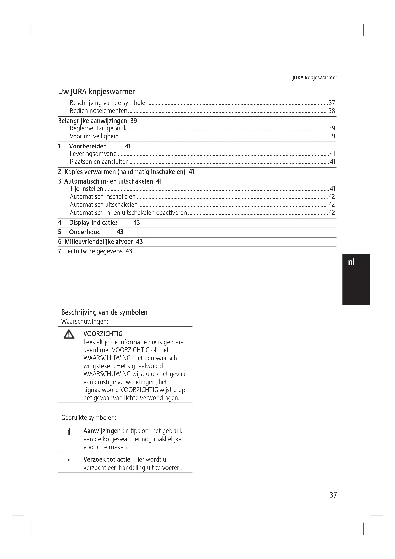 nl40 JURA kopjeswarmer Z Laat het netsnoer nooit los han- gen. Het netsnoer kan een struikel- blok vormen of beschadigd raken. Z Bescherm het apparaat tegen weersinvloeden zoals regen, vorst en direct zonlicht. Z Gebruik het apparaat niet om dranken of andere levensmidde- len te bewaren of op te warmen. Z Uitgetrokken kopjesladen niet zwaar belasten. Z Plaats geen vochtige of natte kopjes in de kopjesladen. Z Dompel het apparaat, het net- snoer en de aansluitingen nooit onder in water. Z Plaats het apparaat en de afzon- derlijke onderdelen niet in de vaatwasser. Z Schakel het apparaat vóór reini- gingswerkzaamheden uit en trek de netstekker uit het stopcon- tact. Veeg het apparaat altijd vochtig, echter nooit nat af en bescherm het apparaat tegen continu spatwater. De zijwanden aan de binnenkant niet reinigen. Z Het apparaat alleen aansluiten op de netspanning zoals aange- geven op het typeplaatje. Het typeplaatje bevindt zich aan de onderzijde van het apparaat. Meer technische gegevens vindt u in hoofdstuk 7, “Technische gegevens”. Z Schakel het apparaat uit als u het gedurende een langere tijd niet gebruikt en trek de netstekker uit het stopcontact. Z Gebruik het apparaat uitsluitend onder toezicht. Z Kinderen mogen reinigings- en onderhoudswerkzaamheden uitsluitend onder toezicht van een verantwoordelijke persoon uitvoeren. Z Laat kinderen niet met het apparaat spelen. Z Kinderen onder acht jaar uit de buurt van het apparaat houden resp. permanent in de gaten houden. Z Kinderen vanaf acht jaar mogen het apparaat uitsluitend zonder toezicht bedienen als de veilige omgang met het apparaat uitgelegd is. Kinderen moeten mogelijke gevaren door een foutieve bediening kunnen herkennen en begrijpen. Personen, inclusief kinderen, die vanwege hun Z fysieke, zintuiglijke of verstande- lijke vermogens of Z onervarenheid of onwetendheid niet in staat zijn het apparaat veilig te gebruiken, mogen het apparaat niet zonder toezicht of instructie van een verantwoordelijke persoon gebruiken.41 JURA kopjeswarmer 2 Kopjes verwarmen (handmatig inschakelen) J Verbrandingsgevaar. De plateaus van de kopjesladen kunnen tijdens bedrijf heet worden. T Raak de plateaus van de kopjesladen niet aan. T Open een kopjeslade. T Plaats de kopjes in de kopjeslade en sluit de kopjeslade. Q T Schakel het apparaat in met behulp van de toets Aan/Uit. De bedrijfsindicatie brandt en het apparaat begint de kopjes te verwarmen. Op de display onder de afdekking wordt ON weergegeven. E Als u het apparaat wilt uitschakelen, drukt u op de toets Aan/Uit Q. De bedrijfsindicatie brandt niet meer, op de display wordt OFF weergegeven. E Als de functie »Automatisch uitschakelen« niet geactiveerd is, wordt het apparaat na 12 uur automatisch uitgeschakeld om energie te besparen. 3 Automatisch in- en uitschakelen E Als het apparaat van het elektriciteitsnet wordt losgekoppeld, worden alle instellingen gereset. Tijd instellen Voor de functie “Automatisch in- en uitschakelen” dient u eerst de tijd in te stellen: T Open de afdekking. T Druk op de kloktoets. Op de display wordt AM 12:00 weergegeven. T Druk op een van de pijltjestoetsen om het tijdformaat te selecteren (AM/PM of 24h). T Druk op de kloktoets om het tijdformaat te bevestigen. 00:00 (voorbeeld), de uren knipperen. 1 Voorbereiden Leveringsomvang Tot de leveringsomvang behoren: Z JURA kopjeswarmer Z Gebruiksaanwijzing Z Netsnoer Plaatsen en aansluiten Neem bij het opstellen van de kopjeswarmer de volgende punten in acht: Z Plaats het apparaat op een horizontaal oppervlak. Z Kies de plaats voor het apparaat zodanig, dat het apparaat tegen oververhitting beschermd is. J WAARSCHUWING Levensgevaar door elektrische schok bij gebruik met een beschadigd netsnoer. T Neem nooit een apparaat met een bescha- digd netsnoer in gebruik. T Plaats het apparaat voorzichtig op zijn kop. T Sluit het netsnoer aan op het apparaat. E Aan de onderzijde van de kopjeswarmer kunt u het netsnoer, afhankelijk van de benodigde lengte, opbergen. T Plaats het apparaat weer op de pootjes. T Steek de netstekker in een stopcontact. Op de display onder de afdekking wordt OFF weergegeven.