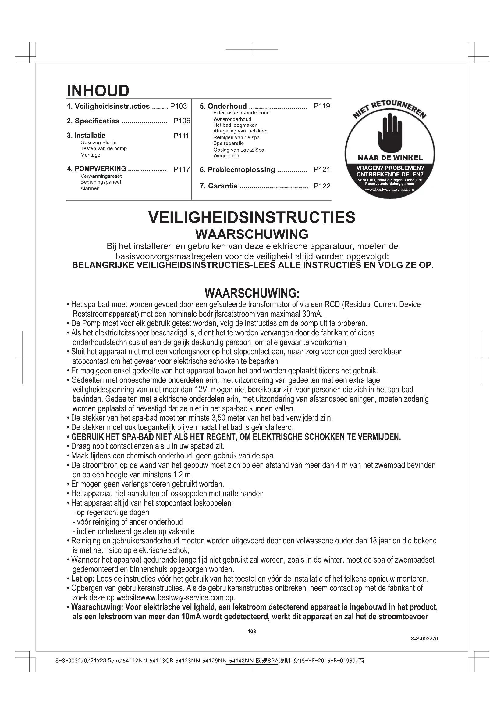 S-S-003270 Opslag van Lay-Z-Spa Weggooien Zorg ervoor dat de spa en pomp volledig droog zijn. Dit is essentieel om de levensduur van de spa te verlengen. We bevelen aan om de pomp te gebruiken om de spa, pomp en leidingen droog te blazen. Verwijder de filtersets en gooi de gebruikte filtercassettes weg. Plaats de twee stopper-doppen terug op de inlaat- en uitlaatkleppen. Het is aanbevolen dat u de spa opbergt in de originele verpakking en op een warme droge plaats. PROBLEEMOPLOSSING Bestway streeft ernaar de meest probleemloze spa's op de markt te brengen. Als u enige problemen ondervindt, aarzel dan niet om contact op te nemen met Bestway of met uw geautoriseerde dealer. Hier zijn enkele nuttige tips om u te helpen enkele vaak voorkomende oorzaken van problemen te identificeren en op te lossen. Betekenis van doorkruiste vuilbaksymbool: Elektrische toestellen niet weggooien als ongesorteerd stedelijk afval, gebruik gescheiden afvalinzameling. Neem contact op met uw plaatselijke overheid voor informatie betreffende de beschikbare inzamelingssystemen. Als elektrische toestellen op stortplaatsen worden gestort, kunnen gevaarlijke stoffen in het grondwater lekken en in de voedselketen terecht komen en zo uw gezondheid en welzijn schaden. Wanneer oude toestellen door nieuwe vervangen worden, is de detailhandelaar wettelijk verplicht uw oud toestel gratis terug te nemen voor verwijdering. OPMERKING: Plastic wordt broos en onderhevig aan breken wanneer blootgesteld aan temperaturen onder nul. Vriezen kan de spa ernstig beschadigen. Het incorrect klaarmaken voor de winter van uw spa kan uw garantie ongeldig maken. Problemen Pomp werkt niet Pomp warmt niet correct op Lay-Z-Massagesysteem werkt niet De pompadapters zijn niet gelijk met de spa-adapters Spa-lekken Het water is niet proper Mogelijke oorzaken - De Spa is gescheurd of doorboord Oplossingen - Controleer de stroombron - Koppel de pomp los van het stopcontact en sluit terug aan. - Neem contact op met uw lokale Bestway Dienst Naverkoop voor meer instructies - Stel in op een hogere temperatuur, zie het deel pompwerking - Reinig/Vervang de filtercassette, raadpleeg het deel reinigen en vervangen van filtercassette - Voeg water toe tot aan opgegeven niveaus - Druk op de resetknop op de pomp, zie deel pompwerking - Neem contact op met uw lokale Bestway Dienst Naverkoop voor meer instructies - Koppel de pomp los en wacht twee uur tot e pomp afgekoeld is. Plaats de plug en druk op de Lay-Z-Massagesysteem-knop - Druk op de Lay-Z-Massagesysteem-knop om te reactiveren - Neem contact op met uw lokale Bestway Dienst Naverkoop voor meer instructies - Verhoog de pomp met hout of een ander type geïsoleerd materiaal om de pompadapters gelijk te brengen met de spa-adapters - Gebruik de bijgeleverde reparatiepatch - Verhoog de filtratietijd - Reinig/Vervang de filtercassette, raadpleeg het deel reinigen en vervangen van filtercassette - Raadpleeg de instructies van de fabrikant van de chemicaliën. - Stroomstoring - Testknop is ingedrukt - Stroomkring is verbroken - Temperatuur is te laag ingesteld - Vuile filtercassette - Incorrecte waterniveaus - De thermische beveiliging wordt onderbroken. - Verwarmingselement werkt niet - Luchtpomp is te warm - De Lay-Z-Spa Massage stopt automatisch - Luchtpomp is kapot - Eén eigenschap van PVC is dat het van vorm verandert, wat normaal is - Onvoldoende filtertijd - Vuile filtercassette - Incorrect wateronderhoudS-S-003270/21x28.5cm/54112NN 54113GB 54123NN 54129NN 54148NN 欧规SPA说明书/JS-YF-2015-B-01969/质保/荷 S-S-003270Het product dat u hebt aangekocht heeft een beperkte garantie. Bestway steunt onze kwaliteitsgarantie en verzekert, via een vervangingsgarantie, dat uw product vrij zal zijn van fabricagefouten die resulteren in lekken. Om een garantieclaim in te dienen, moet dit formulier ingevuld worden en samen met een kopie van uw aankoopbewijs bezorgd worden aan uw lokale Bestway Dienst Naverkoop. Neem contact op met uw lokale Bestway Dienst Naverkoop vooraleer u enige documenten zendt - ze zullen u volledige instructies bezorgen m.b.t. wat nodig is voor uw claim. Bestway zal geen producten vervangen die geacht worden beschadigd te zijn omwille van nalatigheid of die gebruikt werden buiten de richtlijnen in de gebruikershandleiding. De garantie van Bestway dekt fabricagefouten ontdekt terwijl het product uitgepakt werd of tijdens gebruik zoals aanbevolen in de gebruikershandleiding. Deze garantie is enkel van toepassing op het product dat niet gewijzigd mag zijn door enige derde. Het product moet opgeborgen en gehanteerd worden overeenkomstig de technische aanbevelingen. Deze garantie dekt geen schade veroorzaakt door verkeerd gebruik, misbruik, verzuim, inclusief maar niet beperkt tot botsing, brand, gebruik van incorrecte spanning, buitensporige blootstelling aan hitte, incorrecte installatie, incorrecte bedrading of testen, incorrecte opberging, Vervangingen en reparaties verlengen de duur van de garantie niet. De datum die beschouwd wordt als de start van de garantie is de enige die getoond wordt in het originele ontvangstbewijs/aankoopfactuur. Kies uw SPA Vegas Monaco Miami Palm Springs Hawaii Paris SPA POMP Itemcode: FAX/E-MAIL/TEL: Raadpleeg uw land volgens de informatie op de achteromslag of op onze website: www.bestway-service.com Geef uw volledig adres op. Opmerking: Onvolledige adressen resulteren in vertraagde verzendingen. Bestway behoudt zich het recht voor om onafgeleverde pakketten terug te leveren wanneer de ontvanger in fout is. Bewijs van datum van aankoop: AAN: Bestway