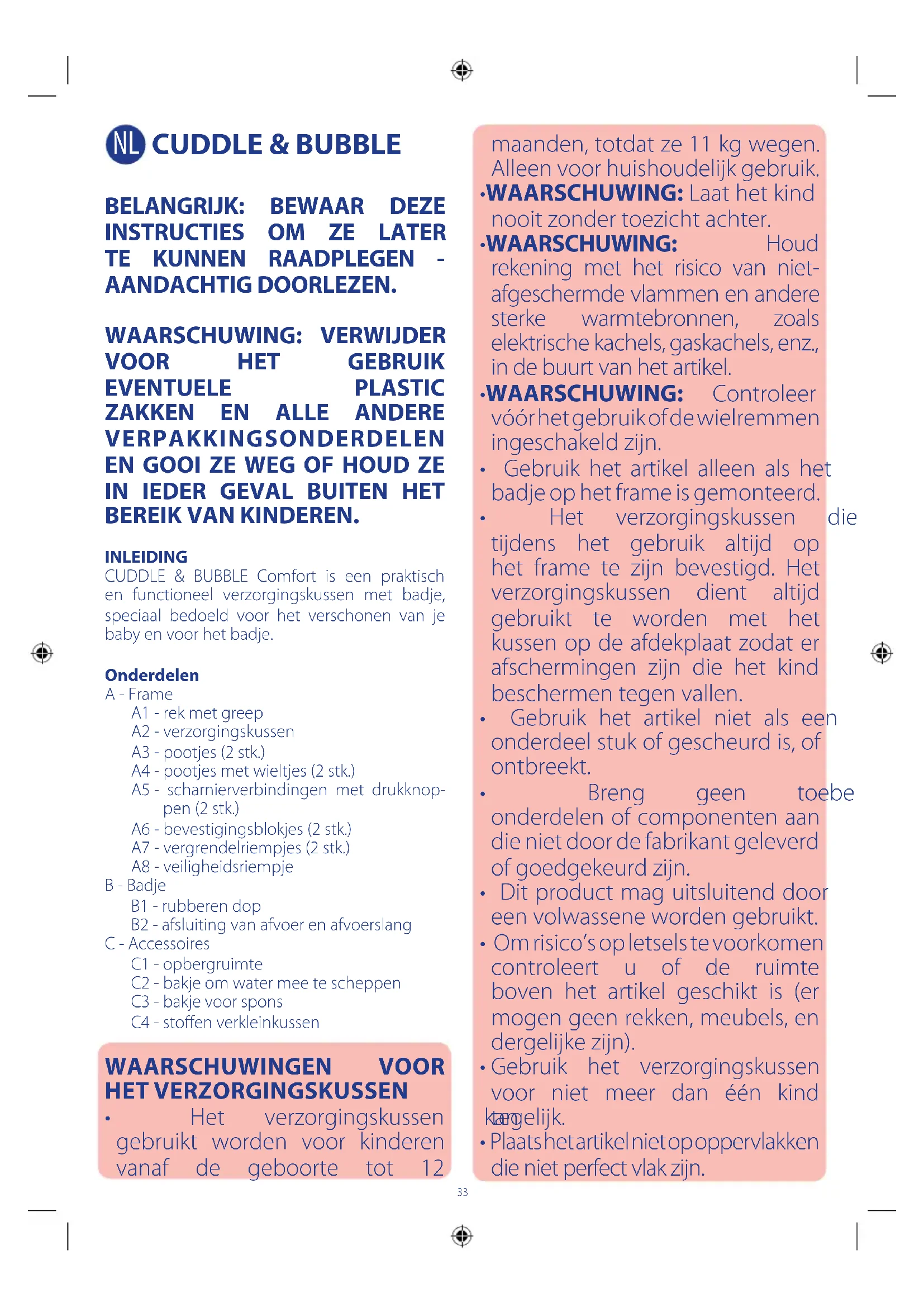 - Volg de onderstaande aanwijzingen als u het verkleinkussen wast: Met koud water met de hand wassen37 Niet bleken Niet in de droogtrommel drogen Niet strijken Niet chemisch laten reinigen GARANTIE Het artikel valt onder garantie tegen elke non-conformiteit binnen de normale gebruiksomstandigheden zoals voorzien in de gebruiksaanwijzingen. De garantie is dus niet geldig in geval van schade veroorzaakt door oneigenlijk gebruik, slijtage of toevallige gebeurtenissen. Voor de duur van de garantie inzake non-conformiteit verwijzen we naar de specieke richtlijnen en de nationale normen die van toepassing zijn in het land van aankoop, indien deze voorzien zijn.38 CUDDLE & BUBBLE