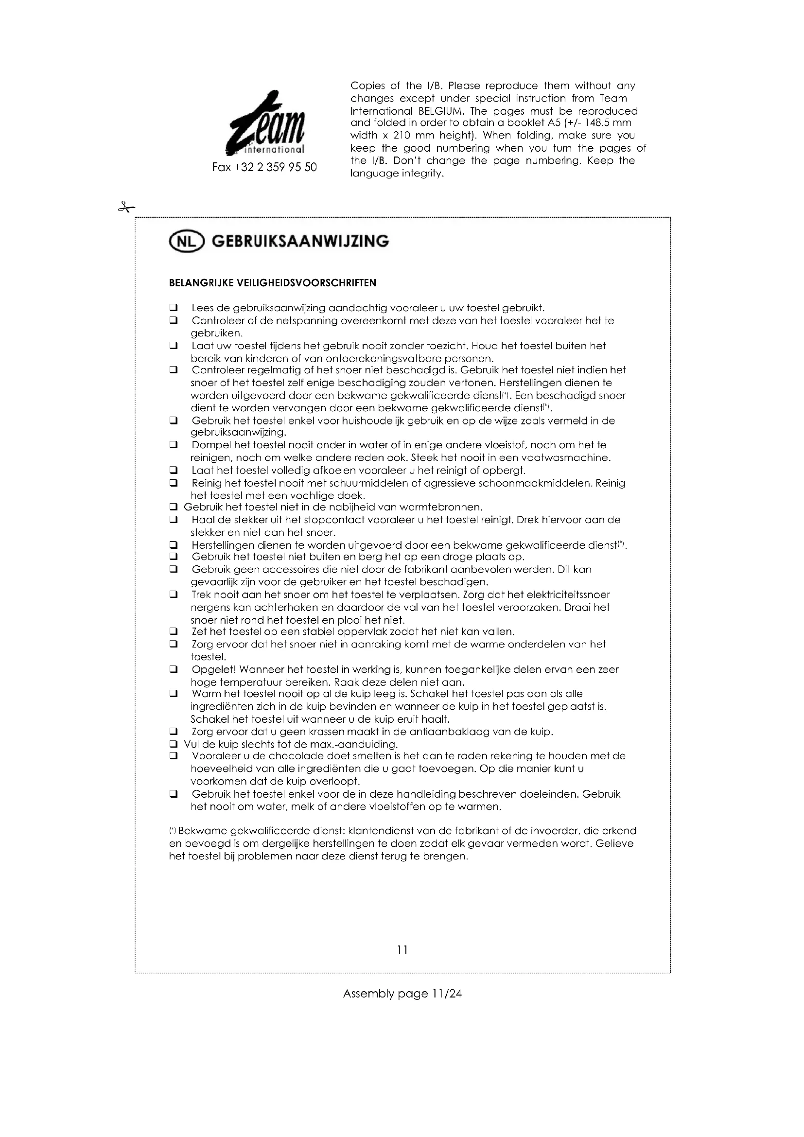 □ Controller regelmatig of het snoer Niet beschadigd is. Gebruik het toestel Niet indien het snoer of het toestel zich enige beschadiging zouden vertonen. Herstellingen dienen te worden uitgevoerd door een bekwame gekwalificeerde dienst'. Een beschadigd snoer dient te worden verrangen door een bekwame gekwalificeerde dienst'.