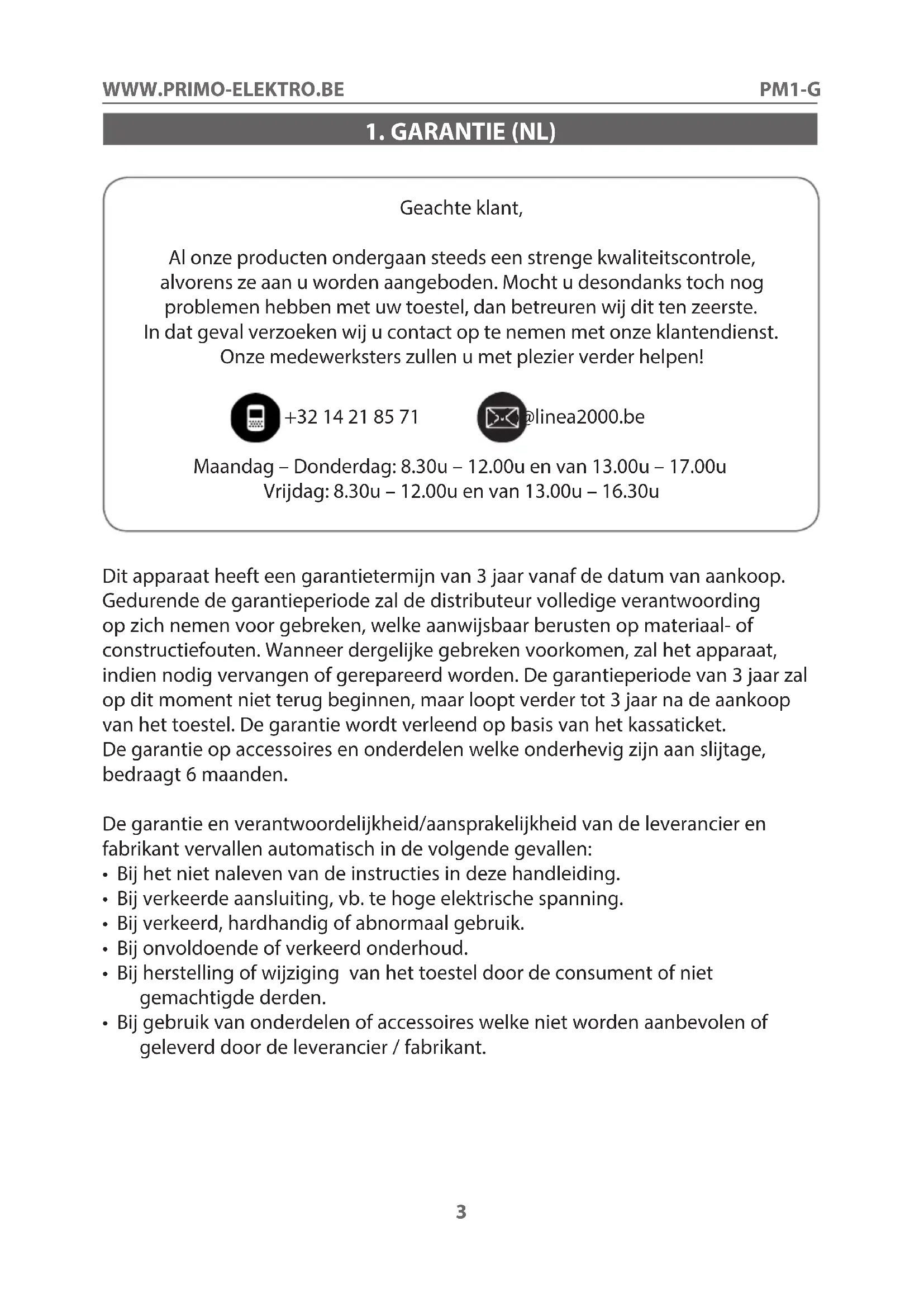 Geachte klant, Al onze producten ondergaan steeds een strenge kwaliteitscontrole, alvorens ze aan u worden aangeboden. Mocht u desondanks toch nog problemen hebben met uw toestel, dan betreuren wij dit ten zeerste. In dat geval verzoeken wij u contact op te nemen met onze klantendienst. Onze medewerksters zullen u met plezier verder helpen! +32 14 21 85 71 info@linea2000.be Maandag – Donderdag: 8.30u – 12.00u en van 13.00u – 17.00u Vrijdag: 8.30u – 12.00u en van 13.00u – 16.30u Dit apparaat heeft een garantietermijn van 3 jaar vanaf de datum van aankoop. Gedurende de garantieperiode zal de distributeur volledige verantwoording op zich nemen voor gebreken, welke aanwijsbaar berusten op materiaal- of constructiefouten. Wanneer dergelijke gebreken voorkomen, zal het apparaat, indien nodig vervangen of gerepareerd worden. De garantieperiode van 3 jaar zal op dit moment niet terug beginnen, maar loopt verder tot 3 jaar na de aankoop van het toestel. De garantie wordt verleend op basis van het kassaticket. De garantie op accessoires en onderdelen welke onderhevig zijn aan slijtage, bedraagt 6 maanden. De garantie en verantwoordelijkheid/aansprakelijkheid van de leverancier en fabrikant vervallen automatisch in de volgende gevallen: