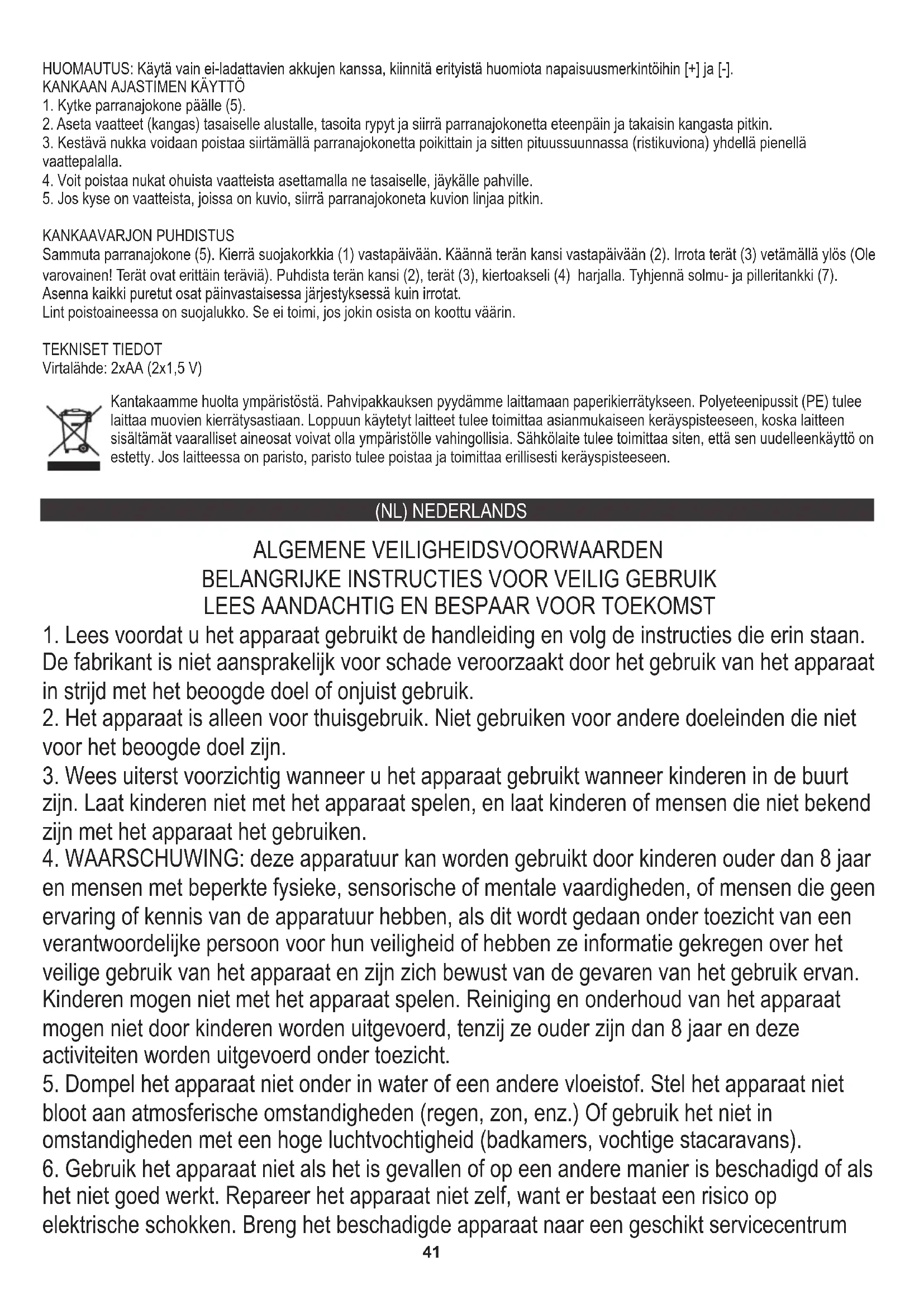 Voeding: 2xAA (2x1,5V) OPMERKING: Alleen gebruiken met niet-oplaadbare batterijen.