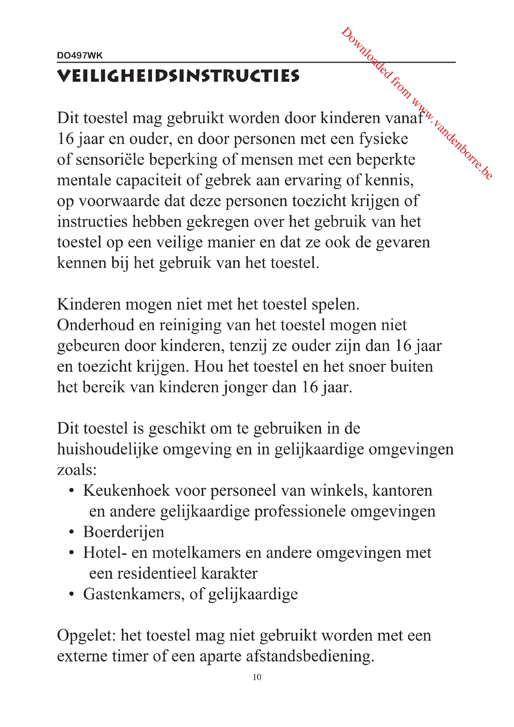 - Gastenkamers, of gelijkaardige Opgelet: het toestel mag niet gebruikt worden met een externe timer of een aparte afstandsbediening. Downloaded from www.vandenborre.beDO497WK