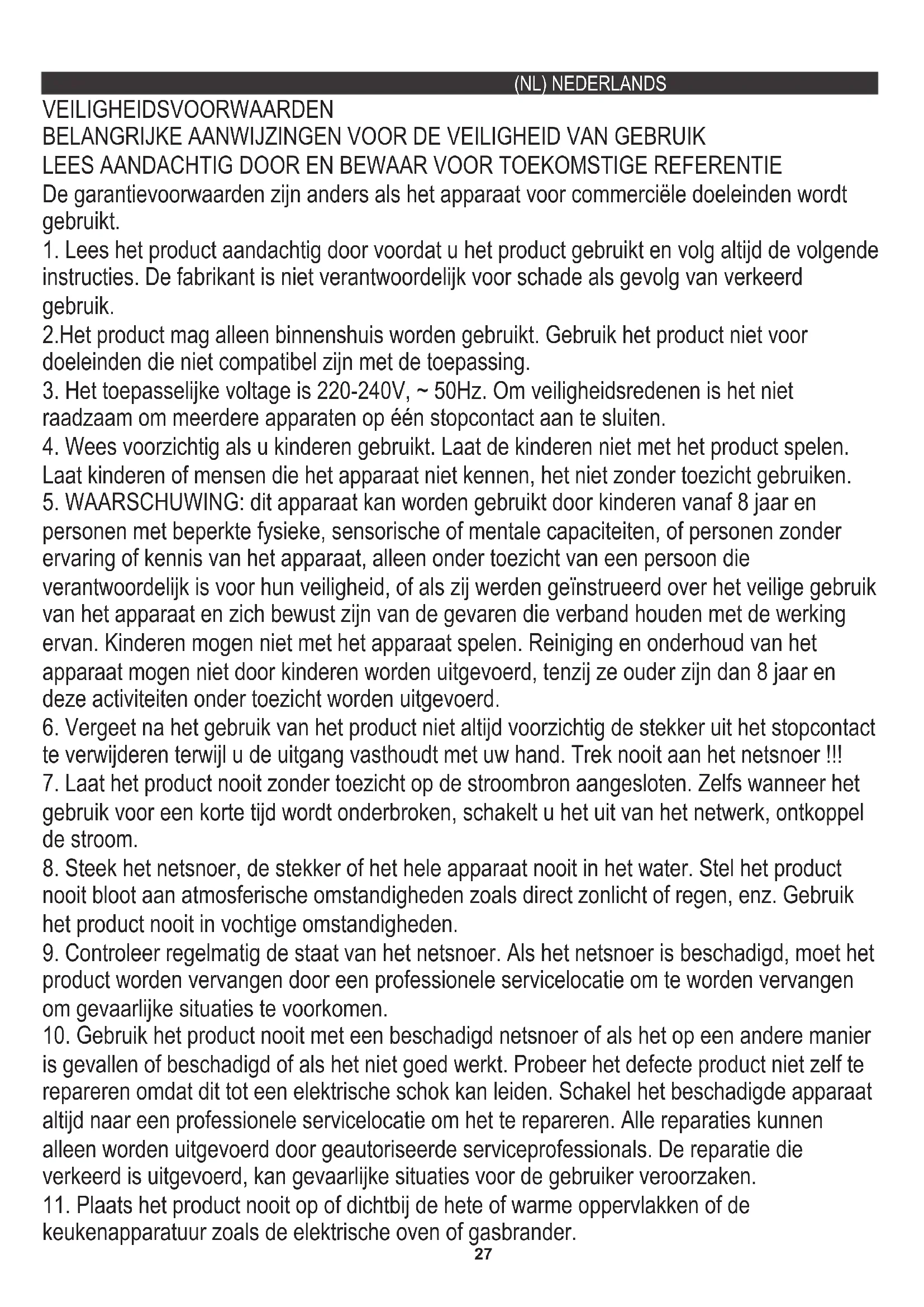 VEILIGHEIDSVOORWAARDEN BELANGRIJKE AANWIJZINGEN VOOR DE VEILIGHEID VAN GEBRUIK LEES AANDACHTIG DOOR EN BEWAAR VOOR TOEKOMSTIGE REFERENTIE De garantievoorwaarden zijn anders als het apparaat voor commerciële doeleinden wordt gebruikt.
