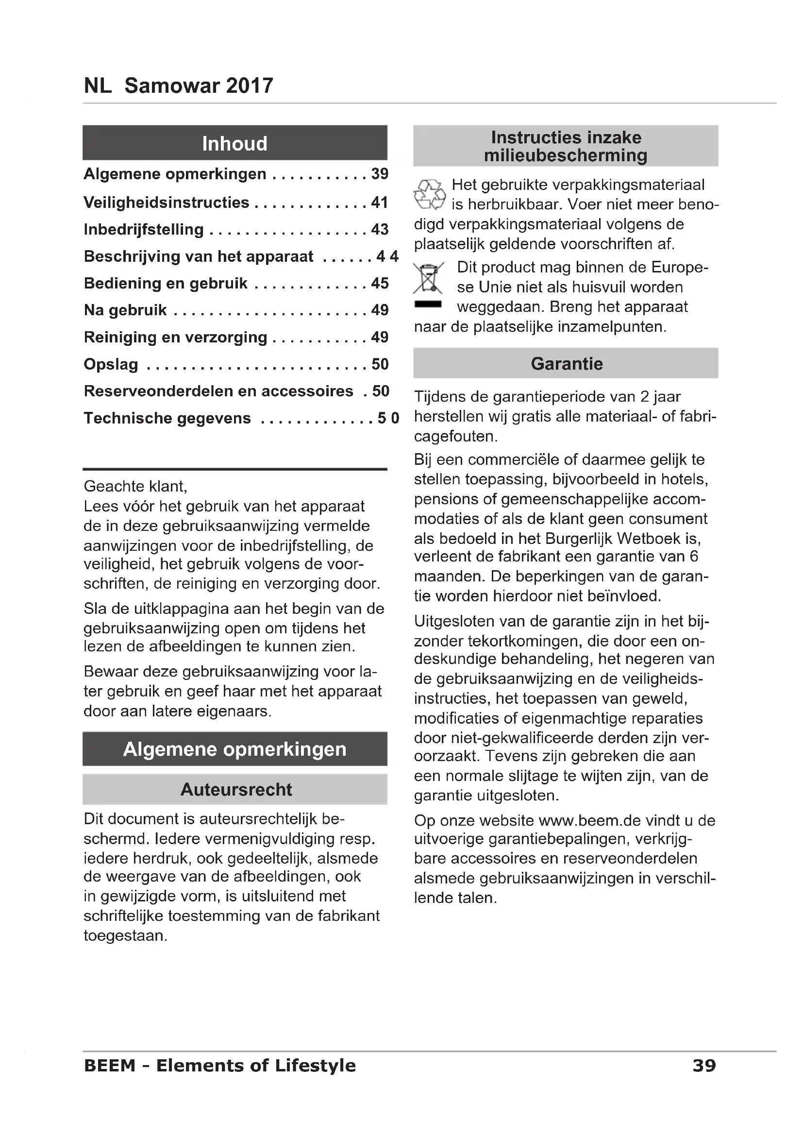 - Kit de petites pièces pour le robinet de service Caractéristiques techniques Modèle Samowar 2017 Numéro de type S 2.3.17 Dimensions 48,5 x 27,3 x 30,7 cm Poids net kit principal env. 2,2 kg Tension d'exploitation 220 – 240 V~ Fréquence réseau 50 – 60 Hz Puissance absorbée 1500 W Volume de remplissage de la théière 1,2 l Contenance du réservoir à eau 3,0 l Classe de protection I Classe de protection IPX039 NL Samowar 2017 BEEM - Elements of Lifestyle Geachte klant, Lees vóór het gebruik van het apparaat de in deze gebruiksaanwijzing vermelde aanwijzingen voor de inbedrijfstelling, de veiligheid, het gebruik volgens de voor- schriften, de reiniging en verzorging door. Sla de uitklappagina aan het begin van de gebruiksaanwijzing open om tijdens het lezen de afbeeldingen te kunnen zien. Bewaar deze gebruiksaanwijzing voor la- ter gebruik en geef haar met het apparaat door aan latere eigenaars. Algemene opmerkingen Auteursrecht Dit document is auteursrechtelijk be- schermd. Iedere vermenigvuldiging resp. iedere herdruk, ook gedeeltelijk, alsmede de weergave van de afbeeldingen, ook in gewijzigde vorm, is uitsluitend met schriftelijke toestemming van de fabrikant toegestaan. Instructies inzake milieubescherming Het gebruikte verpakkingsmateriaal is herbruikbaar. Voer niet meer beno- digd verpakkingsmateriaal volgens de plaatselijk geldende voorschriften af. Dit product mag binnen de Europe- se Unie niet als huisvuil worden weggedaan. Breng het apparaat naar de plaatselijke inzamelpunten. Garantie Tijdens de garantieperiode van 2 jaar herstellen wij gratis alle materiaal- of fabri- cagefouten. Bij een commerciële of daarmee gelijk te stellen toepassing, bijvoorbeeld in hotels, pensions of gemeenschappelijke accom- modaties of als de klant geen consument als bedoeld in het Burgerlijk Wetboek is, verleent de fabrikant een garantie van 6 maanden. De beperkingen van de garan- tie worden hierdoor niet beïnvloed. Uitgesloten van de garantie zijn in het bij- zonder tekortkomingen, die door een on- deskundige behandeling, het negeren van de gebruiksaanwijzing en de veiligheids- instructies, het toepassen van geweld, modicaties of eigenmachtige reparaties door niet-gekwaliceerde derden zijn ver- oorzaakt. Tevens zijn gebreken die aan een normale slijtage te wijten zijn, van de garantie uitgesloten. Op onze website www.beem.de vindt u de uitvoerige garantiebepalingen, verkrijg- bare accessoires en reserveonderdelen alsmede gebruiksaanwijzingen in verschil- lende talen. Algemene opmerkingen p. 39