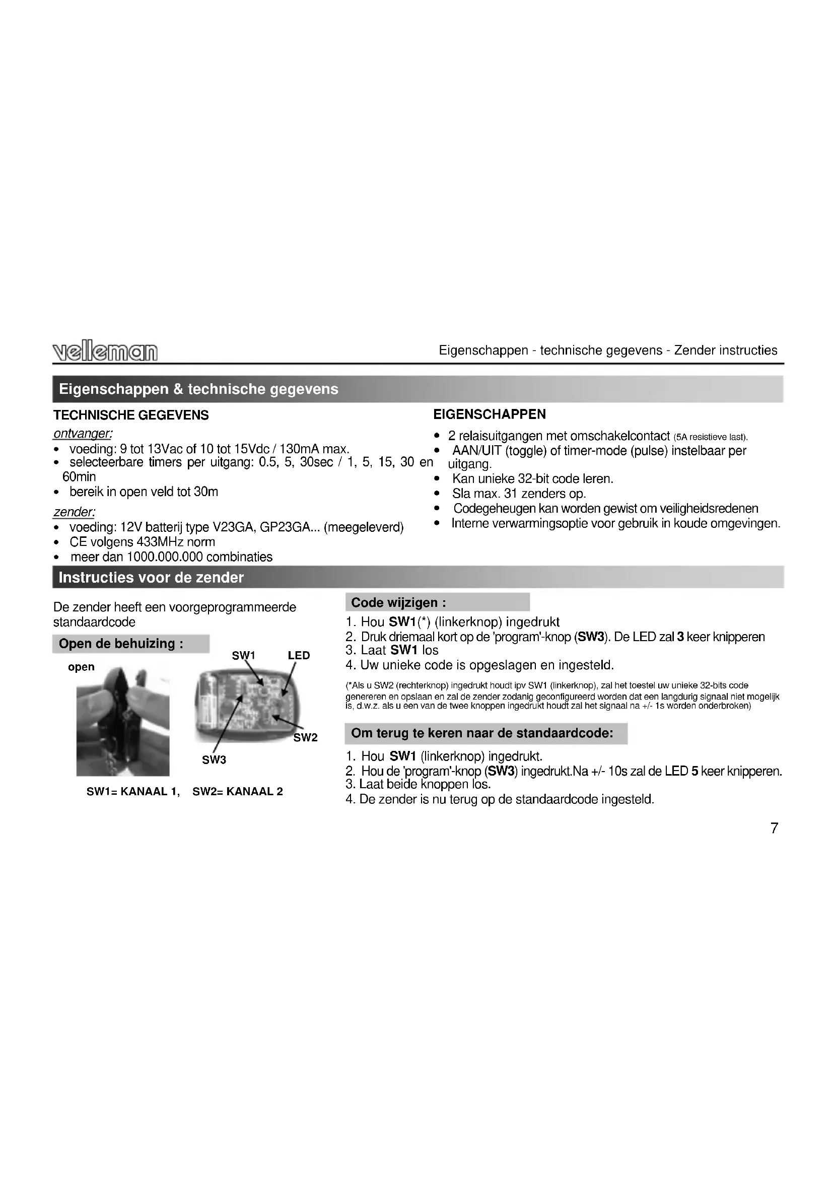 Onderbreek de voedingsspanning. Hou de 'setup'-knop ingedrukt. Schakel de spanning terug in. 'MODE' en ‘CONFIRM’ beginnen samen te knipperen. Laat 'setup' los nadat de LEDs niet meer knipperen. Deze procedure duurt ongeveer 10 seconden. Als de knop wordt losgelaten terwijl de LEDs nog knipperen, wordt het geheugen niet gewist. De unit zal vanaf nu enkel op de standaardcode reageren. Stel de zendercode terug naar de standaardcode. Om alle aangeleerde zendercodes uit het geheugen te verwijderen: OPMERKING : De zender gedurende minimum 2 seconden bedienen. De linkerknop op de zender stuurt de CH1 relais, de rechterknop de CH2 relais. Elke relais heeft een LED die zijn status weergeeft. In ‘0.5s timer’-mode zal een relais aangeschakeld blijven zolang de knop wordt ingedrukt. Als een timer ingesteld is voor een bepaald kanaal, zal de relais inschakelen wanneer de knop wordt ingedrukt en uitschakelen wanneer de ingestelde tijd is verstreken. Een timer kan altijd worden uitgeschakeld door nog eens op de knop te drukken. Zolang de timer loopt zal de overeenkomstige LED knipperen. In ‘AAN-UIT’-mode zal het relais omschakelen tussen AAN en UIT telkens een knop wordt ingedrukt. BELANGRIJK: Om de stroom bij nullast tot een minimum te herleiden, verwijder de verwarmingsjumper indien het toestel in de wagen gebruikt wordt. Gebruik: WAARBORG Dit produkt is gewaarborgd wat betreft gebreken in materialen en vakmanschap op het ogenblik van de aankoop en dit gedurende een periode van TWEE JAAR vanaf de aankoop. De waarborg geldt enkel indien het produkt voorgelegd wordt samen met het origineel aankoop bewijs. De verplichtingen van VELLEMAN N.V. beperken zich tot het herstellen van defecten of, naar vrije keuze van VELLEMAN N.V., tot het vervangen of herstellen van defecte onderdelen. Kosten en risico’s van transport; het wegnemen en terugplaatsen van het produkt, evenals om het even welke andere kosten die rechtstreeks of onrechtstreeks verband houden met de herstelling, worden niet door VELLE- MAN N.V. vergoed. VELLEMAN N.V. is niet verantwoordelijk voor schade van gelijk welke aard, veroorzaakt door het falen van een product. VM130G'1_rev3.pub page 9 Friday, January 25, 2013 11:0810 Caractéristiques - données techniques - Instructions pour l’émetteur Caractéristiques et données techniques Instructions pour l’émetteur CARACTERISTIQUES Deux sorties relais (charge résistive 5A) MARCHE/ARRET (toggle) ou mode timer (pulse) Apprentissage d'un code 32 bits unique. Programmation d'un max. de 31 émetteurs différents. Possibilité d'effacer la mémoire pour des raisons de sécurité. Option de chauffe du circuit pour usage dans des environne- ments froids DONNEES TECHNIQUES récepteur: alimentation: 9 à 13Vca ou 10 à 15Vcc / 130mA max. timers sélectionnables par sortie: 0.5, 5, 30sec / 1, 5, 15, 30 et 60min plage en plein air jusqu'à 30m. émetteur: alimentation: pile 12V de type V23GA, GP23GA... (incl.). CE selon la norme 433MHz. plus de 1000.000.000 combinaisons. L'émetteur est livré avec un code standard d'usine.