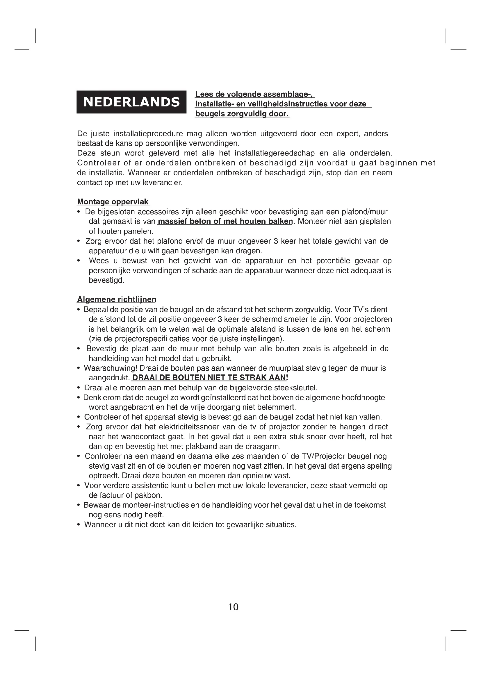 - Controleer na een maand en daarna elke zes maanden of de TV/Projector beugel nog stevig vast zit en of de bouten en moeren nog vast zitten. In het geval dat ergens speling optreedt. Draai deze bouten en moeren dan opnieuw vast.