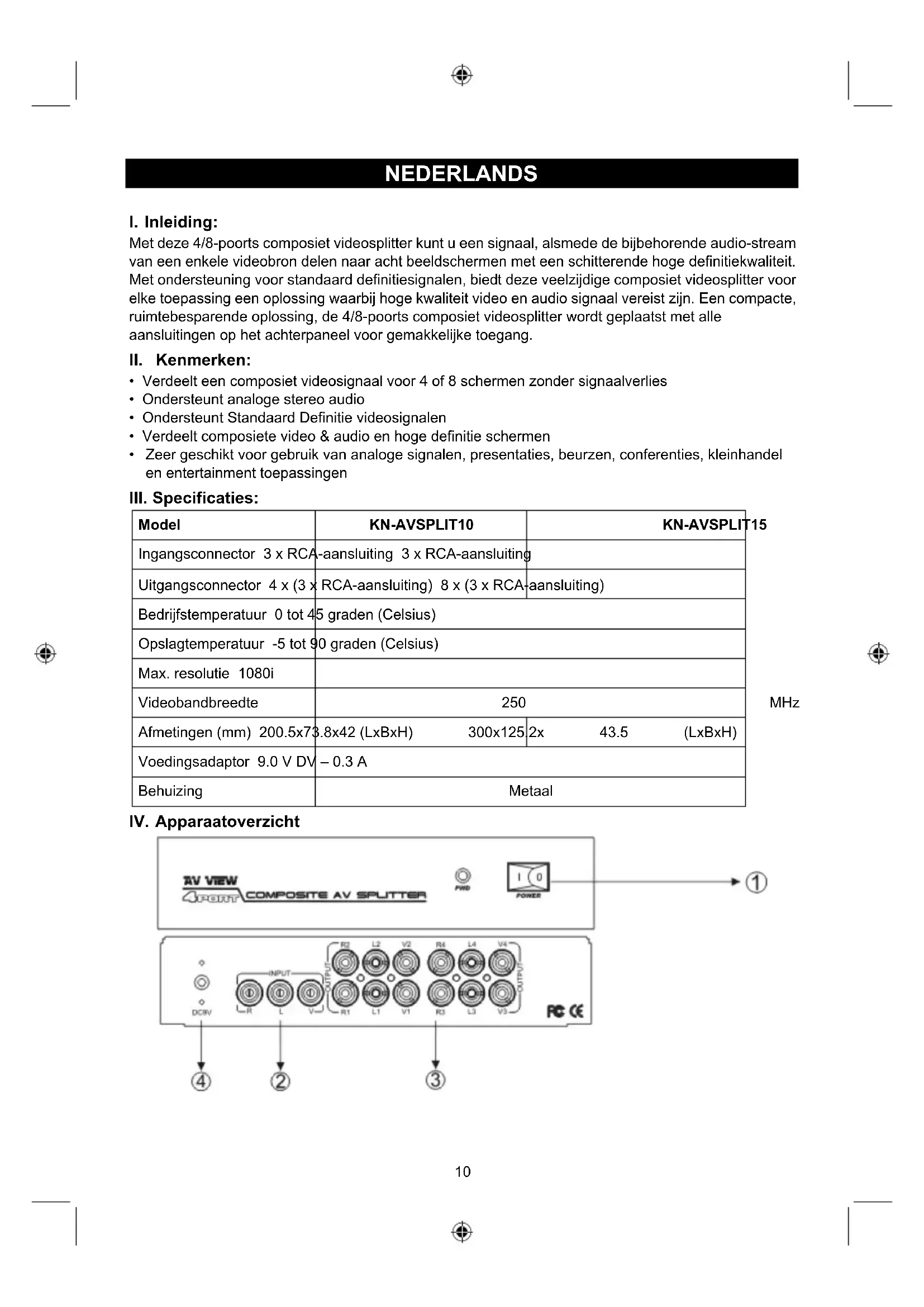 Model KN-AVSPLIT10 KN-AVSPLIT15 Ingangsconnector 3 x RCA-aansluiting 3 x RCA-aansluiting Uitgangsconnector 4 x (3 x RCA-aansluiting) 8 x (3 x RCA-aansluiting) Bedrijfstemperatuur 0 tot 45 graden (Celsius) Opslagtemperatuur -5 tot 90 graden (Celsius) Max. resolutie 1080i Videobandbreedte 250 MHz Afmetingen (mm) 200.5x73.8x42 (LxBxH) 300x125.2x 43.5 (LxBxH) Voedingsadaptor 9.0 V DV – 0.3 A Behuizing Metaal
