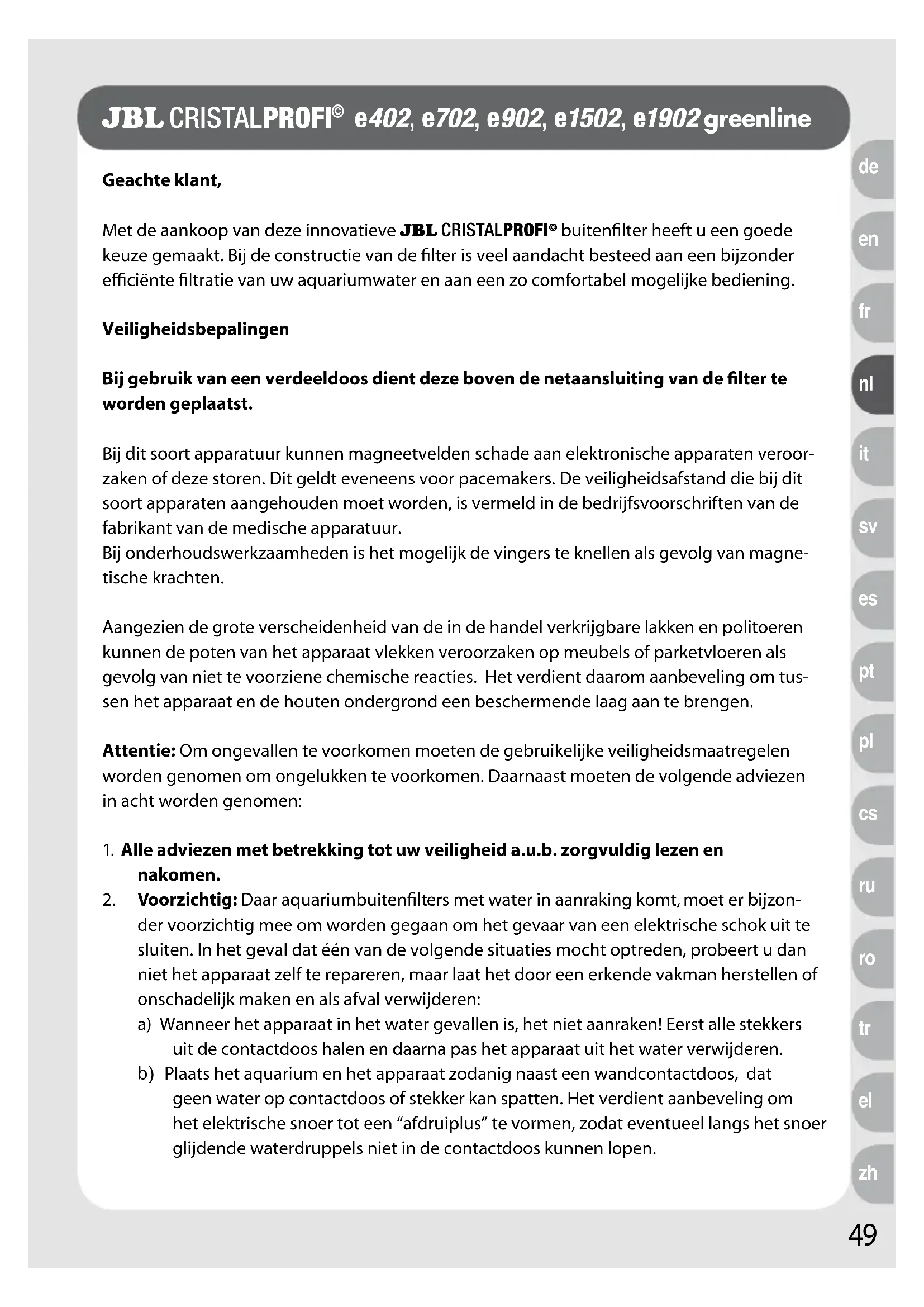 e-serie. JBL MicroMec - Biologische filterballetjes met een groot prestatievermogen JBL MicroMec is een zeer poreus biologisch filtermateriaal van gesinterd glas dat wegens zijn bijzondere oppervlakte- en poriestructuur de bezetting met nuttige bacteriën sterk begunstigt. Het zorgt voor een effectieve biologische afbraak van schadelijke stoffen en is daarom bijzonder geschikt voor een intensieve en langdurige biologische filteractiviteit in zoet- en zeewateraquaria. Keramische ringen (JBL CerMec) Mechanisch filtermateriaal dat ook biologisch werkt, omdat het nuttige bacteriën een goed leefmilieu biedt. Door de vorm van de ringen dient dit materiaal voornamelijk om de stroom water in alle richtingen te leiden en zo een optimale doorstroming van de filter te waarbor- gen. JBL TorMec - Pellets van actieve turf voor natuurlijk tropisch water JBL TorMec Pellets worden vervaardigd door twee turfcomponenten met een verschillend gehalte aan humusstoffen aan elkaar te persen. Zo wordt bereikt dat het middel van begin af aan werkt en dat het daarnaast een zorgvuldig uitgekiende langdurige werking heeft. Dank- zij het hoge gehalte aan humusstoffen verlaagt JBL TorMec de carbonaathardheid en de pH van het water. Het voorkomt het ontstaan van algen, omdat het water licht verkleurt, zodat bepaalde delen van het lichtspectrum worden uitgefilterd, zoals dat bij natuurlijk water in de tropen gebeurt.65 Garantie van de fabrikant De garantie wordt naast de wettelijke rechten van de klant tegenover de verkoper verleend op levering van goederen die vrij zijn van gebreken en betekent geen beper- king van de uit § 437 Duits burgerlijk wetboek voortvloeiende stelbare eisen wegens gebrekkige goederen. Wij, JBL GmbH & Co. KG, Dieselstr. 3, D-67141 Neuhofen, Germany, verlenen voor de hierna te noemen producten tegenover de eindafnemer een garantie van 2 jaar vanaf de datum van aankoop dat deze vrij zijn van gebreken en goed werken. Bovendien bieden wij de eindafnemer, nadat deze het product binnen de wettelijke garantietermijn van twee jaar bij https://www.jbl.de/productregistration heeft geregistreerd, een verdergaande garantie van 4 jaar gerekend vanaf de datum van aankoop voor het apparaat aan: JBL CristalProfi e402 greenline, JBL CristalProfi e702 greenline, JBL CristalProfi e902 greenline, JBL CristalProfi e1502 greenline, JBL CristalProfi e1902 greenline Van de garantie uitgesloten zijn slijtage-onderdelen, zoals bv. de ingebouwde afdich- tingsringen, de pompwaaier en assen. De garantie bestaat uit het repareren van defecte onderdelen door deze te vervangen (gratis levering van een vergelijkbaar product) of ze, rekening houdend met de tech- nische eisen aan het product, te herstellen, waarbij de keuze aan ons is. Voor de onderdelen die uit hoofde van de garantie gerepareerd of vervangen zijn, geldt de resterende garantietijd. De garantie omvat niet de vergoeding van directe of indirecte gevolgschade. De garantie geldt uitsluitend voor verkopen aan klanten binnen de Europese Unie. De garantie vervalt, wanneer het product door de klant zelf of door derden niet deskun- dig is gemonteerd, onderhouden of gereingd, opzettelijk is beschadigd of op welke wijze dan ook niet voor het doel waarvoor het bestemd is is gebruikt. Tijdens de geldigheidsduur van de garantie kunt u zich op vertoon van een geldig bewijs van aankoop tot uw dierenspeciaalzaak wenden of via http://www.jbl.de/nl/support----/service-klantenservice contact met ons opnemen.