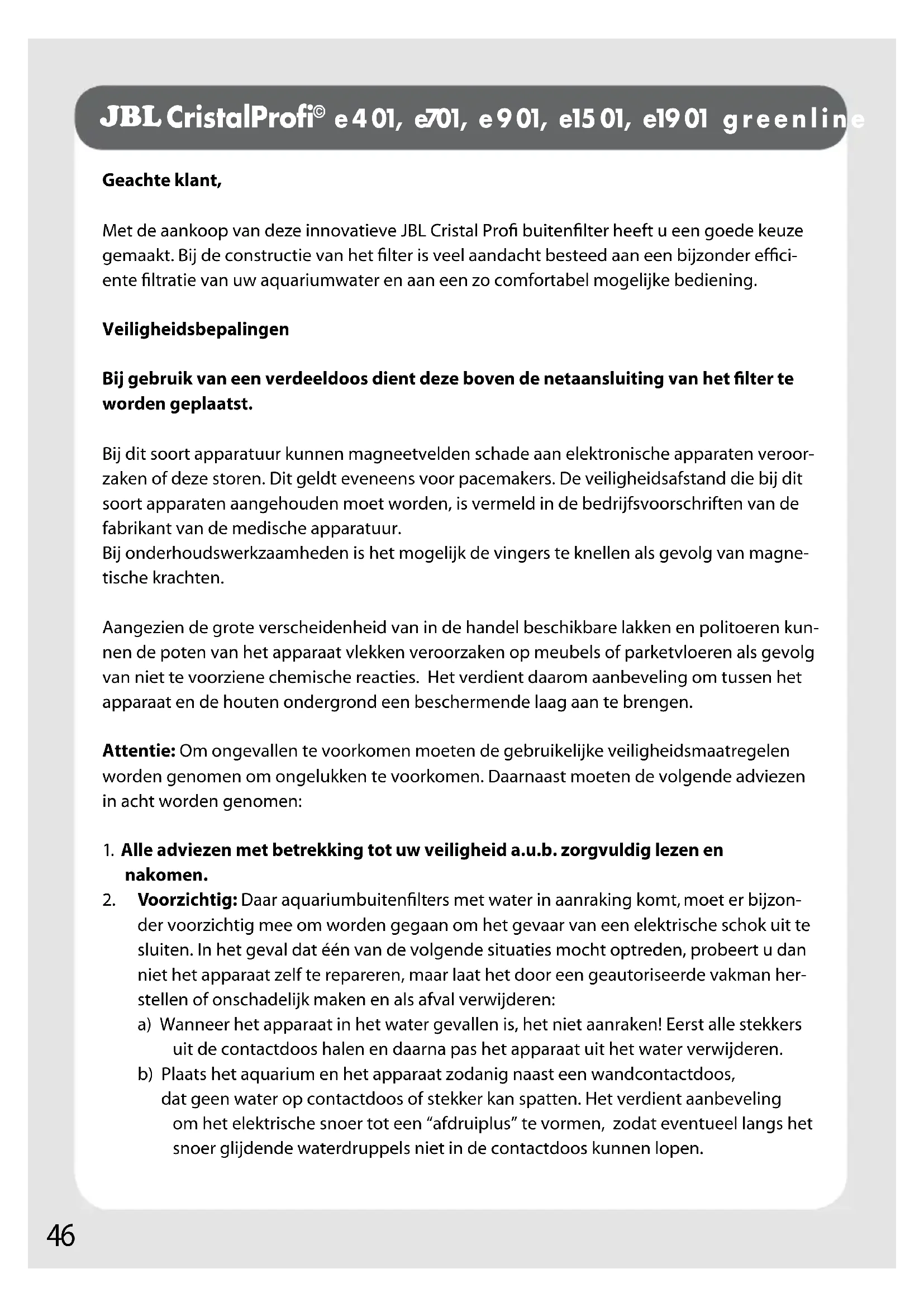 e 4 01, e701, e 9 01, e15 01, e19 01 g r e e n l i n e Geachte klant, Met de aankoop van deze innovatieve JBL Cristal Profi buitenfilter heeft u een goede keuze gemaakt. Bij de constructie van het filter is veel aandacht besteed aan een bijzonder effici- ente filtratie van uw aquariumwater en aan een zo comfortabel mogelijke bediening. Veiligheidsbepalingen Bij gebruik van een verdeeldoos dient deze boven de netaansluiting van het filter te worden geplaatst. Bij dit soort apparatuur kunnen magneetvelden schade aan elektronische apparaten veroor- zaken of deze storen. Dit geldt eveneens voor pacemakers. De veiligheidsafstand die bij dit soort apparaten aangehouden moet worden, is vermeld in de bedrijfsvoorschriften van de fabrikant van de medische apparatuur. Bij onderhoudswerkzaamheden is het mogelijk de vingers te knellen als gevolg van magne- tische krachten. Aangezien de grote verscheidenheid van in de handel beschikbare lakken en politoeren kun- nen de poten van het apparaat vlekken veroorzaken op meubels of parketvloeren als gevolg van niet te voorziene chemische reacties. Het verdient daarom aanbeveling om tussen het apparaat en de houten ondergrond een beschermende laag aan te brengen. Attentie: Om ongevallen te voorkomen moeten de gebruikelijke veiligheidsmaatregelen worden genomen om ongelukken te voorkomen. Daarnaast moeten de volgende adviezen in acht worden genomen: