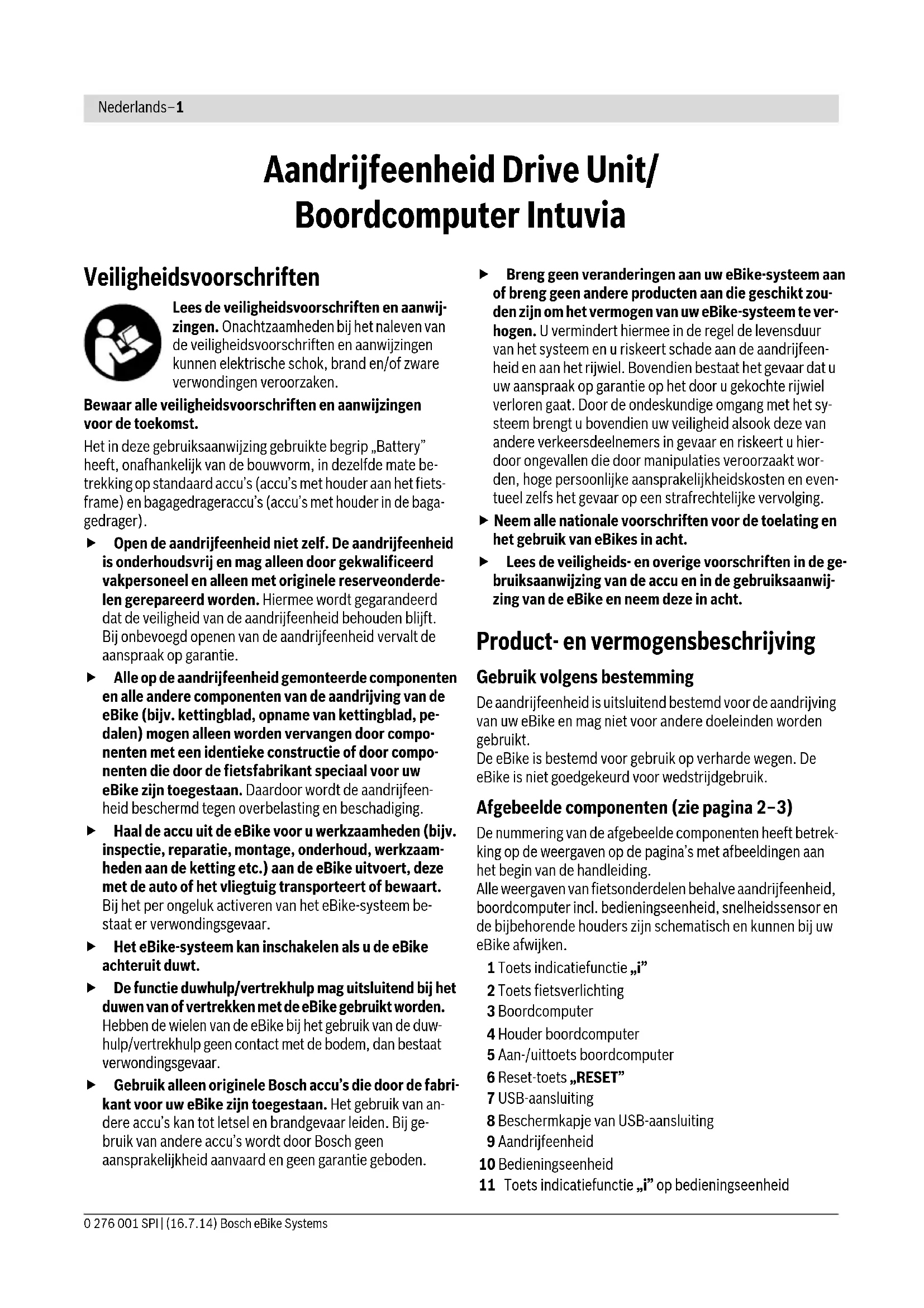 2,5 3,5 Numero degli elementi della batteria ricaricabile 30 –40 Temperatura di esercizio °C –5...+40 Temperatura di magazzino °C –10...+50 Peso in funzione della EPTA-Procedure 01/2003 kg 0,8 Tipo di protezione IP 40 I dati sono validi per una tensione nominale [U] di 230 V. In caso di ten- sioni differenti e di modelli specifici dei paesi di impiego, questi dati possono variare.Italiano–16 Bosch eBike Systems 0 276 001 SPI | (16.7.14) Staccare la stazione di ricarica dalla rete elettrica e la batteria ricaricabile dalla stazione di ricarica. Staccando la batteria ricaricabile dalla stazione di ricarica la batteria ricaricabile viene disattivata automaticamente. Nota bene: Se la batteria è stata ricaricata sulla bicicletta, al termine dell'operazione di ricarica coprire con cura la presa di carica C6 con la copertura C7, in modo che non possa pene- trare sporco o acqua. Se la stazione di ricarica non viene scollegata dalla batteria ri- caricabile dopo il processo di ricarica, dopo alcune ore la sta- zione di ricarica si riattiva, controlla lo stato di carica della bat- teria e, all'occorrenza, avvia nuovamente l'operazione di ricarica. Anomalie – cause e rimedi Manutenzione ed assistenza Manutenzione e pulizia Qualora la stazione di ricarica dovesse guastarsi rivolgersi ad un rivenditore autorizzato di biciclette. Assistenza clienti e consulenza impieghi Per tutte le domande relative alla stazione di ricarica rivolgersi ad un rivenditore autorizzato di biciclette. Le informazioni per contattare rivenditori autorizzati di bici- clette sono riportate sulla pagina web www.bosch-ebike.com Smaltimento Avviare ad un riciclaggio rispettoso dell’ambiente la stazione di ricarica, gli accessori dismessi e gli imballaggi. Non gettare tra i rifiuti domestici le stazioni di ricarica dismesse! Solo per i Paesi della CE: Conformemente alla norma della direttiva 2012/19/UE sui rifiuti di apparecchiature elettriche ed elettroniche (RAEE) ed all’at- tuazione del recepimento nel diritto nazio- nale, le stazioni di ricarica diventate inservi- bili devono essere raccolte separatamente ed essere inviate ad una riutilizzazione eco- logica. Con ogni riserva di modifiche tecniche. Causa Rimedi Due LED sulla batteria ricari- cabile lampeggiano Batteria ricaricabile difettosa Rivolgersi ad un rivenditore au- torizzato di biciclette Tre LED sulla batteria ricari- cabile lampeggiano Batteria ricaricabile troppo calda o troppo fredda Scollegare la batteria ricarica- bile dalla stazione di ricarica finché non viene raggiunto il campo ammesso della tempe- ratura di ricarica. Collegare di nuovo la batteria ri- caricabile alla stazione di ricari- ca solamente quando la stessa avrà raggiunto la temperatura di ricarica ammissibile. Operazione di ricarica impossibile (nessuna indicazione sulla batteria ricaricabile) Spina non inserita corret- tamente Controllare tutti i collegamenti a spina Contatti sulla batteria ricaricabile sporchi Pulire con cautela i contatti sulla batteria ricaricabile Presa, cavo o stazione di ricarica difettosi Controllare la tensione di rete, fare controllare la stazione di ricarica da un rivenditore di biciclette Batteria ricaricabile difettosa Rivolgersi ad un rivenditore autorizzato di bicicletteNederlands–1 0 276 001 SPI | (16.7.14) Bosch eBike Systems Aandrijfeenheid Drive Unit/ Boordcomputer Intuvia Veiligheidsvoorschriften Lees de veiligheidsvoorschriften en aanwij- zingen. Onachtzaamheden bij het naleven van de veiligheidsvoorschriften en aanwijzingen kunnen elektrische schok, brand en/of zware verwondingen veroorzaken. Bewaar alle veiligheidsvoorschriften en aanwijzingen voor de toekomst. Het in deze gebruiksaanwijzing gebruikte begrip „Battery” heeft, onafhankelijk van de bouwvorm, in dezelfde mate be- trekking op standaard accu’s (accu’s met houder aan het fiets- frame) en bagagedrageraccu’s (accu’s met houder in de baga- gedrager). Open de aandrijfeenheid niet zelf. De aandrijfeenheid is onderhoudsvrij en mag alleen door gekwalificeerd vakpersoneel en alleen met originele reserveonderde- len gerepareerd worden. Hiermee wordt gegarandeerd dat de veiligheid van de aandrijfeenheid behouden blijft. Bij onbevoegd openen van de aandrijfeenheid vervalt de aanspraak op garantie. Alle op de aandrijfeenheid gemonteerde componenten en alle andere componenten van de aandrijving van de eBike (bijv. kettingblad, opname van kettingblad, pe- dalen) mogen alleen worden vervangen door compo- nenten met een identieke constructie of door compo- nenten die door de fietsfabrikant speciaal voor uw eBike zijn toegestaan. Daardoor wordt de aandrijfeen- heid beschermd tegen overbelasting en beschadiging. Haal de accu uit de eBike voor u werkzaamheden (bijv. inspectie, reparatie, montage, onderhoud, werkzaam- heden aan de ketting etc.) aan de eBike uitvoert, deze met de auto of het vliegtuig transporteert of bewaart. Bij het per ongeluk activeren van het eBike-systeem be- staat er verwondingsgevaar. Het eBike-systeem kan inschakelen als u de eBike achteruit duwt. De functie duwhulp/vertrekhulp mag uitsluitend bij het duwen van of vertrekken met de eBike gebruikt worden. Hebben de wielen van de eBike bij het gebruik van de duw- hulp/vertrekhulp geen contact met de bodem, dan bestaat verwondingsgevaar. Gebruik alleen originele Bosch accu’s die door de fabri- kant voor uw eBike zijn toegestaan. Het gebruik van an- dere accu’s kan tot letsel en brandgevaar leiden. Bij ge- bruik van andere accu’s wordt door Bosch geen aansprakelijkheid aanvaard en geen garantie geboden. Breng geen veranderingen aan uw eBike-systeem aan of breng geen andere producten aan die geschikt zou- den zijn om het vermogen van uw eBike-systeem te ver- hogen. U vermindert hiermee in de regel de levensduur van het systeem en u riskeert schade aan de aandrijfeen- heid en aan het rijwiel. Bovendien bestaat het gevaar dat u uw aanspraak op garantie op het door u gekochte rijwiel verloren gaat. Door de ondeskund