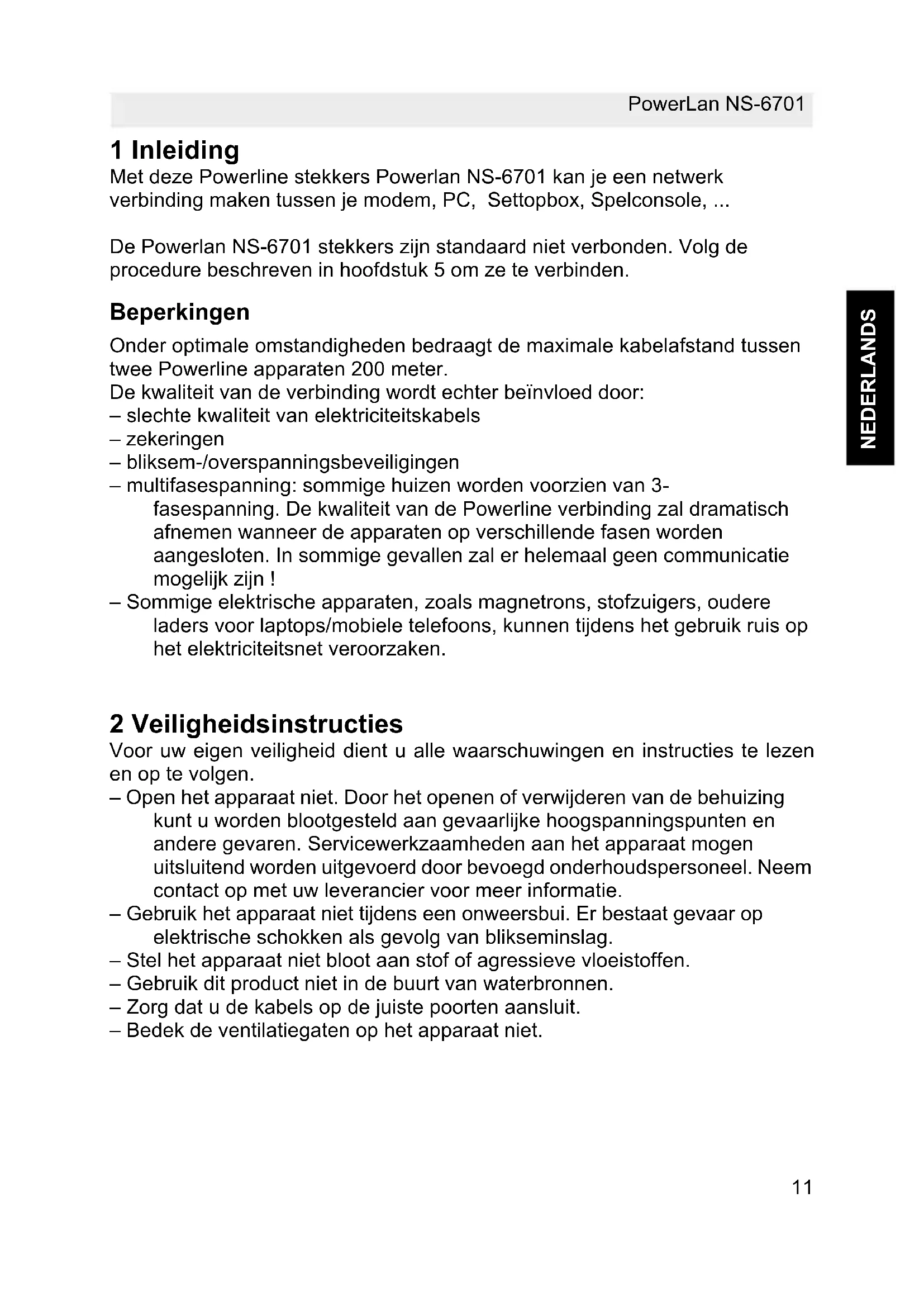 NEDERLANDS 1 Inleiding Met deze Powerline stekkers Powerlan NS-6701 kan je een netwerk verbinding maken tussen je modem, PC, Settopbox, Spelconsole, ... De Powerlan NS-6701 stekkers zijn standaard niet verbonden. Volg de procedure beschreven in hoofdstuk 5 om ze te verbinden. Beperkingen Onder optimale omstandigheden bedraagt de maximale kabelafstand tussen twee Powerline apparaten 200 meter. De kwaliteit van de verbinding wordt echter beïnvloed door: – slechte kwaliteit van elektriciteitskabels – zekeringen – bliksem-/overspanningsbeveiligingen – multifasespanning: sommige huizen worden voorzien van 3- fasespanning. De kwaliteit van de Powerline verbinding zal dramatisch afnemen wanneer de apparaten op verschillende fasen worden aangesloten. In sommige gevallen zal er helemaal geen communicatie mogelijk zijn ! – Sommige elektrische apparaten, zoals magnetrons, stofzuigers, oudere laders voor laptops/mobiele telefoons, kunnen tijdens het gebruik ruis op het elektriciteitsnet veroorzaken. 2 Veiligheidsinstructies Voor uw eigen veiligheid dient u alle waarschuwingen en instructies te lezen en op te volgen. – Open het apparaat niet. Door het openen of verwijderen van de behuizing kunt u worden blootgesteld aan gevaarlijke hoogspanningspunten en andere gevaren. Servicewerkzaamheden aan het apparaat mogen uitsluitend worden uitgevoerd door bevoegd onderhoudspersoneel. Neem contact op met uw leverancier voor meer informatie. – Gebruik het apparaat niet tijdens een onweersbui. Er bestaat gevaar op elektrische schokken als gevolg van blikseminslag. – Stel het apparaat niet bloot aan stof of agressieve vloeistoffen. – Gebruik dit product niet in de buurt van waterbronnen. – Zorg dat u de kabels op de juiste poorten aansluit. – Bedek de ventilatiegaten op het apparaat niet.PowerLan NS-6701