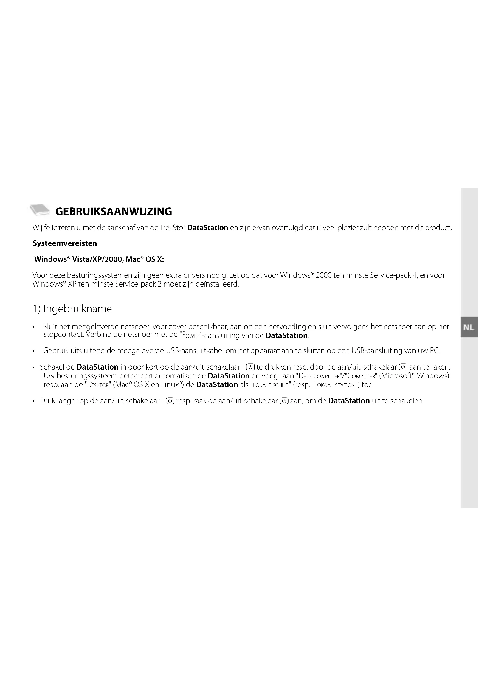GEBRUIKSAANWIJZING Wij feliciteren u met de aanschaf van de TrekStor DataStation en zijn ervan overtuigd dat u veel plezier zult hebben met dit product. Systeemvereisten Windows® Vista/XP/2000, Mac® OS X: Voor deze besturingssystemen zijn geen extra drivers nodig. Let op dat voor Windows® 2000 ten minste Service-pack 4, en voor Windows® XP ten minste Service-pack 2 moet zijn geïnstalleerd.