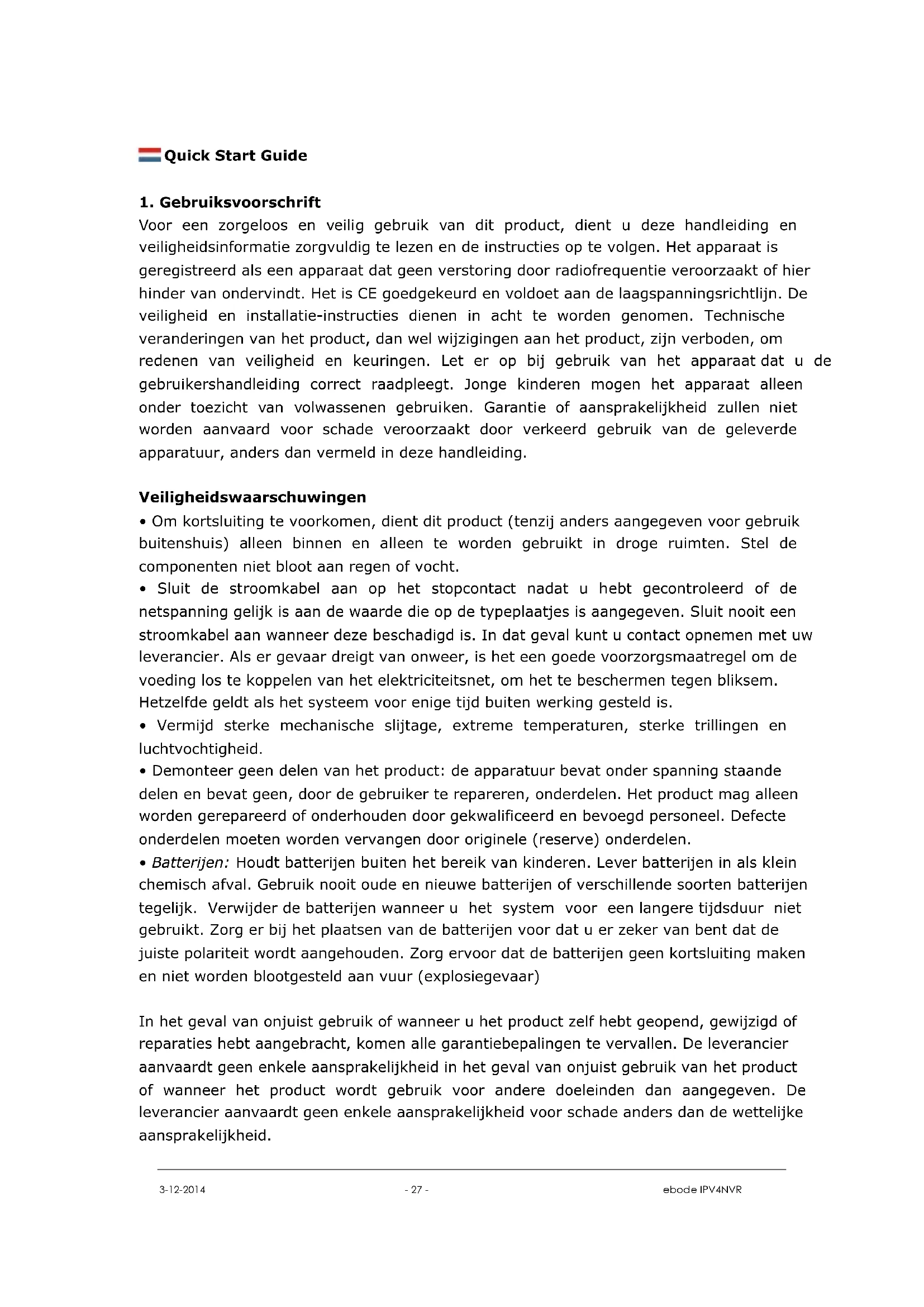- Batterijen: Houdt batterijen buiten het bereik van kinderen. Lever batterijen in als klein chemisch afval. Gebruik nooit oude en nieuwe batterijen of verschillende soorten batterijen tegelijk. Verwijder de batterijen wanneer u het system voor een langere tijdsduur niet gebruikt. Zorg er bij het plaatsen van de batterijen voor dat u er zeker van bent dat de juiste polariteit wordt aangehouden. Zorg ervoor dat de batterijen geen kortsluiting maken en niet worden blootgesteld aan vuur (explosiegevaar) In het geval van onjuist gebruik of wanneer u het product zelf hebt geopend, gewijzigd of reparaties hebt aangebracht, komen alle garantiebepalingen te vervallen. De leverancier aanvaardt geen enkele aansprakelijkheid in het geval van onjuist gebruik van het product of wanneer het product wordt gebruik voor andere doeleinden dan aangegeven. De leverancier aanvaardt geen enkele aansprakelijkheid voor schade anders dan de wettelijke aansprakelijkheid.3-12-2014 - 28 - ebode IPV4NVR