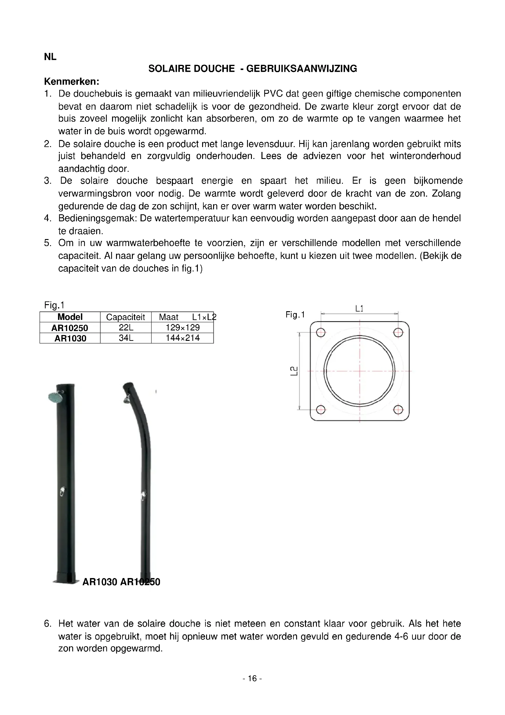 - Het water van de solaire douche is nicht meteen en constant maar voor gebruik. Als het het water is opgebruikt,要去hijnopnieuw met water worden gemvuld en gedurende 4-6uur door dezon worden opgewarmd.