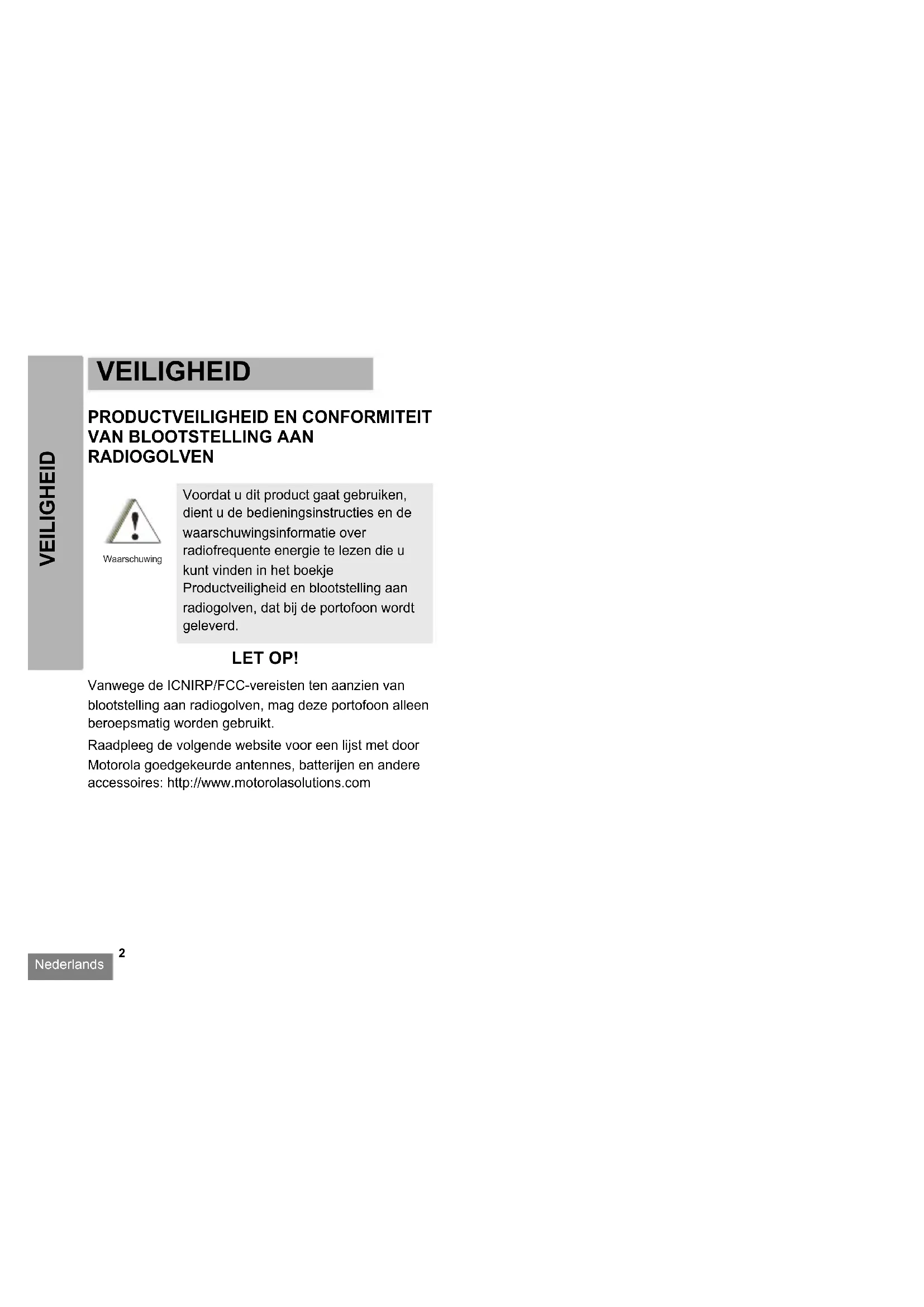 RADIOGOLVEN LET OP! Vanwege de ICNIRP/FCC-vereisten ten aanzien van blootstelling aan radiogolven, mag deze portofoon alleen beroepsmatig worden gebruikt. Raadpleeg de volgende website voor een lijst met door Motorola goedgekeurde antennes, batterijen en andere accessoires: http://www.motorolasolutions.com Voordat u dit product gaat gebruiken, dient u de bedieningsinstructies en de waarschuwingsinformatie over radiofrequente energie te lezen die u kunt vinden in het boekje Productveiligheid en blootstelling aan radiogolven, dat bij de portofoon wordt geleverd. WaarschuwingNederlands