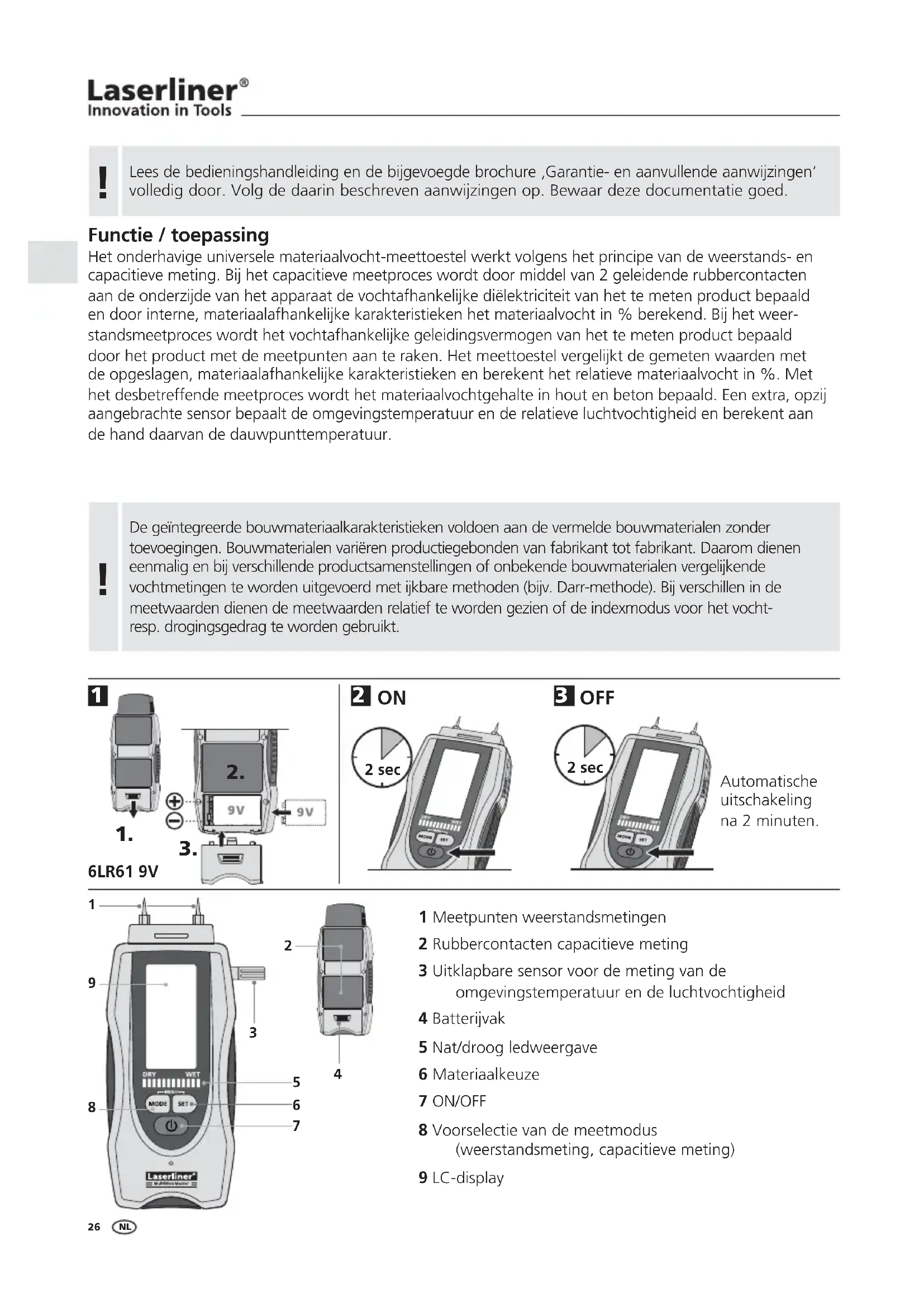 Automatische uitschakeling na 2 minuten. De geïntegreerde bouwmateriaalkarakteristieken voldoen aan de vermelde bouwmaterialen zonder toevoegingen. Bouwmaterialen variëren productiegebonden van fabrikant tot fabrikant. Daarom dienen eenmalig en bij verschillende productsamenstellingen of onbekende bouwmaterialen vergelijkende vochtmetingen te worden uitgevoerd met ijkbare methoden (bijv. Darr-methode). Bij verschillen in de meetwaarden dienen de meetwaarden relatief te worden gezien of de indexmodus voor het vocht- resp. drogingsgedrag te worden gebruikt.