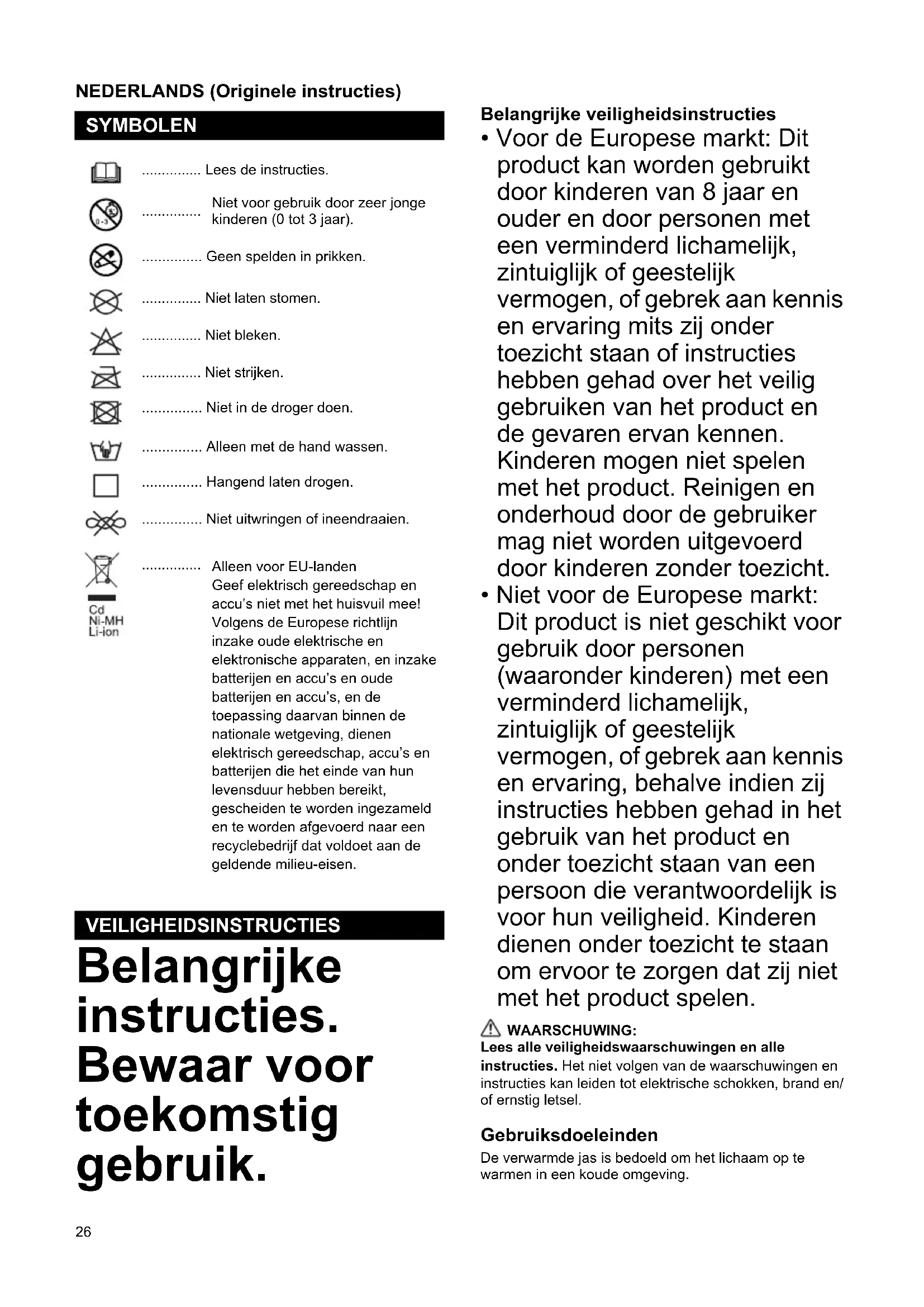 - Niet voor de Europese markt: Dit product is niet geschikt voor gebruik door personen (waaronder kinderen) met een verminderd lichamelijk, zintuiglijk of geestelijk vermogen, of gebrek aan kennis en ervaring, behalve indien zij instructies hebben gehad in het gebruik van het product en onder toezicht staan van een persoon die verantwoordelijk is voor hun veiligheid. Kinderen dienen onder toezicht te staan om ervoor te zorgen dat zij niet met het product spelen. WAARSCHUWING: Lees alle veiligheidswaarschuwingen en alle instructies. Het niet volgen van de waarschuwingen en instructies kan leiden tot elektrische schokken, brand en/ of ernstig letsel. Gebruiksdoeleinden De verwarmde jas is bedoeld om het lichaam op te warmen in een koude omgeving. SYMBOLEN ............... Lees de instructies.