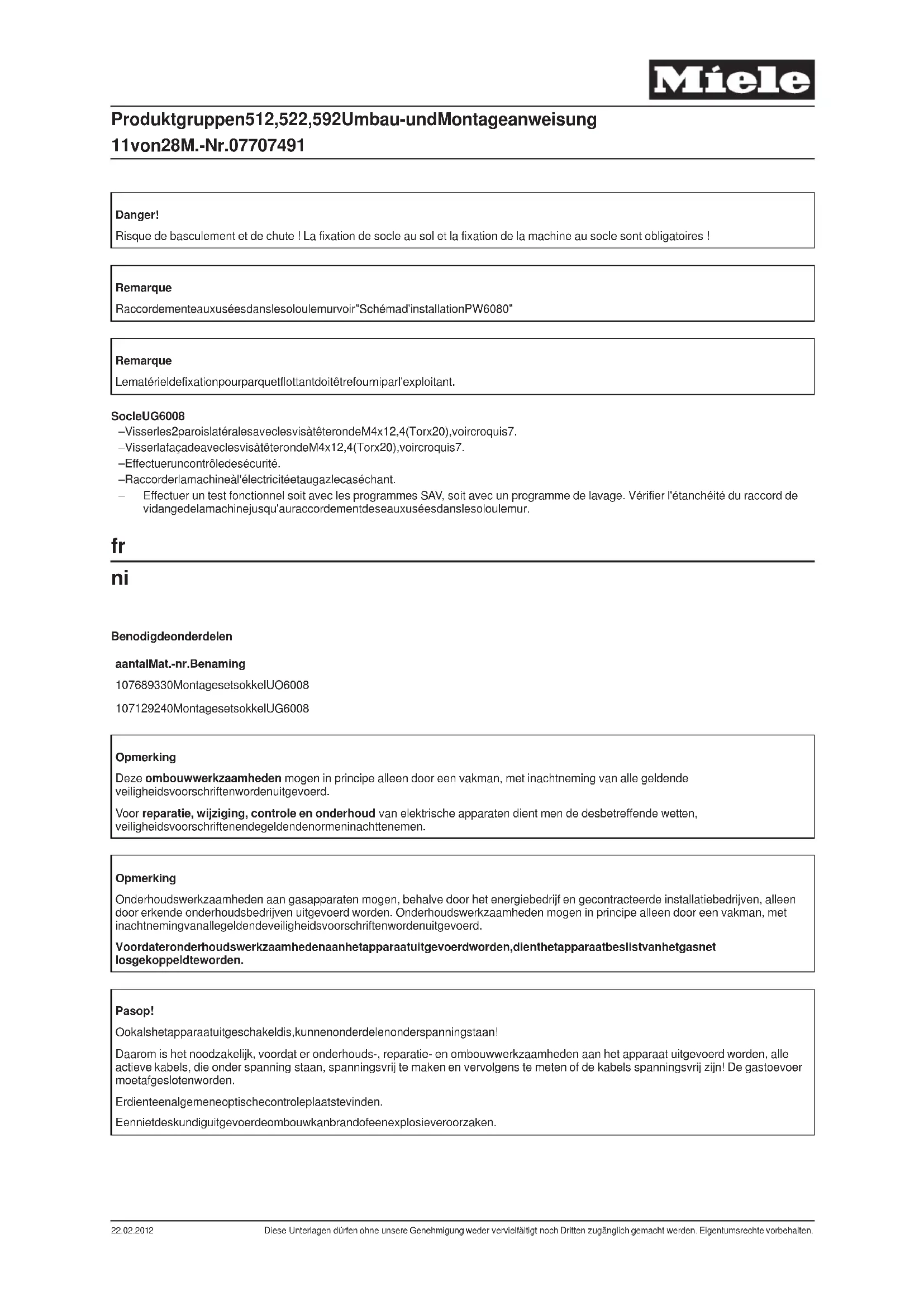 aantal Mat.-nr. Benaming 1 07689330 Montageset sokkel UO 6008 1 07129240 Montageset sokkel UG 6008 Opmerking Deze ombouwwerkzaamheden mogen in principe alleen door een vakman, met inachtneming van alle geldende veiligheidsvoorschriften worden uitgevoerd. Voor reparatie, wijziging, controle en onderhoud van elektrische apparaten dient men de desbetreffende wetten, veiligheidsvoorschriften en de geldende normen in acht te nemen. Opmerking Onderhoudswerkzaamheden aan gasapparaten mogen, behalve door het energiebedrijf en gecontracteerde installatiebedrijven, alleen door erkende onderhoudsbedrijven uitgevoerd worden. Onderhoudswerkzaamheden mogen in principe alleen door een vakman, met inachtneming van alle geldende veiligheidsvoorschriften worden uitgevoerd. Voordat er onderhoudswerkzaamheden aan het apparaat uitgevoerd worden, dient het apparaat beslist van het gasnet losgekoppeld te worden. Pas op! Ook als het apparaat uitgeschakeld is, kunnen onderdelen onder spanning staan! Daarom is het noodzakelijk, voordat er onderhouds-, reparatie- en ombouwwerkzaamheden aan het apparaat uitgevoerd worden, alle actieve kabels, die onder spanning staan, spanningsvrij te maken en vervolgens te meten of de kabels spanningsvrij zijn! De gastoevoer moet afgesloten worden. Er dient een algemene optische controle plaats te vinden. Een niet deskundig uitgevoerde ombouw kan brand of een explosie veroorzaken. Produktgruppen 512, 522, 592 Umbau- und Montageanweisung 11 von 28 M.-Nr. 07707491 22.02.2012 Diese Unterlagen dürfen ohne unsere Genehmigung weder vervielfältigt noch Dritten zugänglich gemacht werden. Eigentumsrechte vorbehalten.Pas op! Gevaar voor verwondingen bij de montage