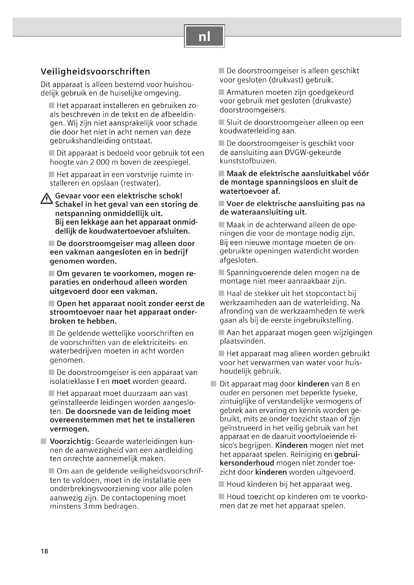 Veiligheidsvoorschriften Dit apparaat is alleen bestemd voor huishou- delijk gebruik en de huiselijke omgeving. ■ Het apparaat installeren en gebruiken zo- als beschreven in de tekst en de afbeeldin- gen. Wij zijn niet aansprakelijk voor schade die door het niet in acht nemen van deze gebruikshandleiding ontstaat. ■ Dit apparaat is bedoeld voor gebruik tot een hoogte van 2 000 m boven de zeespiegel. ■ Het apparaat in een vorstvrije ruimte in- stalleren en opslaan (restwater). Gevaar voor een elektrische schok! Schakel in het geval van een storing de netspanning onmiddellijk uit. Bij een lekkage aan het apparaat onmid- dellijk de koudwatertoevoer afsluiten. ■ De doorstroomgeiser mag alleen door een vakman aangesloten en in bedrijf genomen worden. ■ Om gevaren te voorkomen, mogen re- paraties en onderhoud alleen worden uitgevoerd door een vakman. ■ Open het apparaat nooit zonder eerst de stroomtoevoer naar het apparaat onder- broken te hebben. ■ De geldende wettelijke voorschriften en de voorschriften van de elektriciteits- en waterbedrijven moeten in acht worden genomen. ■ De doorstroomgeiser is een apparaat van isolatieklasse I en moet worden geaard. ■ Het apparaat moet duurzaam aan vast geïnstalleerde leidingen worden aangeslo- ten. De doorsnede van de leiding moet overeenstemmen met het te installeren vermogen. ■ Voorzichtig: Geaarde waterleidingen kun- nen de aanwezigheid van een aardleiding ten onrechte aannemelijk maken. ■ Om aan de geldende veiligheidsvoorschrif- ten te voldoen, moet in de installatie een onderbrekingsvoorziening voor alle polen aanwezig zijn. De contactopening moet minstens 3 mm bedragen. ■ De doorstroomgeiser is alleen geschikt voor gesloten (drukvast) gebruik. ■ Armaturen moeten zijn goedgekeurd voor gebruik met gesloten (drukvaste) doorstroomgeisers. ■ Sluit de doorstroomgeiser alleen op een koudwaterleiding aan. ■ De doorstroomgeiser is geschikt voor de aansluiting aan DVGW-gekeurde kunststofbuizen. ■ Maak de elektrische aansluitkabel vóór de montage spanningsloos en sluit de watertoevoer af. ■ Voer de elektrische aansluiting pas na de wateraansluiting uit. ■ Maak in de achterwand alleen de ope- ningen die voor de montage nodig zijn. Bij een nieuwe montage moeten de on- gebruikte openingen waterdicht worden afgesloten. ■ Spanningvoerende delen mogen na de montage niet meer aanraakbaar zijn. ■ Haal de stekker uit het stopcontact bij werkzaamheden aan de waterleiding. Na afronding van de werkzaamheden te werk gaan als bij de eerste ingebruikstelling. ■ Aan het apparaat mogen geen wijzigingen plaatsvinden. ■ Het apparaat mag alleen worden gebruikt voor het verwarmen van water voor huis- houdelijk gebruik. ■ Dit apparaat mag door kinderen van 8 en ouder en personen met beperkte fysieke, zintuiglijke of verstandelijke vermogens of gebrek aan ervaring en kennis worden ge- bruikt, mits ze onder toezicht staan of zijn geïnstrueerd in het veilig gebruik van het apparaat en de daaruit voortvloeiende ri- sico’s begrijpen. Kinderen mogen niet met het apparaat spelen. Reiniging en gebrui- kersonderhoud mogen niet zonder toe- zicht door kinderen worden uitgevoerd. ■ Houd kinderen bij het apparaat weg. ■ Houd toezicht op kinderen om te voorko- men dat ze met het apparaat spelen.19