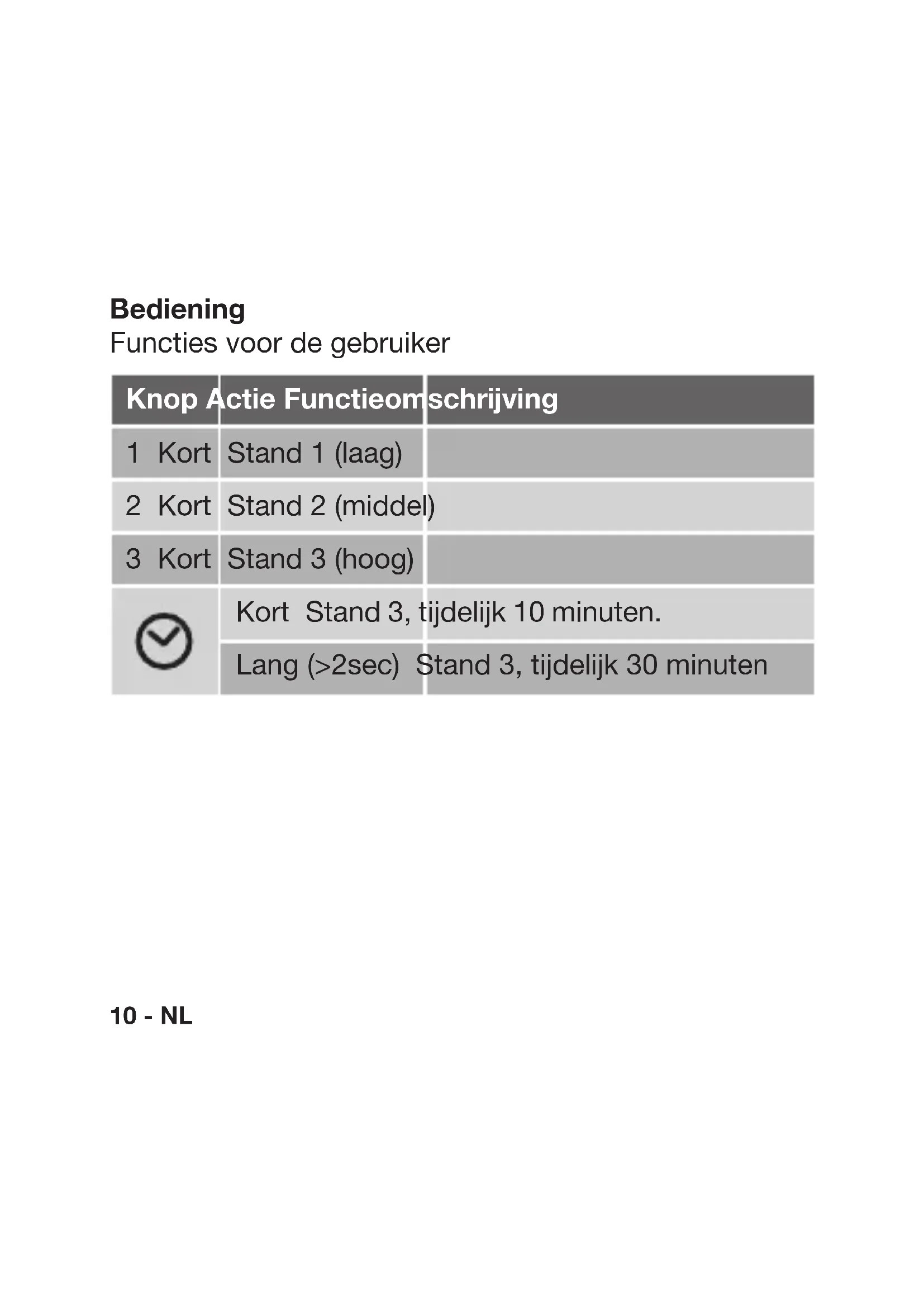 Fig.710 - NL Bediening Functies voor de gebruiker Knop Actie Functieomschrijving 1 Kort Stand 1 (laag) 2 Kort Stand 2 (middel) 3 Kort Stand 3 (hoog) Kort Stand 3, tijdelijk 10 minuten. Lang (>2sec) Stand 3, tijdelijk 30 minutenNL - 11 Functies voor de installateur Afstemming tussen de InventiBox en de InventiBediening RF Standaard 1 of meerdere InventiBedieningen RF op 1 InventiBox