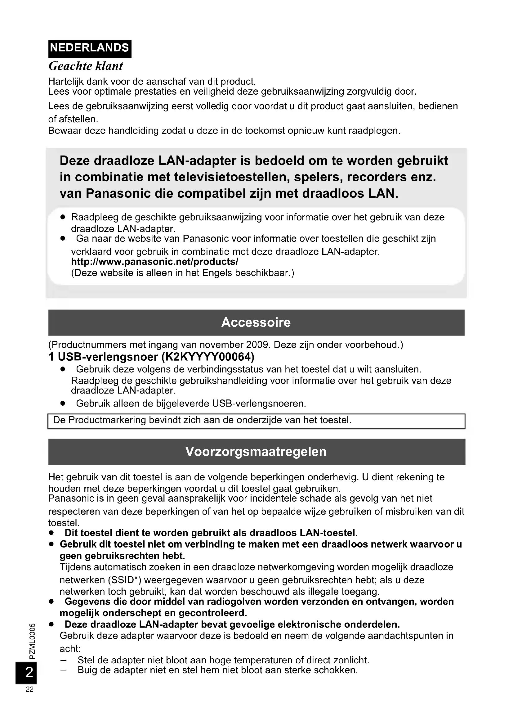 DY-WL10_E.book 21 ページ 2009年12月8日 火曜日 午後3時43分22 PZML0005 Geachte klant Hartelijk dank voor de aanschaf van dit product. Lees voor optimale prestaties en veiligheid deze gebruiksaanwijzing zorgvuldig door. Lees de gebruiksaanwijzing eerst volledig door voordat u dit product gaat aansluiten, bedienen of afstellen. Bewaar deze handleiding zodat u deze in de toekomst opnieuw kunt raadplegen. Deze draadloze LAN-adapter is bedoeld om te worden gebruikt in combinatie met televisietoestellen, spelers, recorders enz. van Panasonic die compatibel zijn met draadloos LAN. (Productnummers met ingang van november 2009. Deze zijn onder voorbehoud.) 1 USB-verlengsnoer (K2KYYYY00064) ≥ Gebruik deze volgens de verbindingsstatus van het toestel dat u wilt aansluiten. Raadpleeg de geschikte gebruikshandleiding voor informatie over het gebruik van deze draadloze LAN-adapter. ≥ Gebruik alleen de bijgeleverde USB-verlengsnoeren. Het gebruik van dit toestel is aan de volgende beperkingen onderhevig. U dient rekening te houden met deze beperkingen voordat u dit toestel gaat gebruiken. Panasonic is in geen geval aansprakelijk voor incidentele schade als gevolg van het niet respecteren van deze beperkingen of van het op bepaalde wijze gebruiken of misbruiken van dit toestel. ≥ Dit toestel dient te worden gebruikt als draadloos LAN-toestel. ≥ Gebruik dit toestel niet om verbinding te maken met een draadloos netwerk waarvoor u geen gebruiksrechten hebt. Tijdens automatisch zoeken in een draadloze netwerkomgeving worden mogelijk draadloze netwerken (SSID*) weergegeven waarvoor u geen gebruiksrechten hebt; als u deze netwerken toch gebruikt, kan dat worden beschouwd als illegale toegang. ≥ Gegevens die door middel van radiogolven worden verzonden en ontvangen, worden mogelijk onderschept en gecontroleerd. ≥ Deze draadloze LAN-adapter bevat gevoelige elektronische onderdelen. Gebruik deze adapter waarvoor deze is bedoeld en neem de volgende aandachtspunten in acht: j Stel de adapter niet bloot aan hoge temperaturen of direct zonlicht. j Buig de adapter niet en stel hem niet bloot aan sterke schokken. ≥ Raadpleeg de geschikte gebruiksaanwijzing voor informatie over het gebruik van deze draadloze LAN-adapter. ≥ Ga naar de website van Panasonic voor informatie over toestellen die geschikt zijn verklaard voor gebruik in combinatie met deze draadloze LAN-adapter. http://www.panasonic.net/products/ (Deze website is alleen in het Engels beschikbaar.) Accessoire De Productmarkering bevindt zich aan de onderzijde van het toestel. Voorzorgsmaatregelen NEDERLANDS