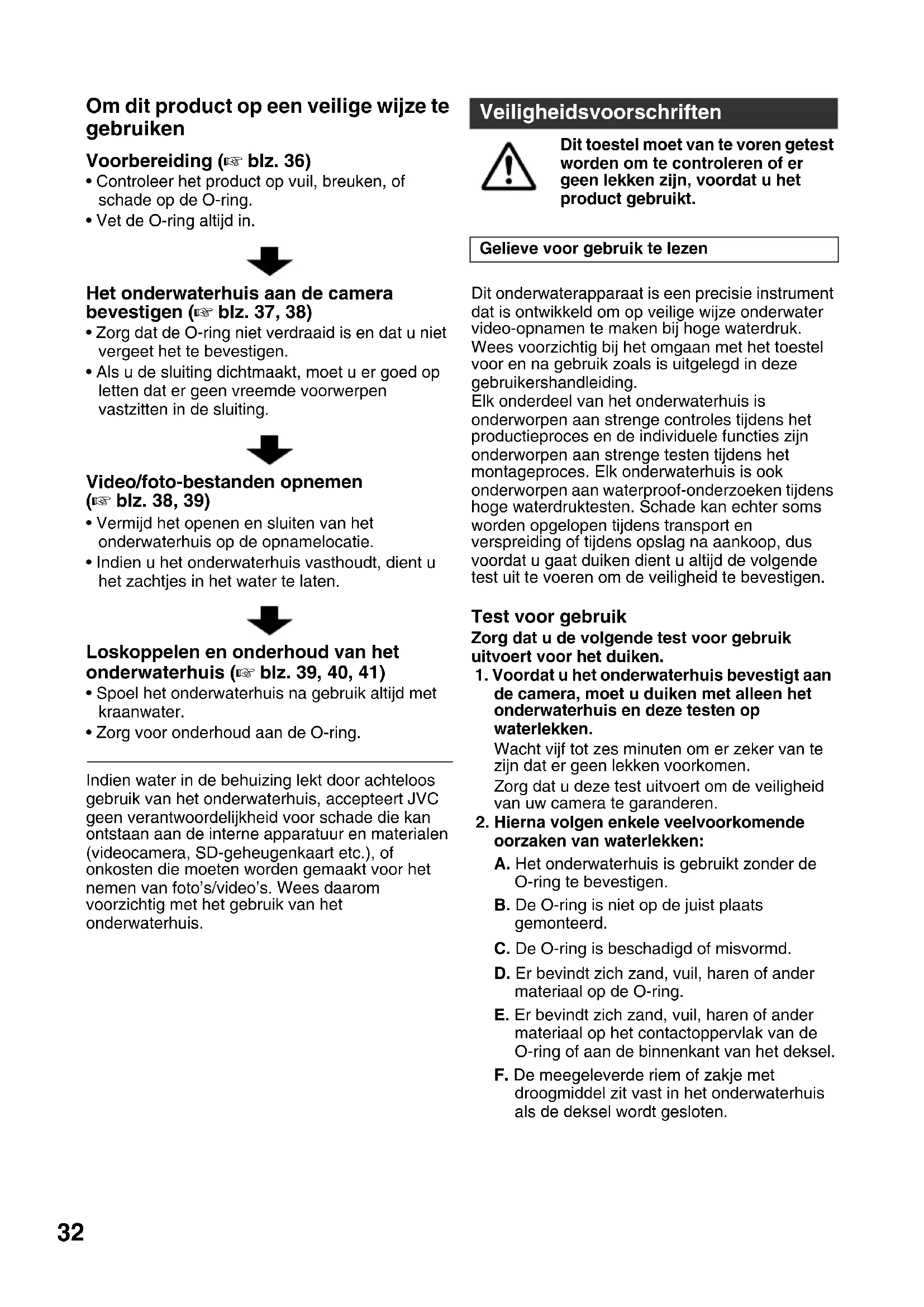 - Zorg voor onderhoud aan de O-ring. Indien water in de behuizing lekt door achteloos gebruik van het onderwaterhuis, accepteert JVC geen verantwoordelijkheid voor schade die kan ontstaan aan de interne apparatuur en materialen (videocamera, SD-geheugenkaart etc.), of onkosten die moeten worden gemaakt voor het nemen van foto’s/video’s. Wees daarom voorzichtig met het gebruik van het onderwaterhuis. Dit toestel moet van te voren getest worden om te controleren of er geen lekken zijn, voordat u het product gebruikt. Dit onderwaterapparaat is een precisie instrument dat is ontwikkeld om op veilige wijze onderwater video-opnamen te maken bij hoge waterdruk. Wees voorzichtig bij het omgaan met het toestel voor en na gebruik zoals is uitgelegd in deze gebruikershandleiding. Elk onderdeel van het onderwaterhuis is onderworpen aan strenge controles tijdens het productieproces en de individuele functies zijn onderworpen aan strenge testen tijdens het montageproces. Elk onderwaterhuis is ook onderworpen aan waterproof-onderzoeken tijdens hoge waterdruktesten. Schade kan echter soms worden opgelopen tijdens transport en verspreiding of tijdens opslag na aankoop, dus voordat u gaat duiken dient u altijd de volgende test uit te voeren om de veiligheid te bevestigen. Test voor gebruik Zorg dat u de volgende test voor gebruik uitvoert voor het duiken.