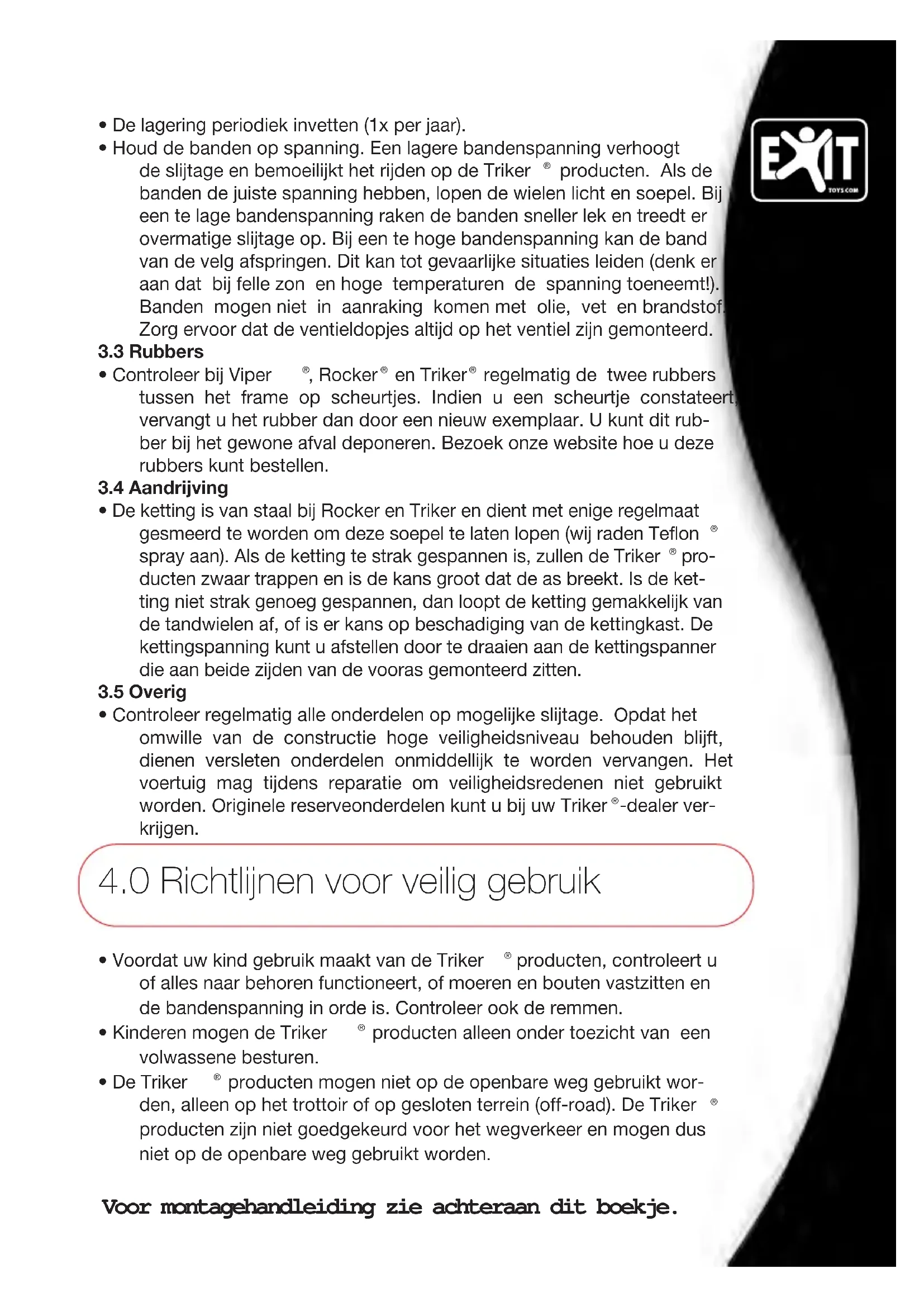 De Triker® producten dienen door een volwassene gemonteerd te worden die op de hoogte is van de informatie over veilig gebruik en het onderhoud. Met deze gebruikershandleiding kunt u het beste uit uw Triker® product halen. Het is belangrijk dat u de eigenschappen en de werking ervan goed kent.