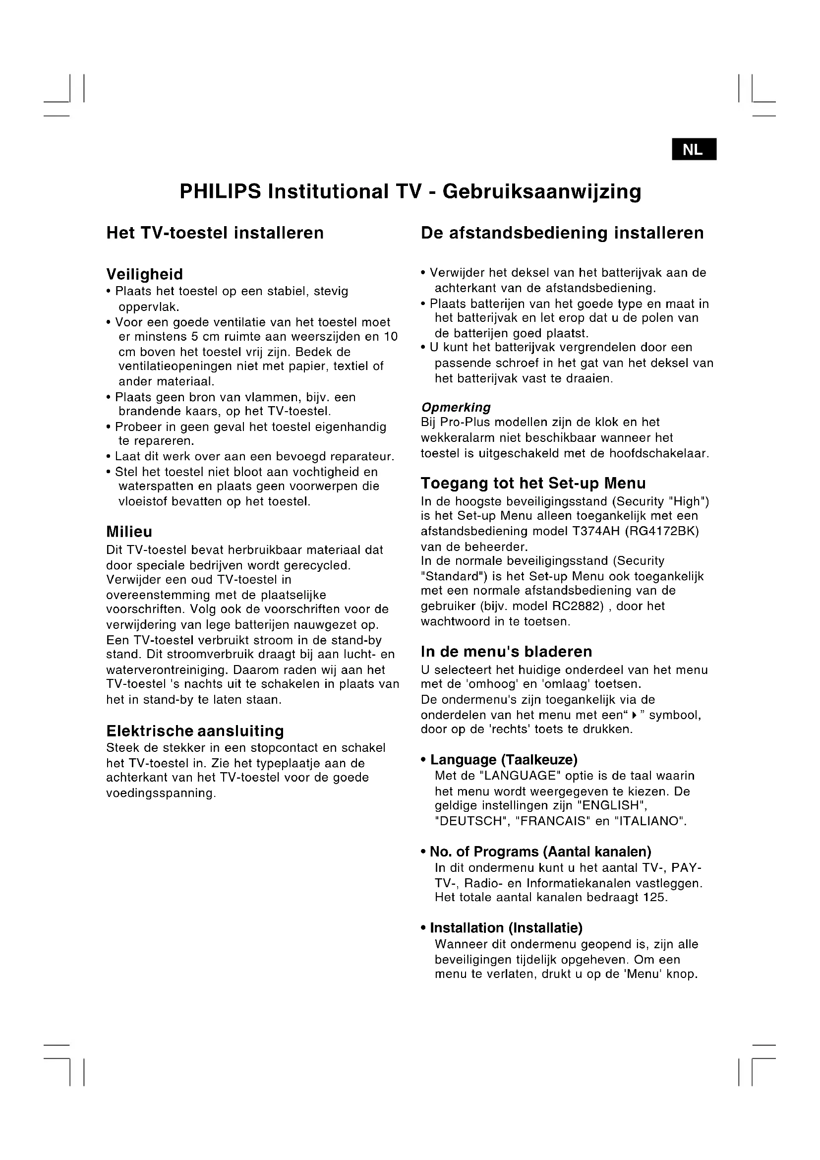 - Verwijder het deksel van het batterijvak aan deachterkant van de afstandsbediening.• Plaats batterijen van het goede type en maat inhet batterijvak en let erop dat u de polen vande batterijen goed plaatst.• U kunt het batterijvak vergrendelen door eenpassende schroef in het gat van het deksel vanhet batterijvak vast te draaien. Opmerking Bij Pro-Plus modellen zijn de klok en hetwekkeralarm niet beschikbaar wanneer hettoestel is uitgeschakeld met de hoofdschakelaar. Toegang tot het Set-up Menu In de hoogste beveiligingsstand (Security "High")is het Set-up Menu alleen toegankelijk met eenafstandsbediening model T374AH (RG4172BK)van de beheerder.In de normale beveiligingsstand (Security"Standard") is het Set-up Menu ook toegankelijkmet een normale afstandsbediening van degebruiker (bijv. model RC2882) , door hetwachtwoord in te toetsen. In de menu's bladeren U selecteert het huidige onderdeel van het menumet de 'omhoog' en 'omlaag' toetsen.De ondermenu's zijn toegankelijk via deonderdelen van het menu met een“"” symbool,door op de 'rechts' toets te drukken.