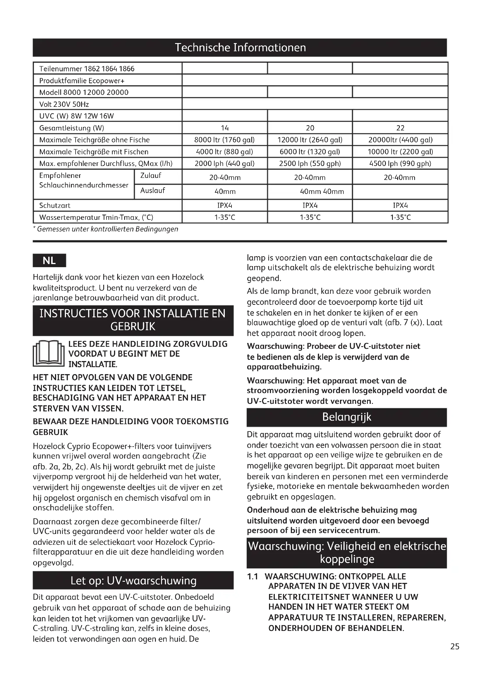 Opslag in de winter Als de unit niet in gebruik is, moet deze worden verwijderd, grondig worden gewassen en gereinigd, gedroogd en opgeslagen in een droge, vorstvrije omgeving. Plaats tijdens opslag het deksel niet op de pompeenheid, zodat de pompeenheid voldoende wordt geventileerd en gedroogd. Contact / Reserveonderdelen Voor productadvies en onderdelen kunt u contact opnemen met Hozelock Cyprio Consumentenafdeling (0121 313 1122) of ga naar www.hozelock.com Hozelock Cyprio Clearwater-garantie WIJ GARANDEREN HELDER WATER OF UW GELD TERUG voor een Hozelock Cyprio Ecopower+ als deze met de juiste pomp wordt gebruikt. OPMERKING: IN ENKELE GEVALLEN KAN HET TOT