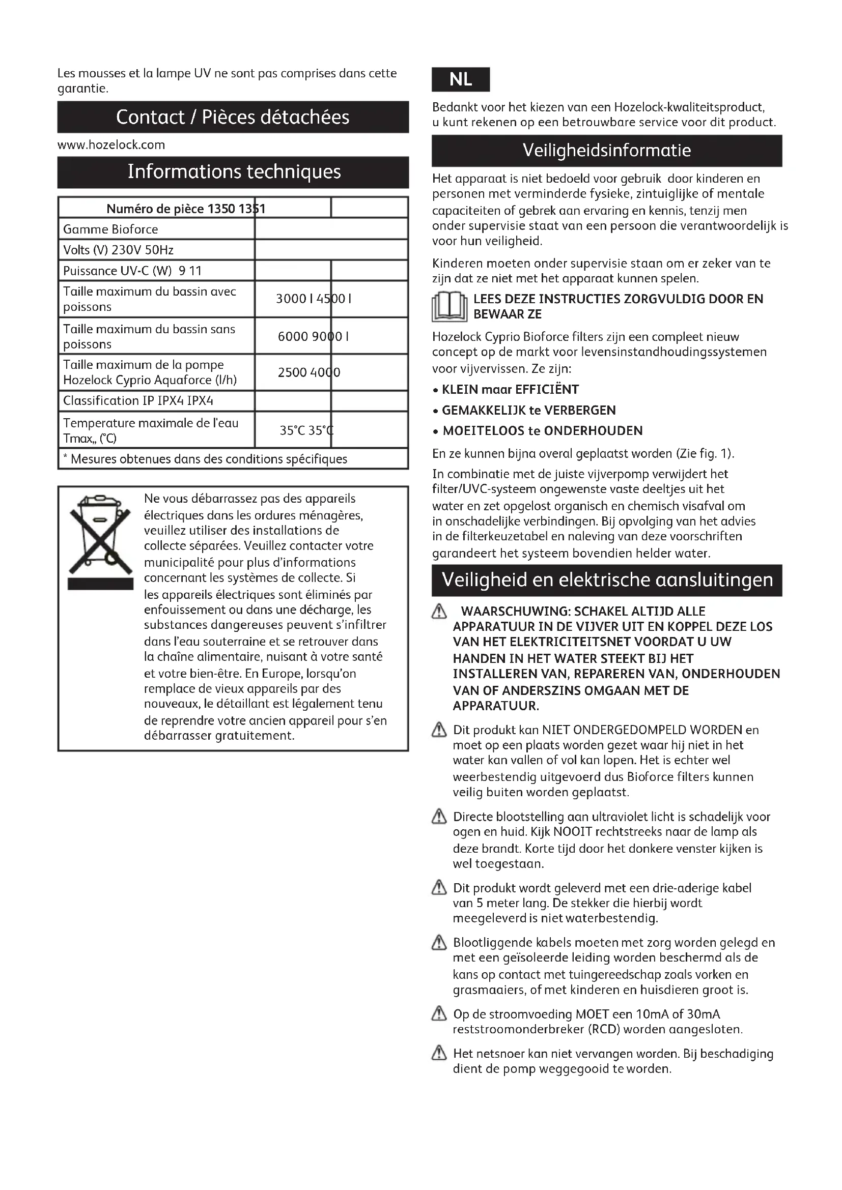 VANOFANDERSZINSOMGAANMETDE APPARATUUR. Dit produkt kan NIET ONDERGEDOMPELD WORDEN en moet op een plaats worden gezet waar hij niet in het water kan vallen of vol kan lopen. Het is echter wel weerbestendig uitgevoerd dus Bioforce filters kunnen veilig buiten worden geplaatst. Directe blootstelling aan ultraviolet licht is schadelijk voor ogen en huid. Kijk NOOIT rechtstreeks naar de lamp als deze brandt. Korte tijd door het donkere venster kijken is wel toegestaan. Dit produkt wordt geleverd met een drie-aderige kabel van 5 meter lang. De stekker die hierbij wordt meegeleverd is niet waterbestendig. Blootliggende kabels moeten met zorg worden gelegd en met een geïsoleerde leiding worden beschermd als de kans op contact met tuingereedschap zoals vorken en grasmaaiers, of met kinderen en huisdieren groot is. Op de stroomvoeding MOET een 10mA of 30mA reststroomonderbreker (RCD) worden aangesloten. Het netsnoer kan niet vervangen worden. Bij beschadiging dient de pomp weggegooid te worden.De installatie moet voldoen aan de nationale en europese richtlijnen voor elektronische aparatuur. Onder deze richtlijnen valt de gegoten bekabeling en het gebruik van plastic of metaal in de bekabeling. Als er enige twijfel bestaat over de bekabeling naar de stroomvoeding dient u direct contact op te nemen met een gekwalificeerde electriciën van de betreffende plaatselijke autoriteiten. Als de inrichting niet het hele jaar door draait, moet u deze beschermen tegen bevriezing. In koud winterweer (als de vissen niet actief zijn en de groei van algen is gestopt) kan de eenheid worden uitgeschakeld. Deze moet dan worden leeggepompt en worden verwijderd en worden opgeslagen op een droge, vorstvrije plaats. Het juiste systeem bepalen In de filterkeuzetabel aan de ommezijde worden algemene richtlijnen gegeven voor het kiezen van de pomp, het filter en de slangdiameter voor tuinvijvers tot 9000 liter. Voor optimale resultaten moet echter ook rekening worden gehouden met de volgende conditiefactoren. Diepte Hozelock Cyprio raadt een minimale diepte van 1,2 meter aan voor koivijvers. Voor een vijver met een gemiddelde diepte van minder dan 0,75m is de conditie +25%. (Ondiepe vijvers worden volledig verlicht door het zonlicht en worden daardoor snel warm. Hierdoor is er meer kans op algengroei.) Plaats De plaats waar een vijver ligt bepaalt de hoeveelheid zonlicht of schaduw die een vijver ontvangt. Vijvers die de hele dag in de volle zon liggen, hebben een conditie van +25%. Klimaat Het klimaat beïnvloed de watertemperatuur, de activiteitsgraad van de vissen en voedingsvereisten. Hoe actiever de vis is hoe meer er van het filter wordt gevraagd. In hete klimaten (zoals Zuid-Afrika), is de conditie +35%. In gematigde klimaten (zoals Zuid-Europa) is de conditie +15%. In een Noord-Europees klimaat (d.w.z. het grootste deel van Groot-Brittannië) is de conditie +0%. Voorbeeld U heeft een goudvissenvijver van 2200 liter van 0,6 meter diep (omstandigheidsfactor +25%). U woont in Londen - een Noord-Europees klimaat (omstandigheidsfactor +0%). De vijver is volledig blootgesteld aan zonlicht (+25%). Het effectieve volume van uw vijver is daardoor toegenomen met 50% (25% + 25%), en u moet daarom uw uitrusting instellen op een vijver van 3500 liter. Installatie